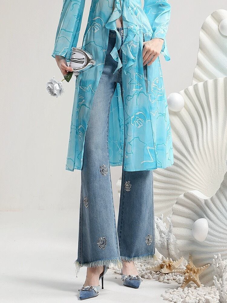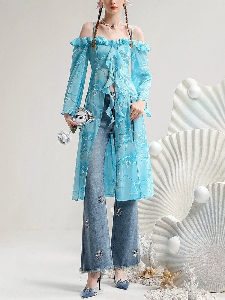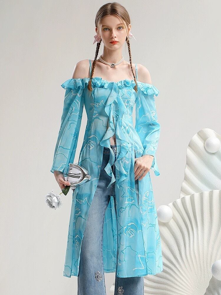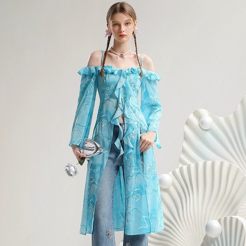水色 オフショルダー シースルー カーディガン ジャケット ワンピース ブラウス カーディガン