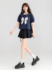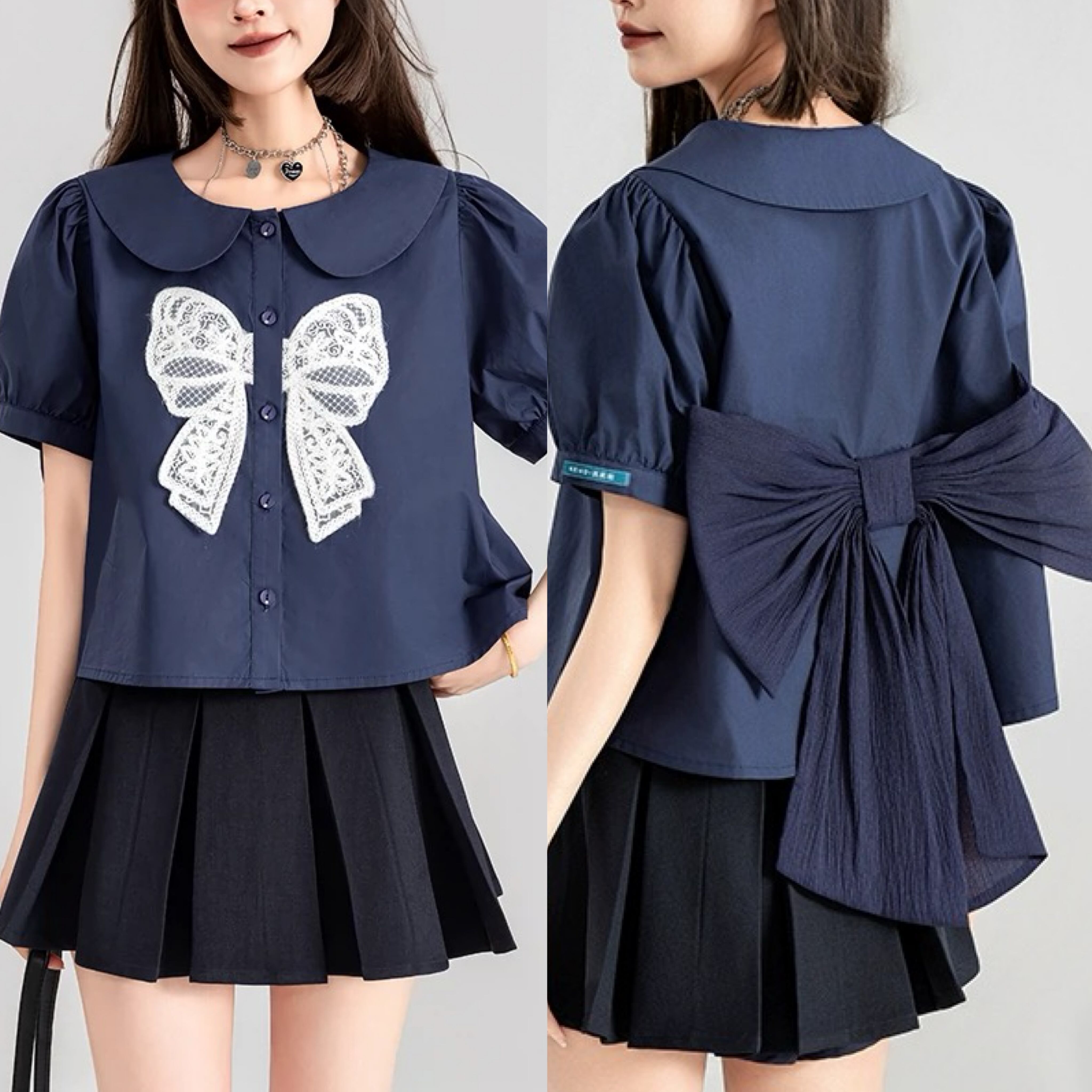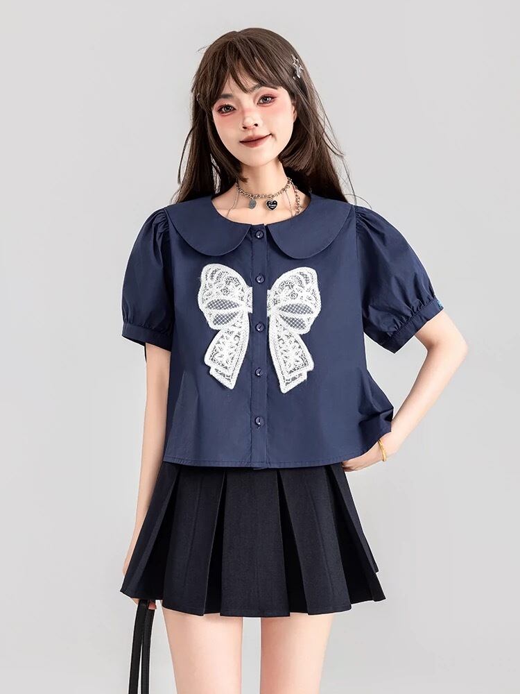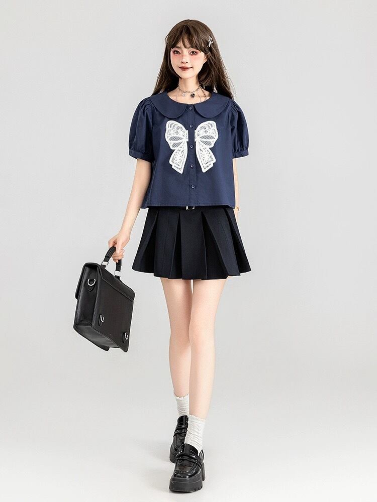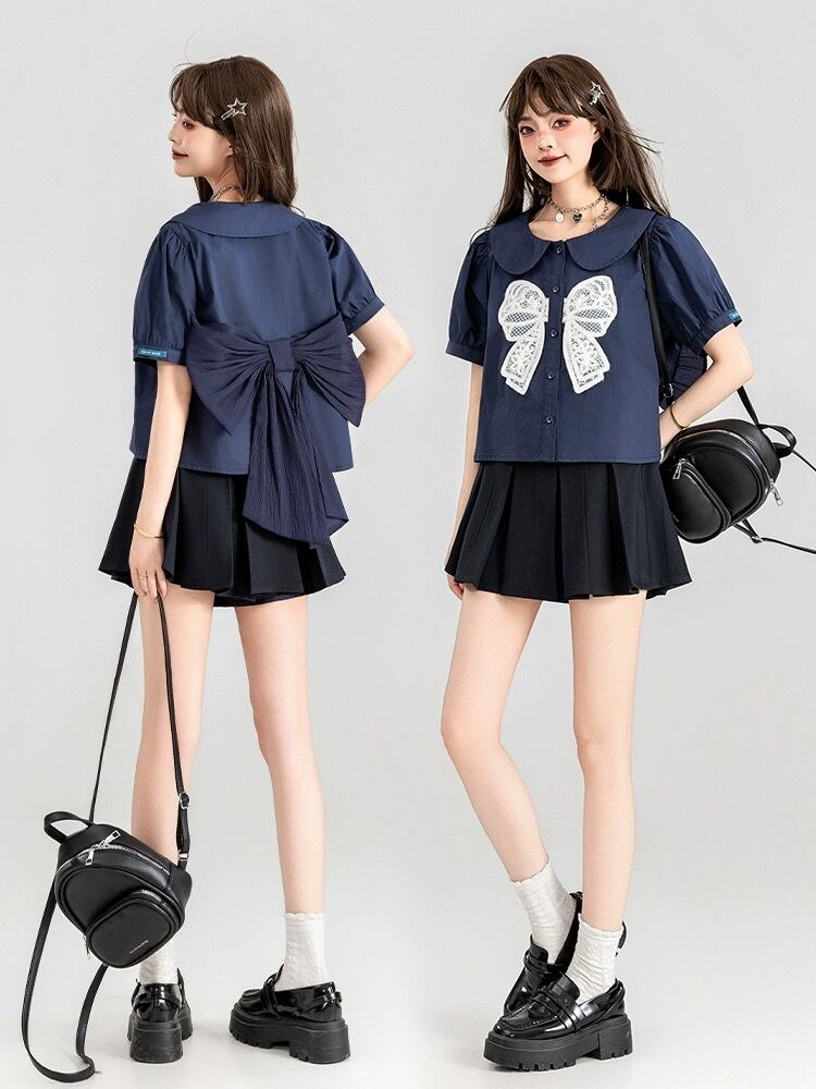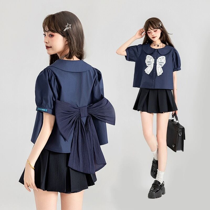 ブラウス リボン ガーリー ネイビー シンプル 可愛い トップス