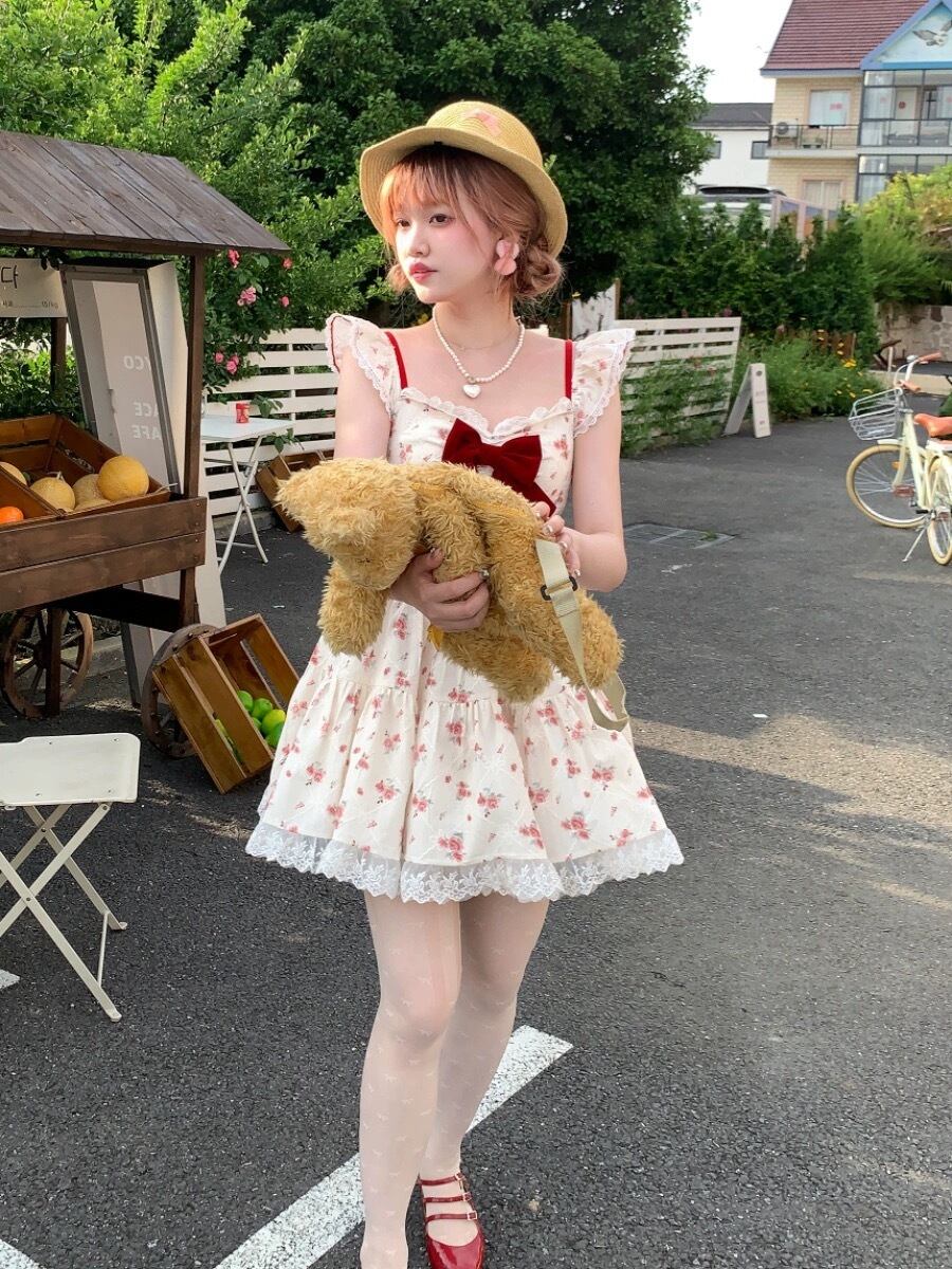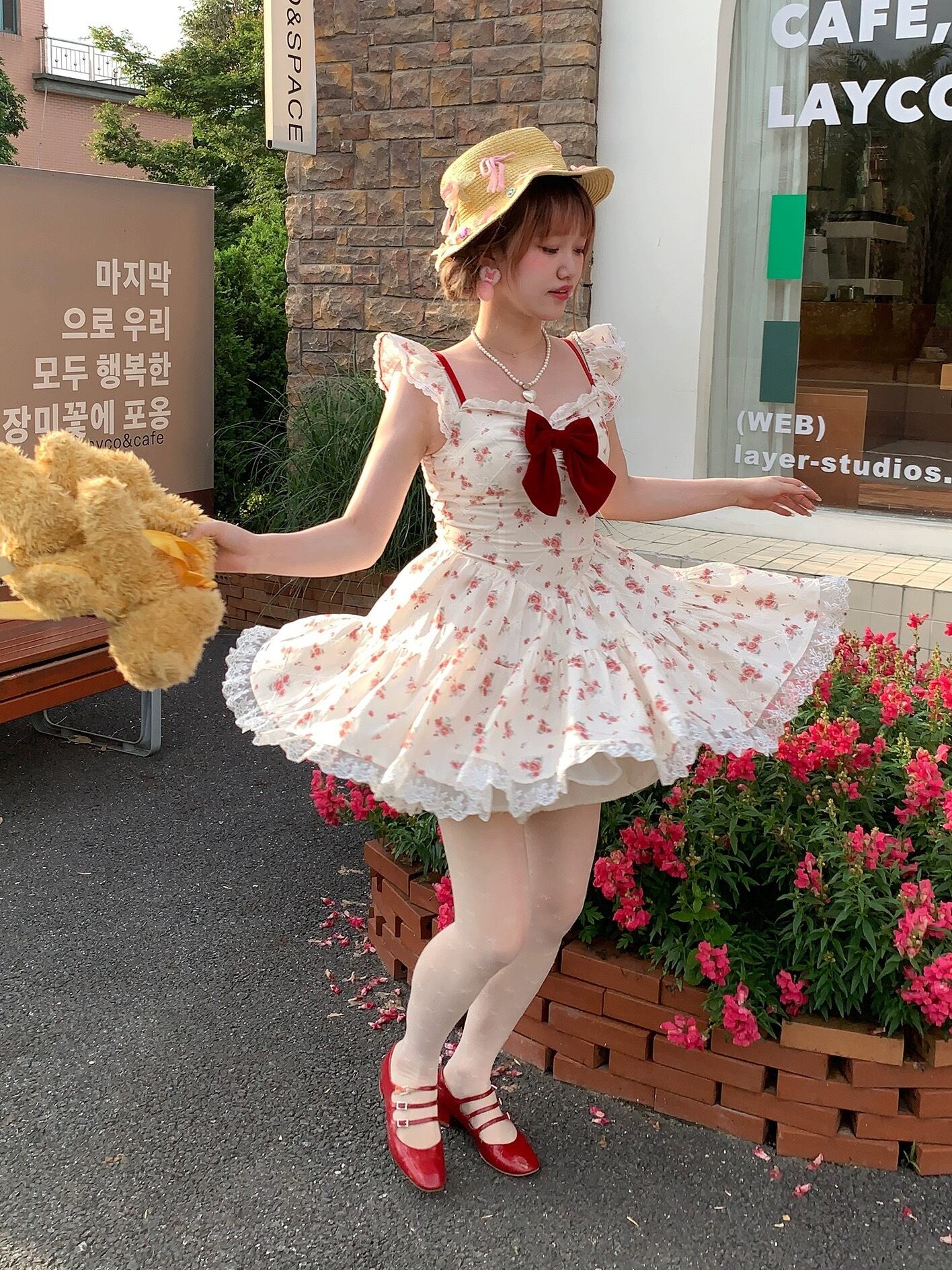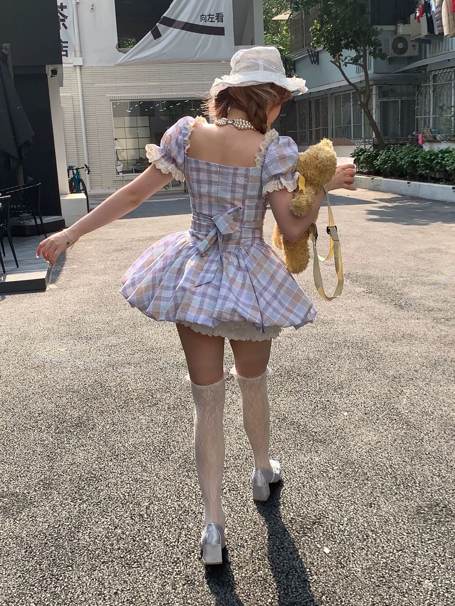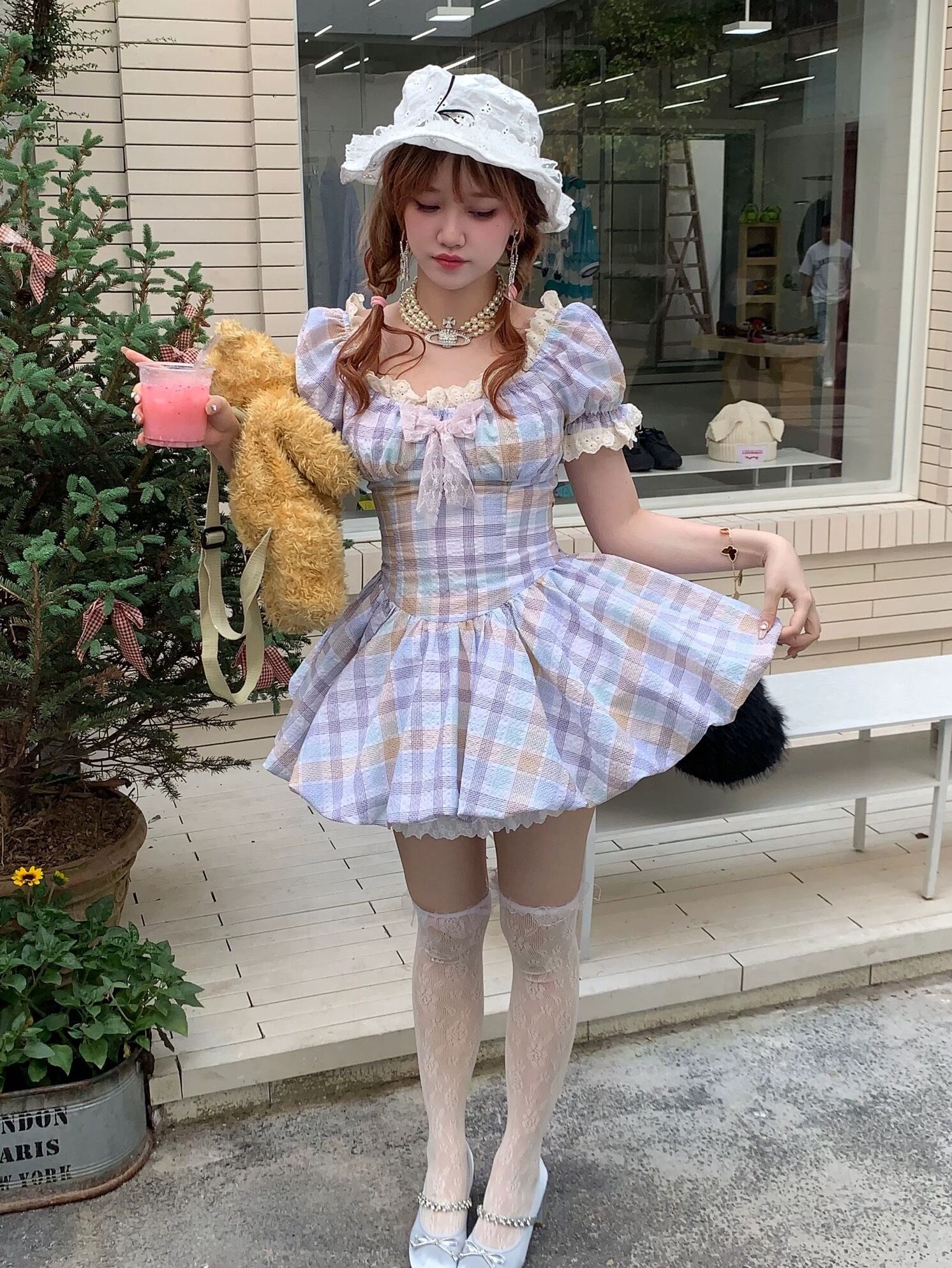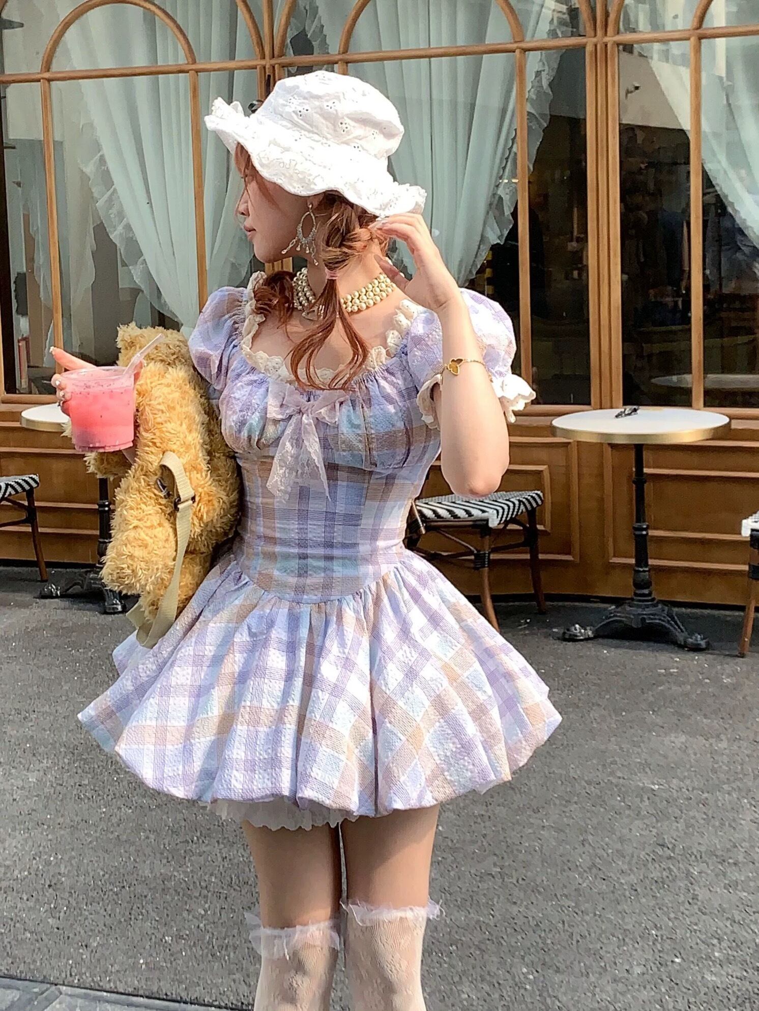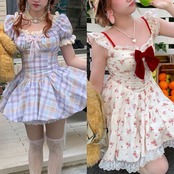 ガーリー 赤 リボン 紫 チェック ワンピース 可愛い