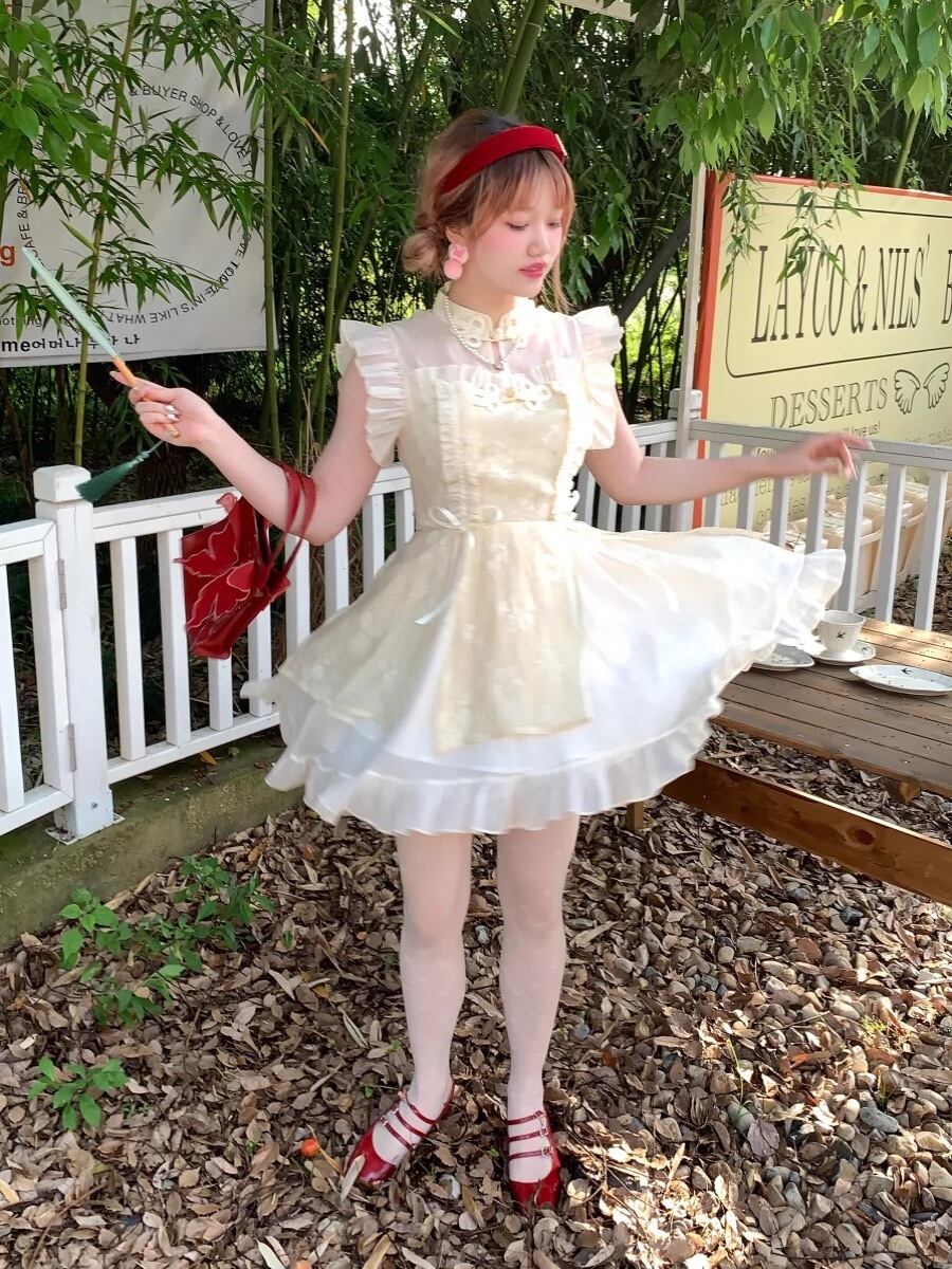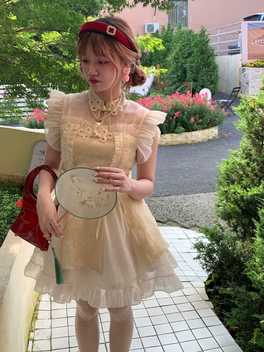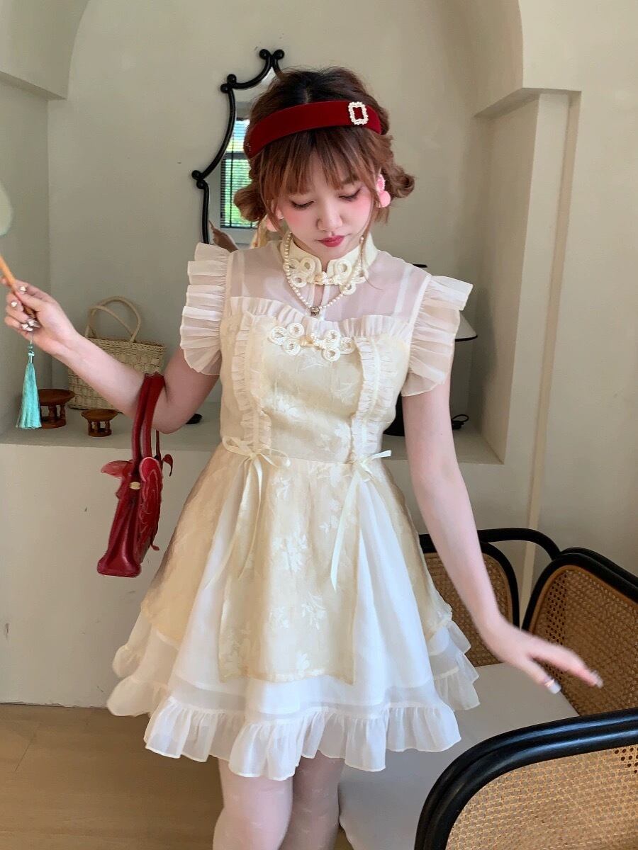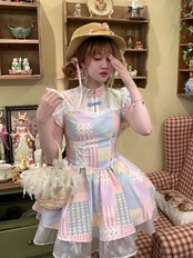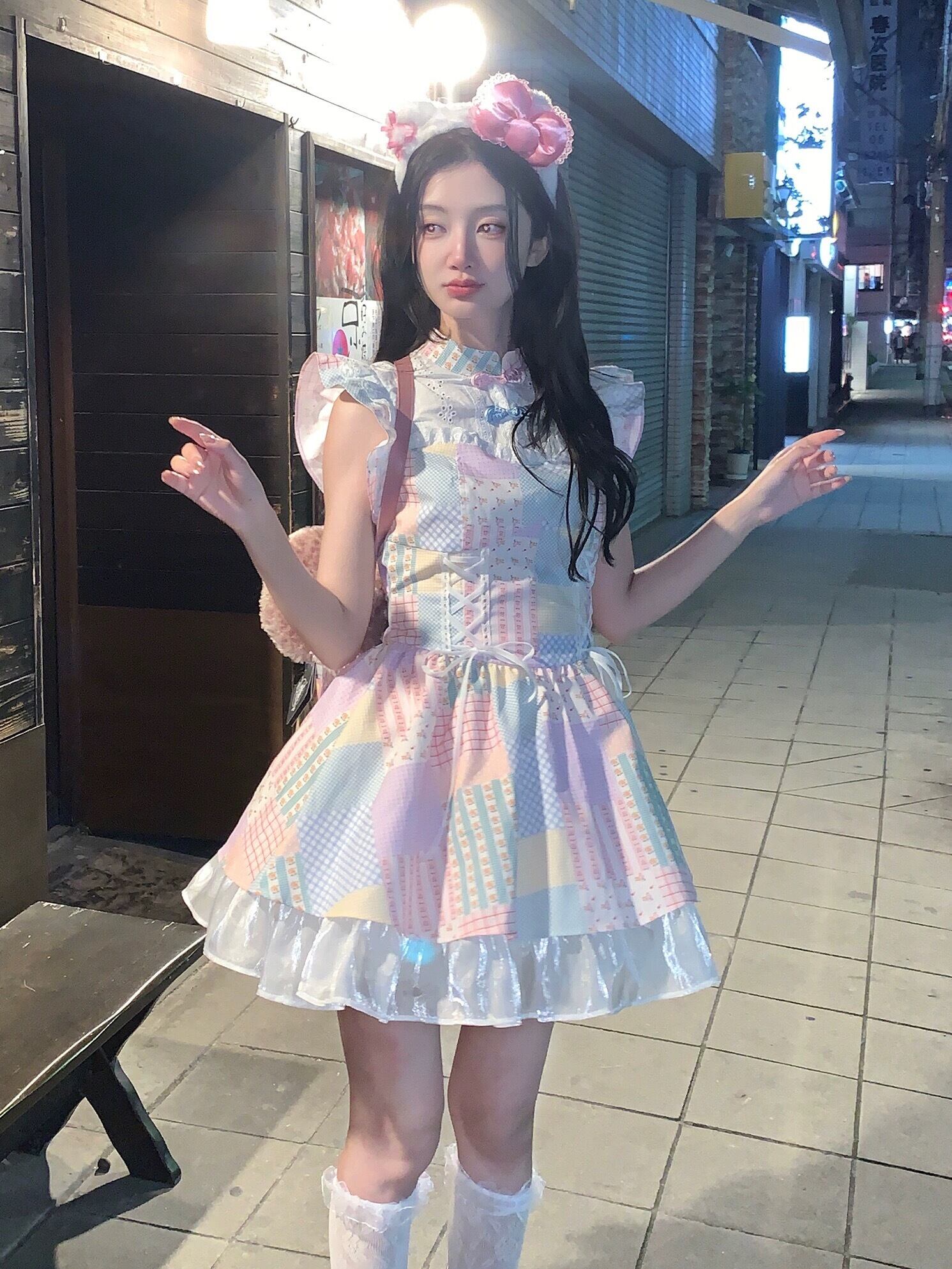 チャイナ カラフル ピンク チェック アイボリー ガーリー ワンピース