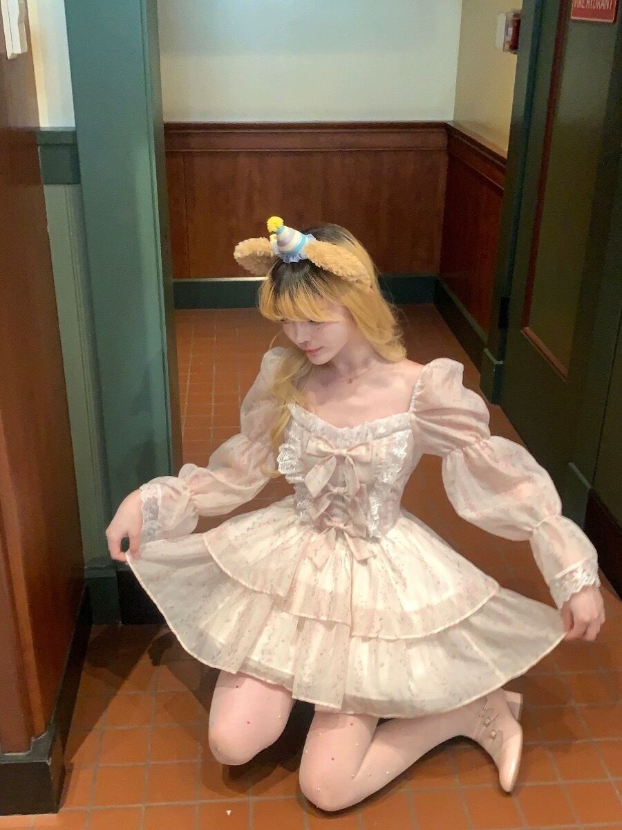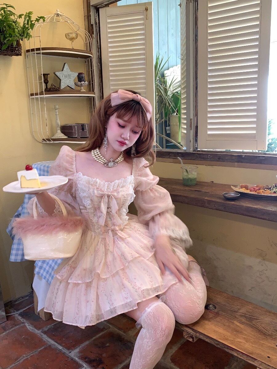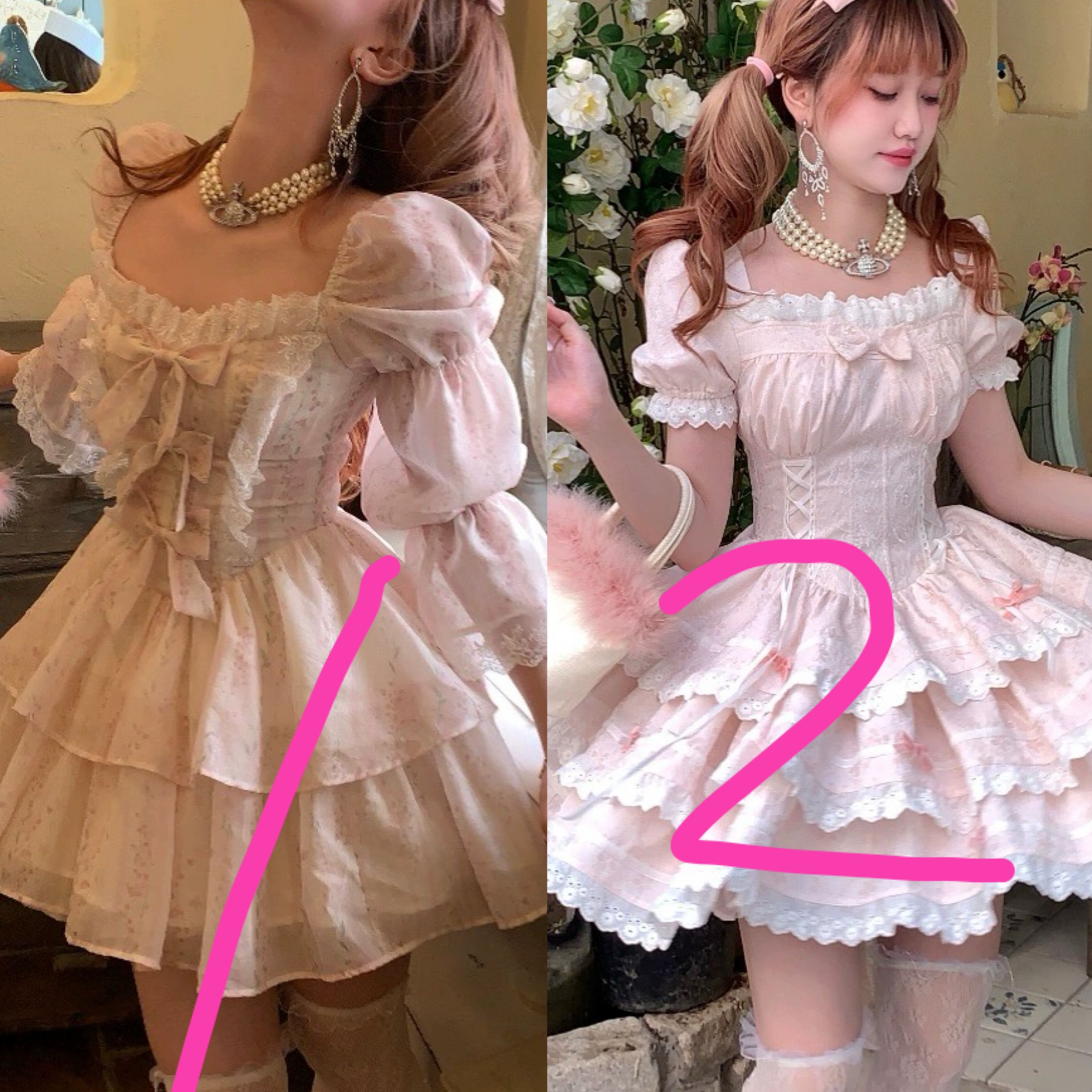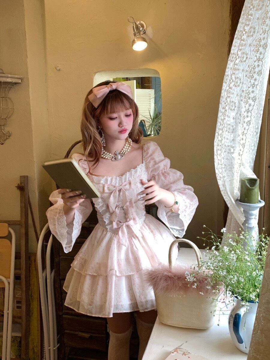 ピンク ベージュ リボン ガーリー ワンピース 可愛い ブラウス