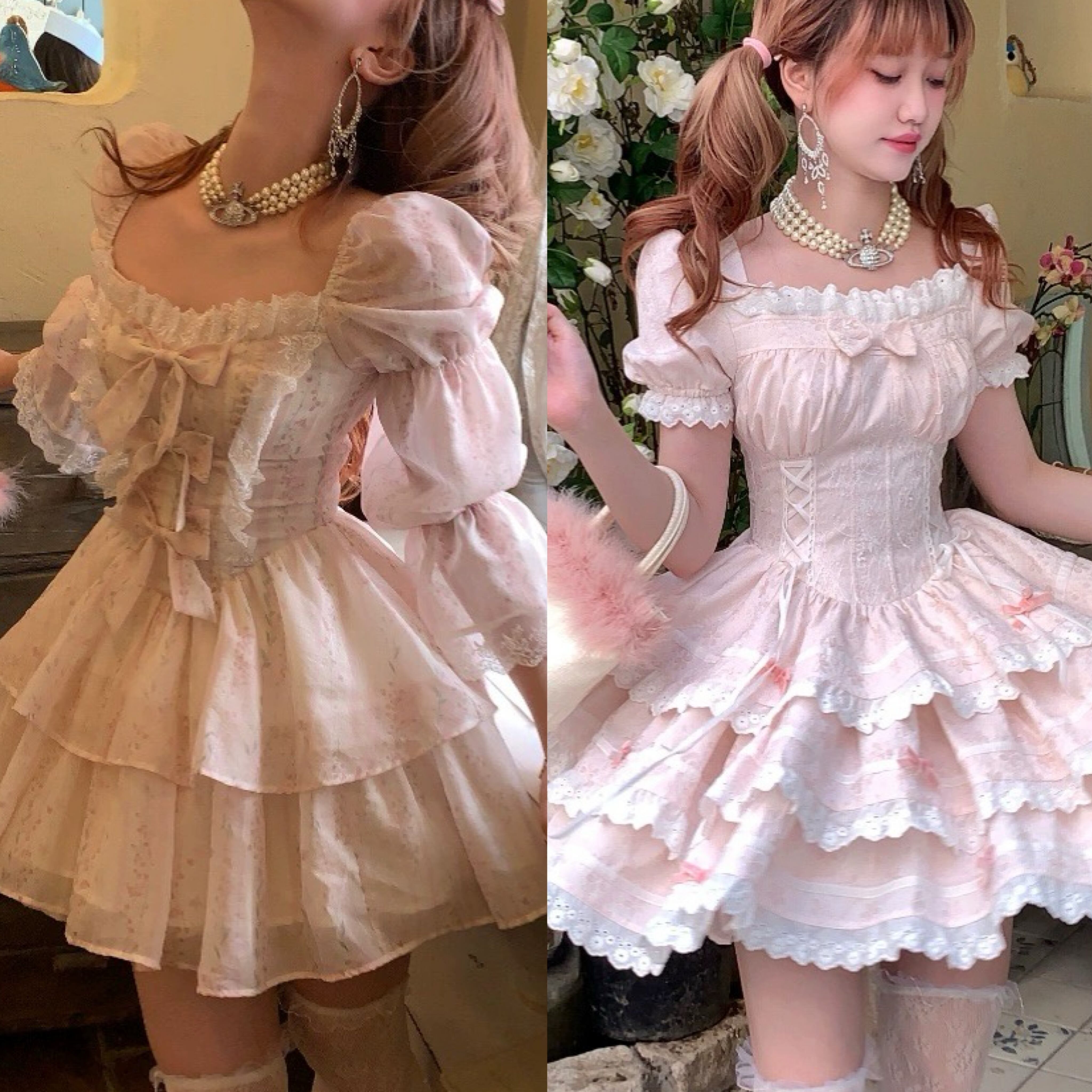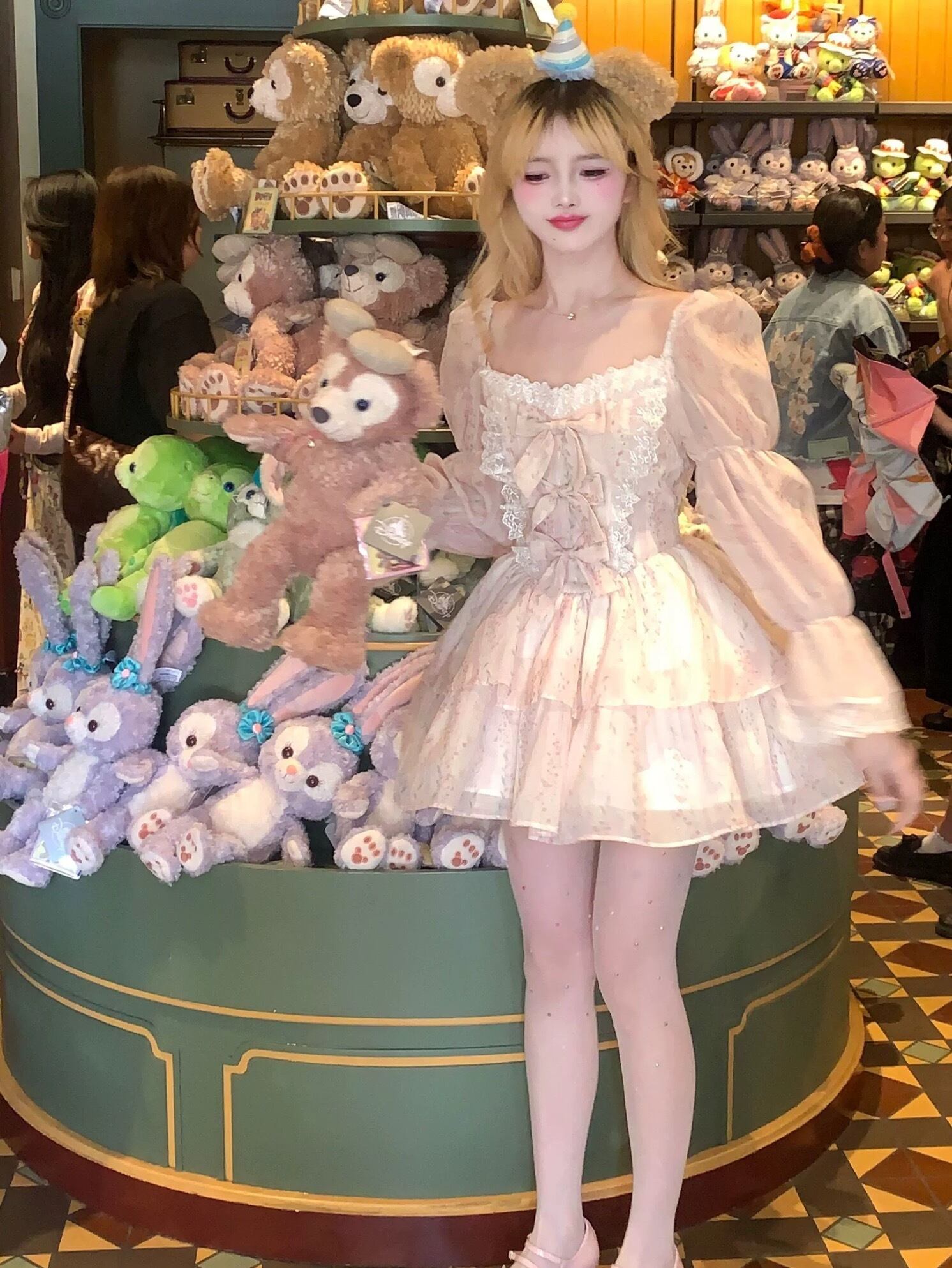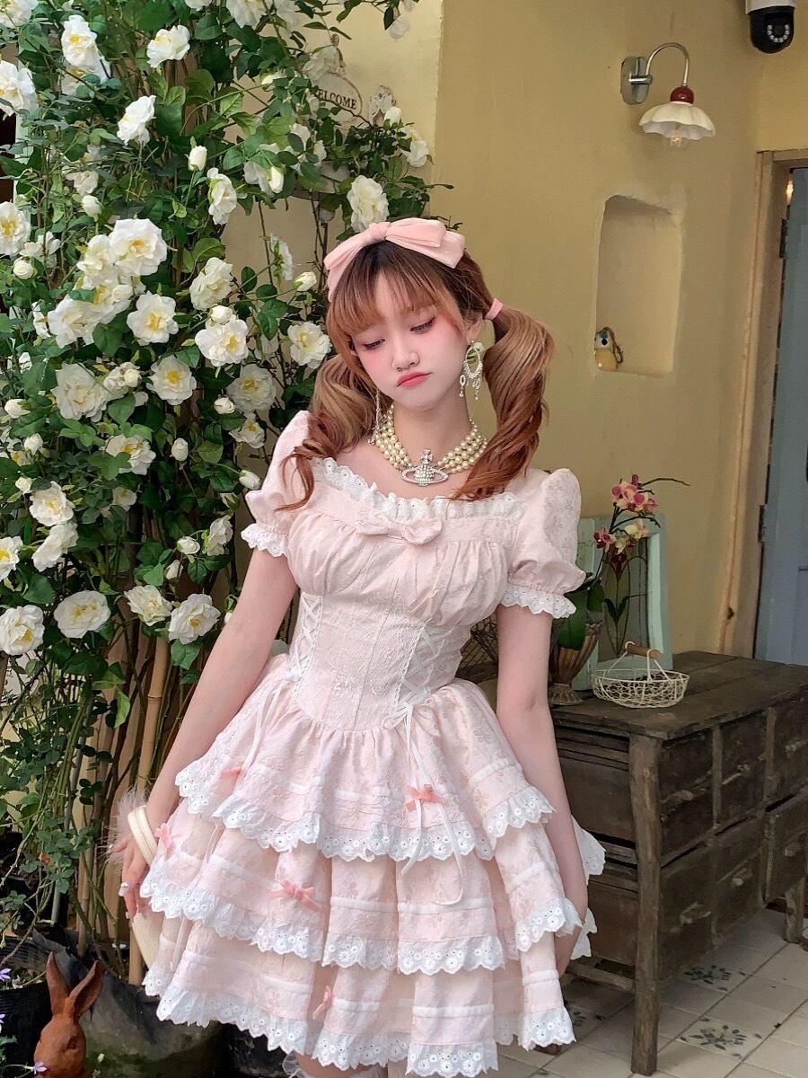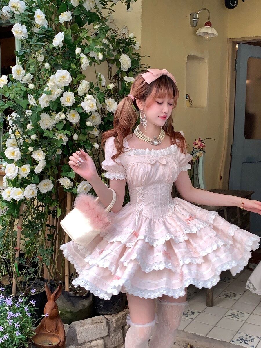 ピンク ベージュ リボン ガーリー ワンピース 可愛い ブラウス