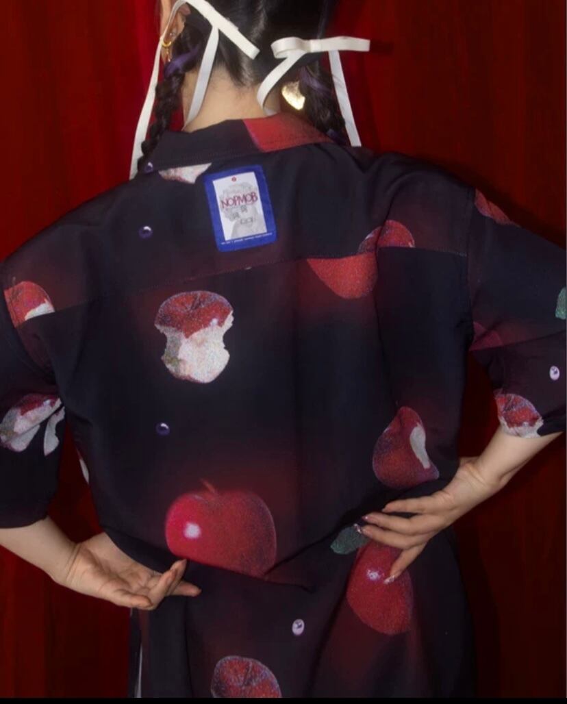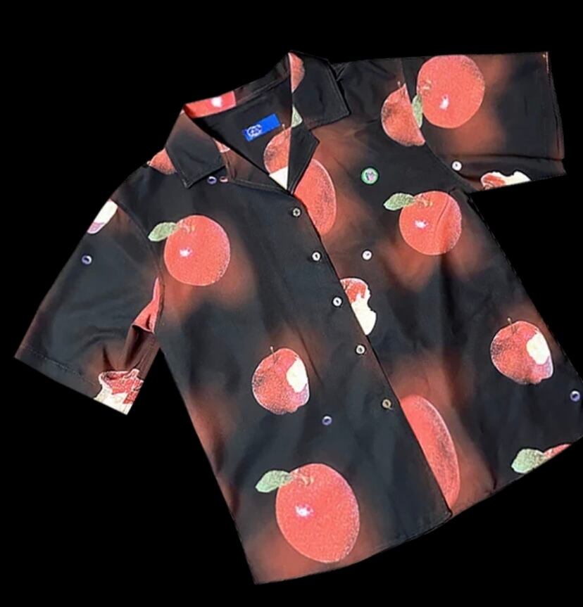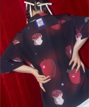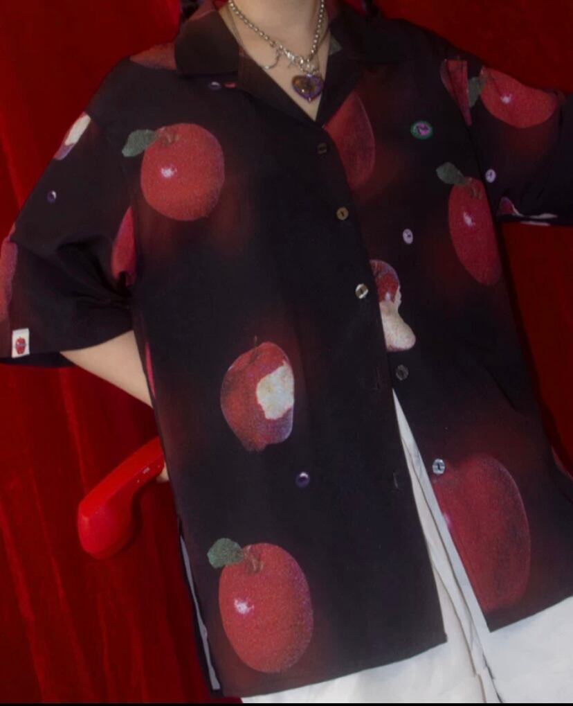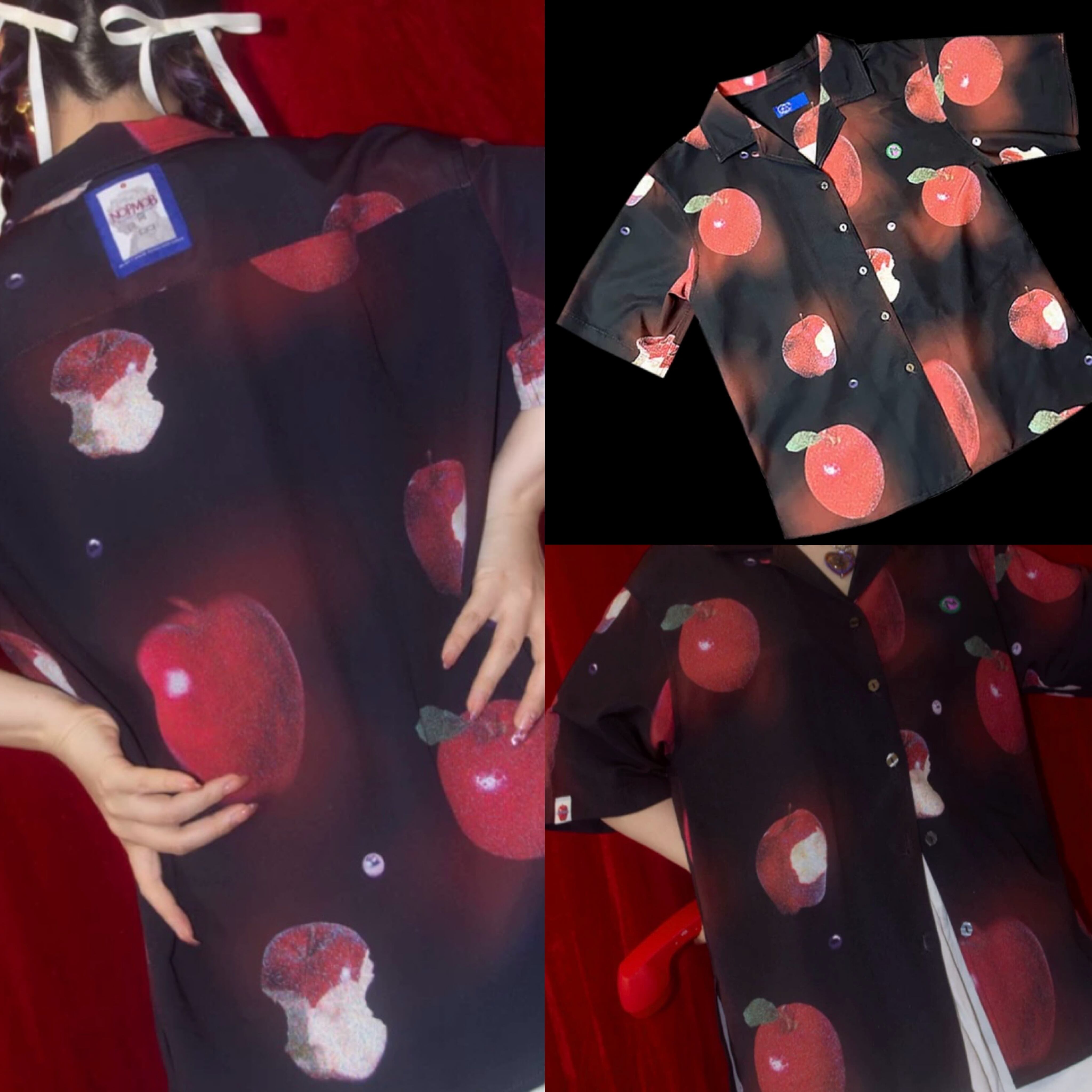 黒 ブラウス シャツ 赤 りんご フルーツ シャツ トップス