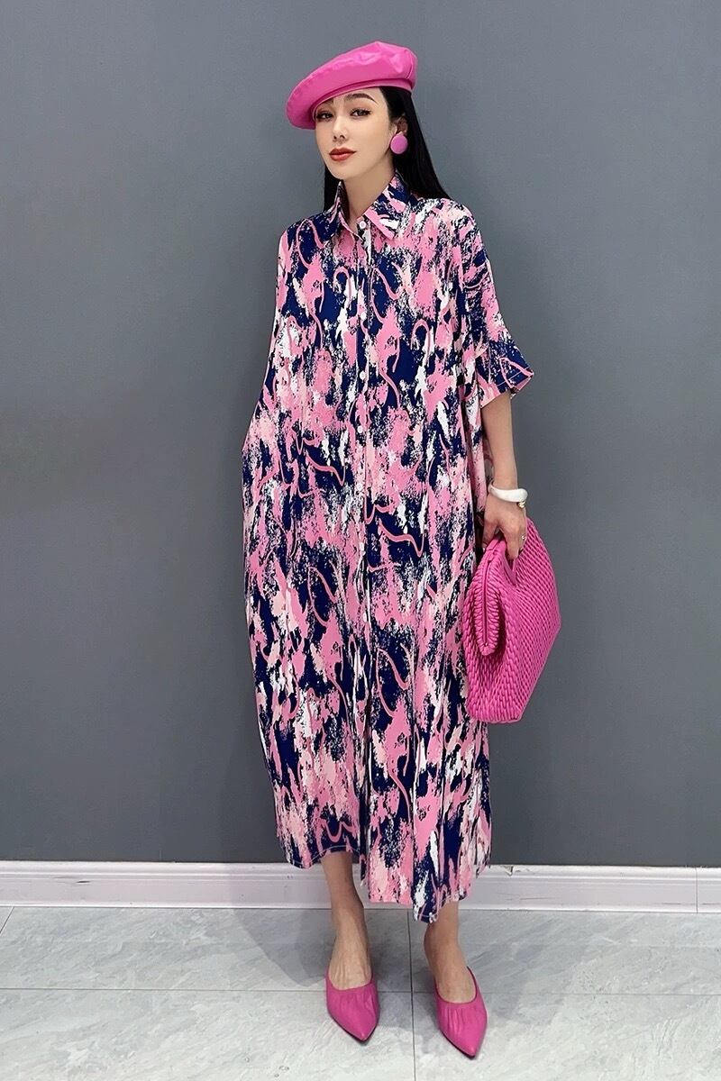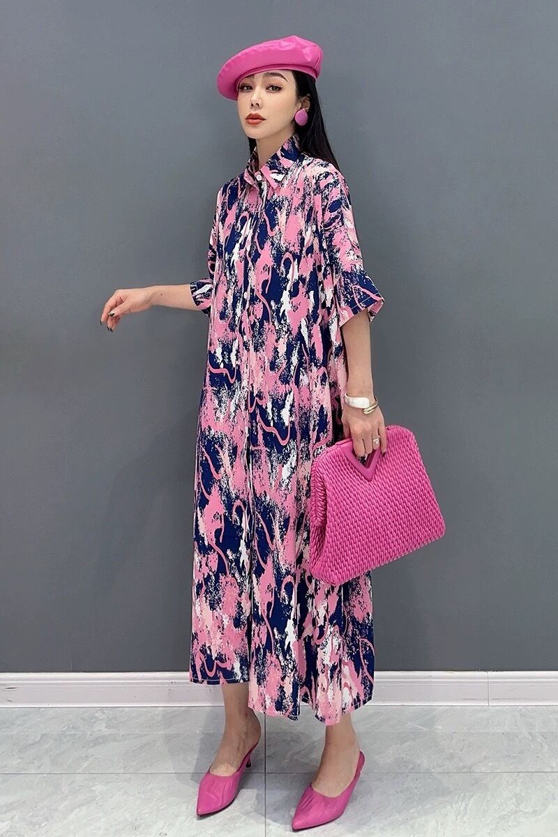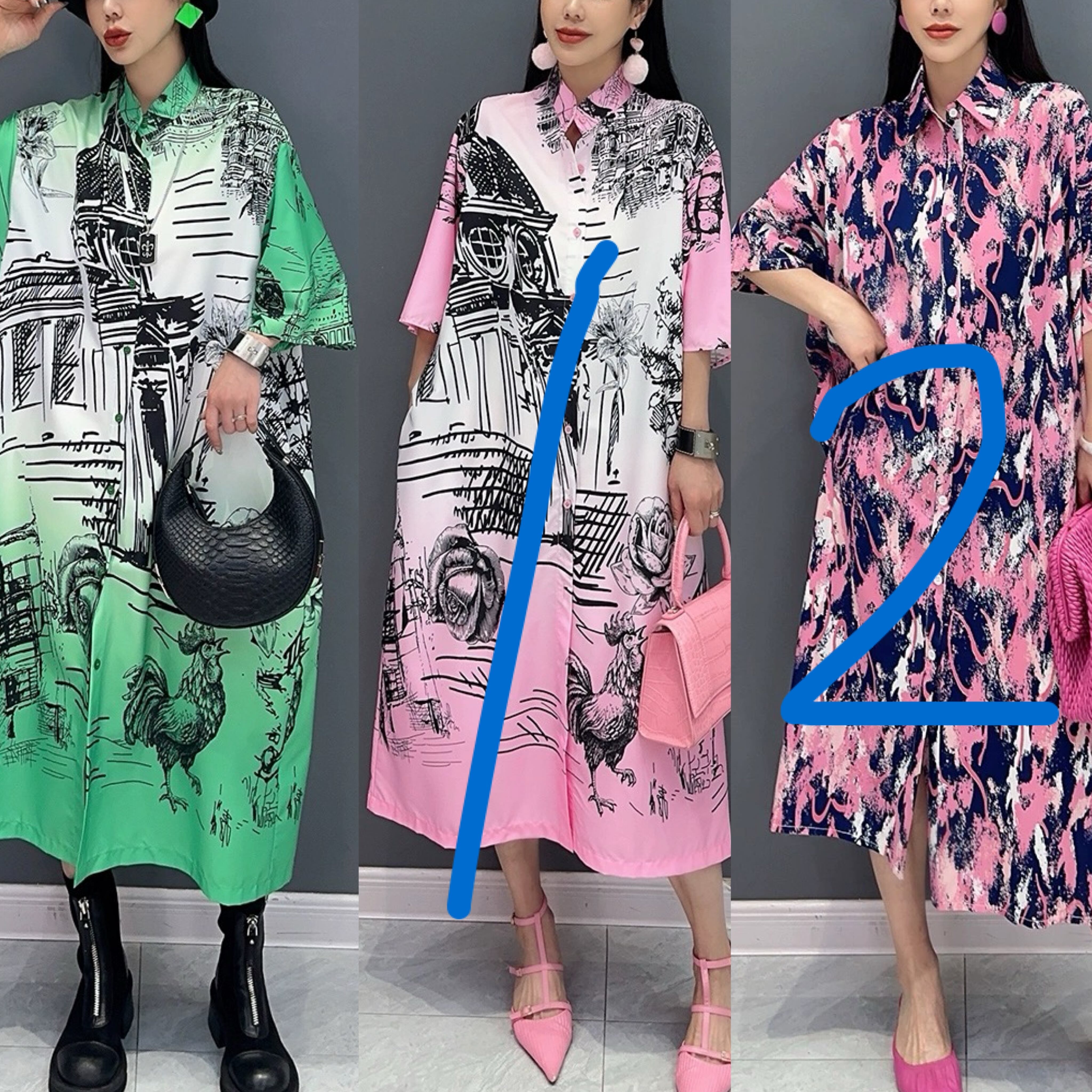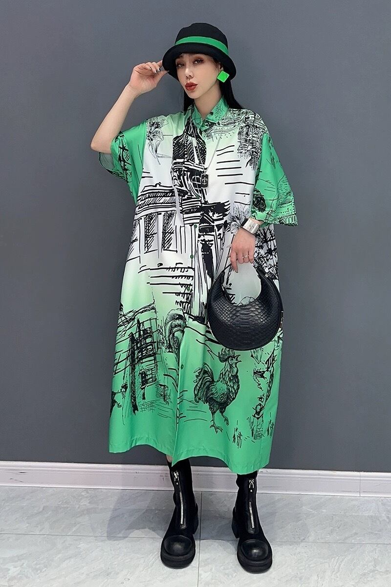 緑 ピンク ブラウス カジュアル ワンピース 落書き レオパード 柄