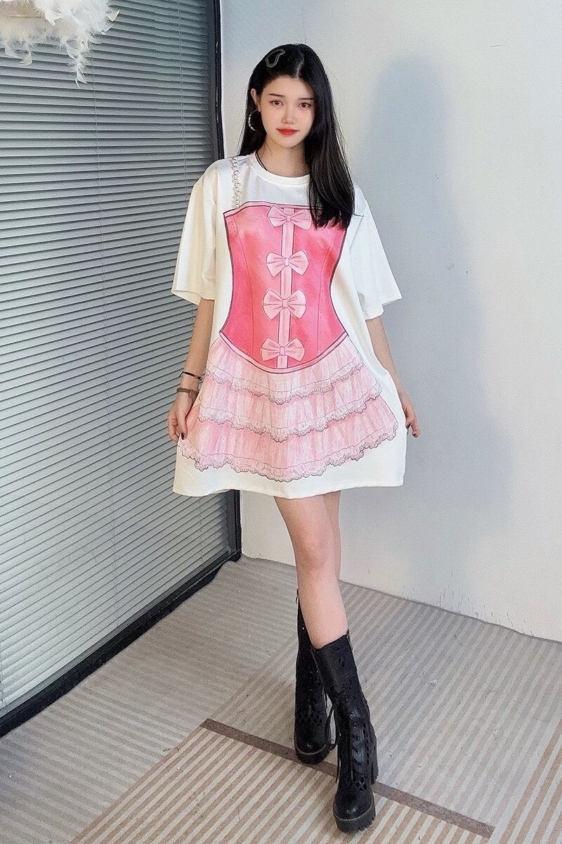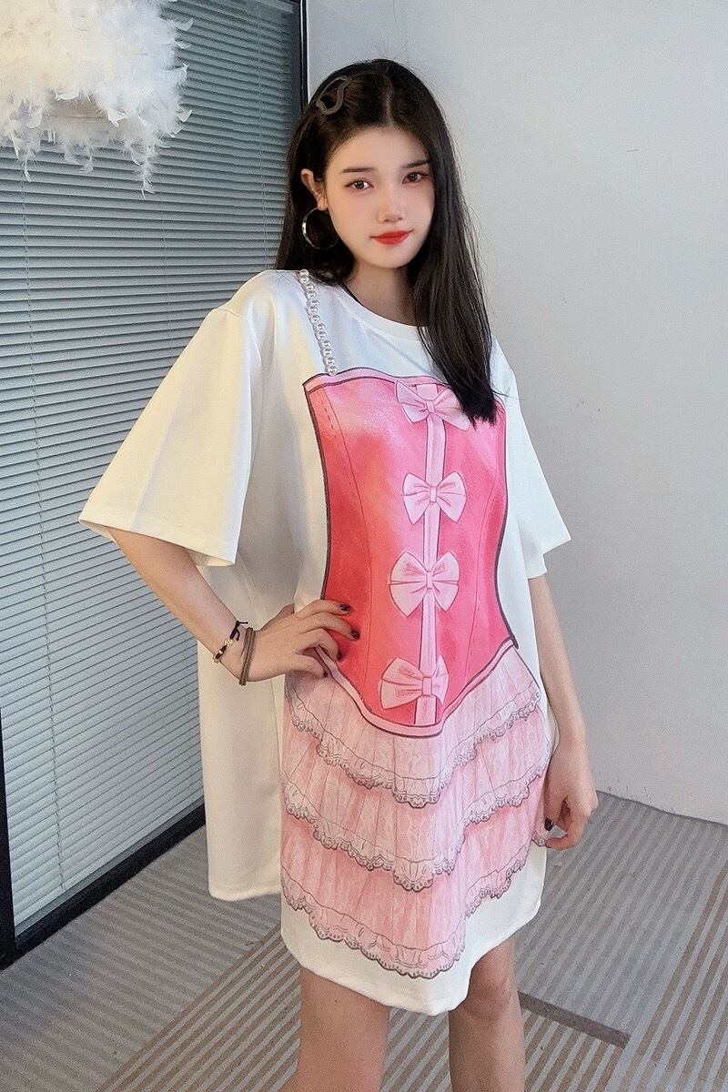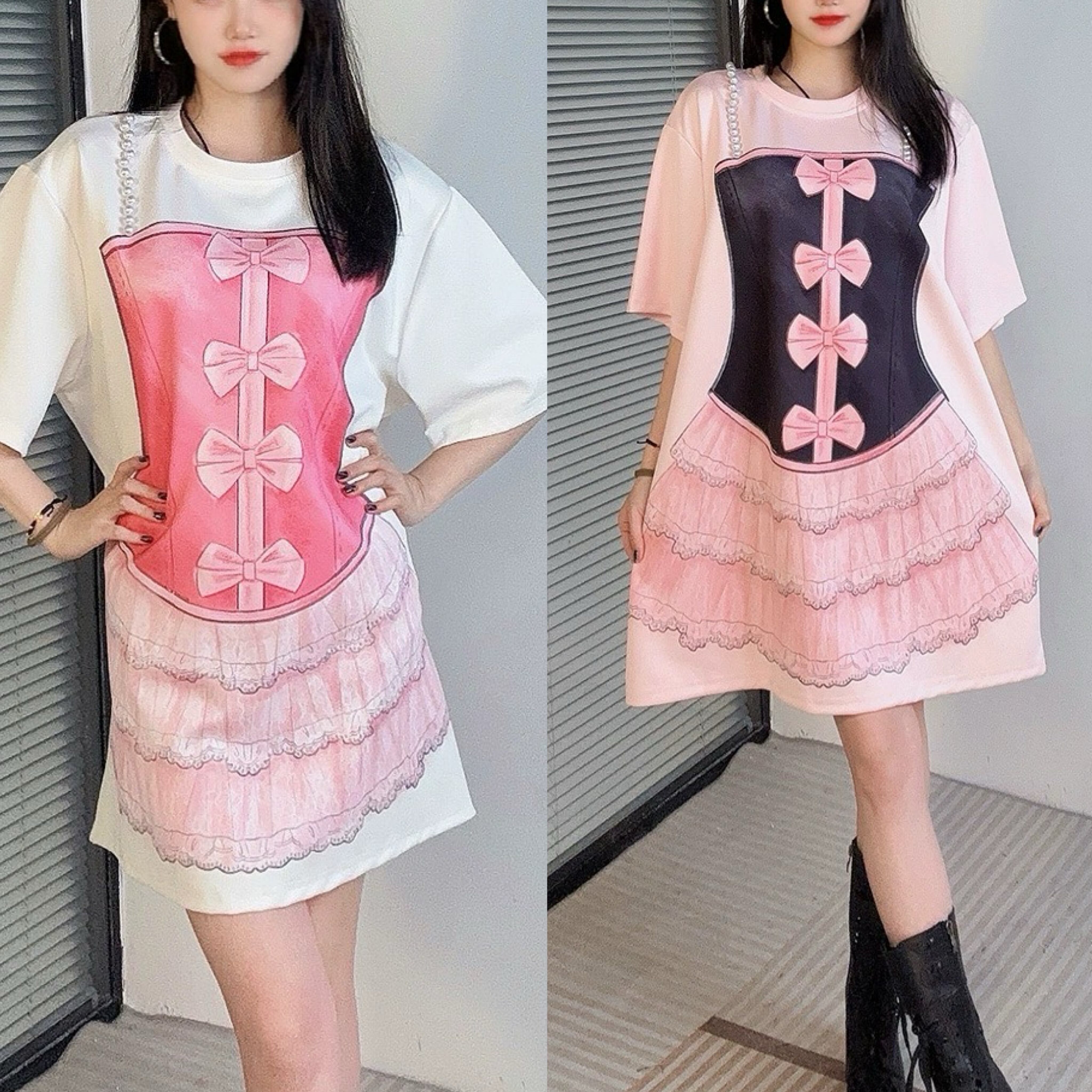 騙し絵 ドレス ピンク 黒 リボン ワンピース ガーリー