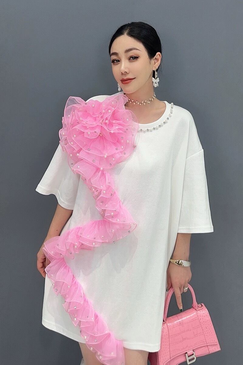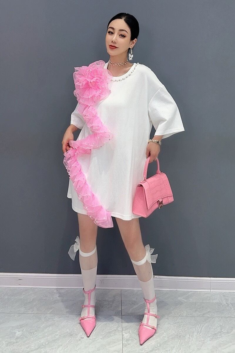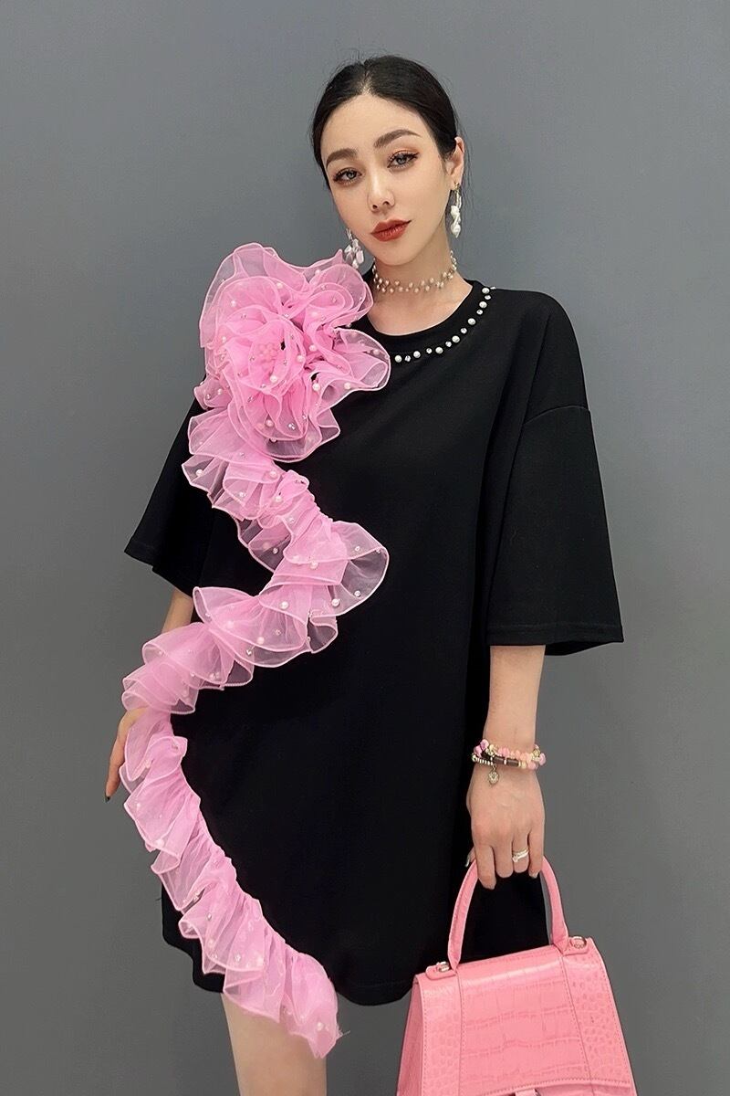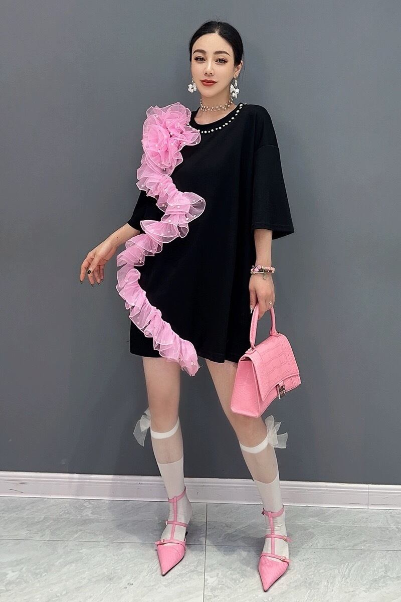ピンク リボン カジュアル フリル 黒 Tシャツ ワンピース