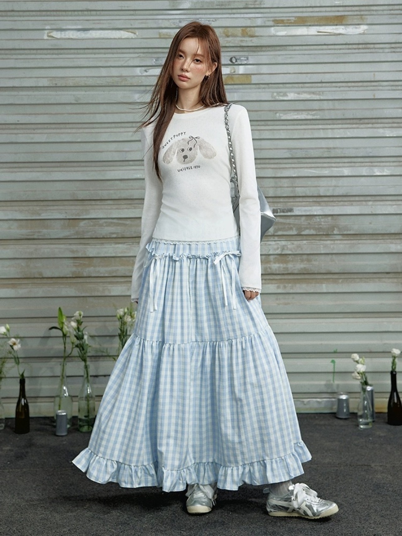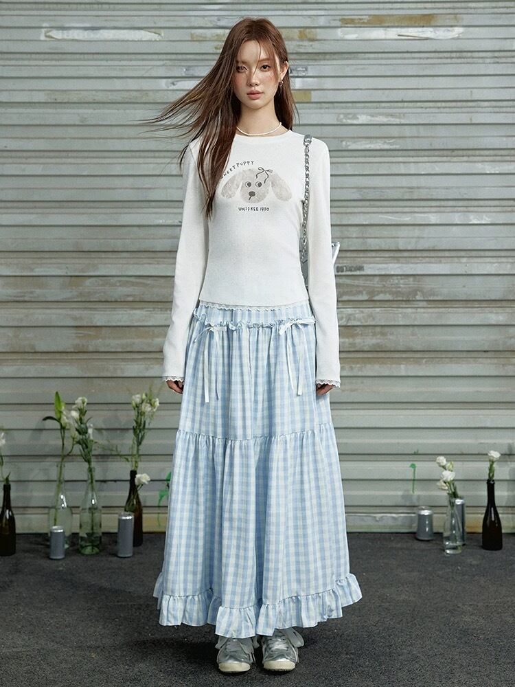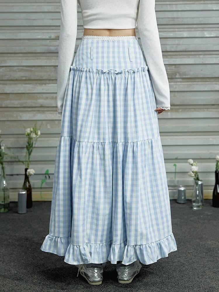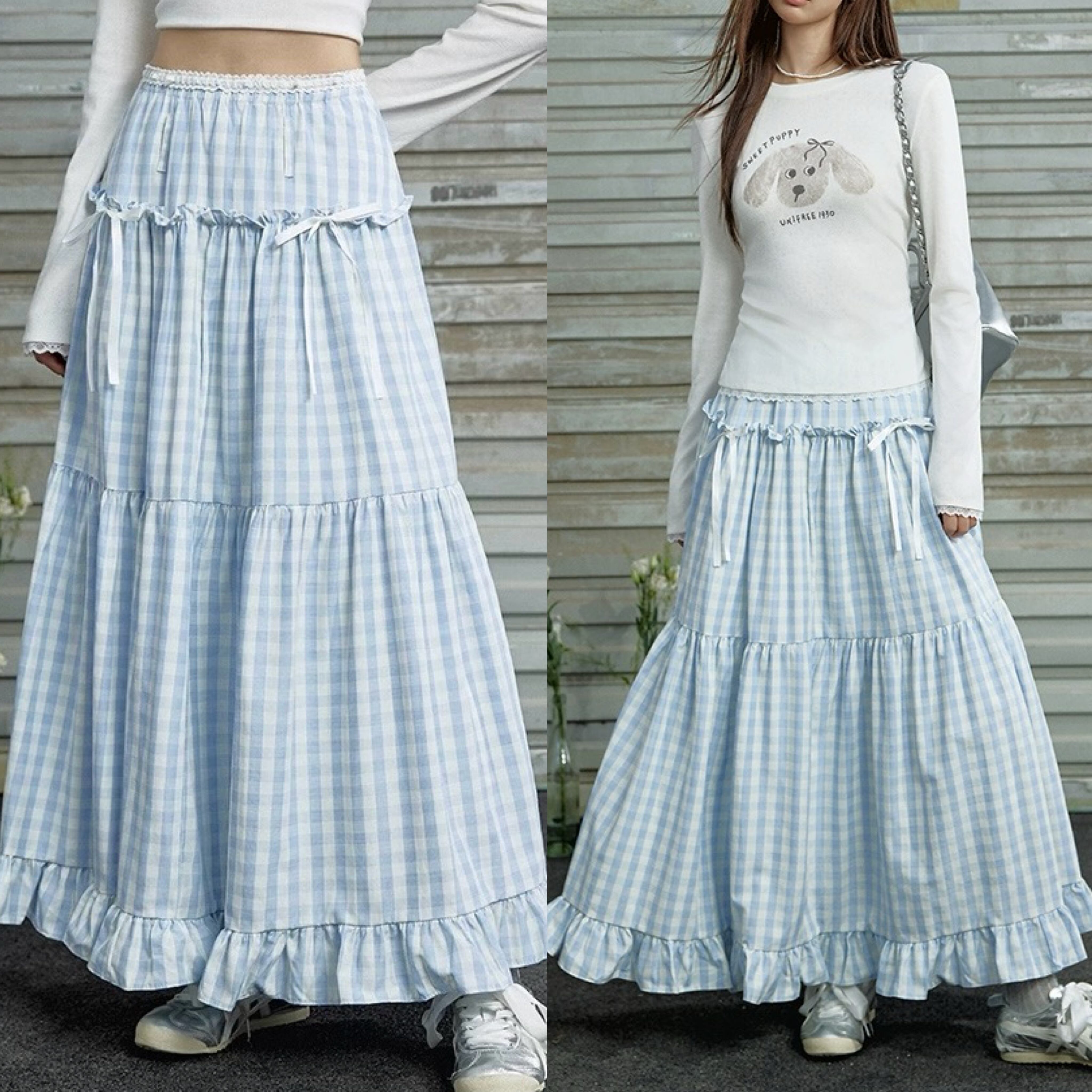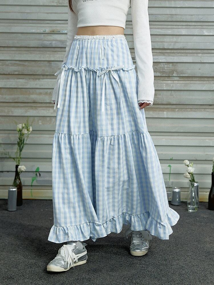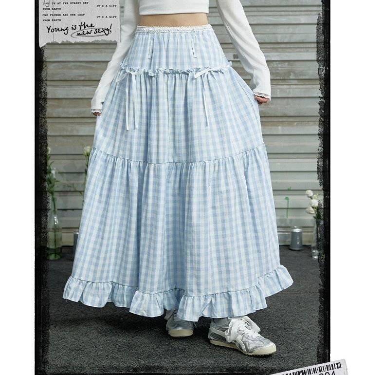 水色 チェック マキシ フレア リボン スカート ガーリー