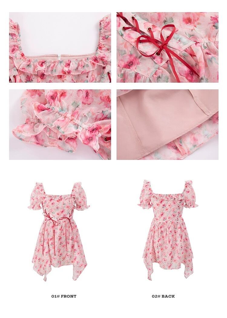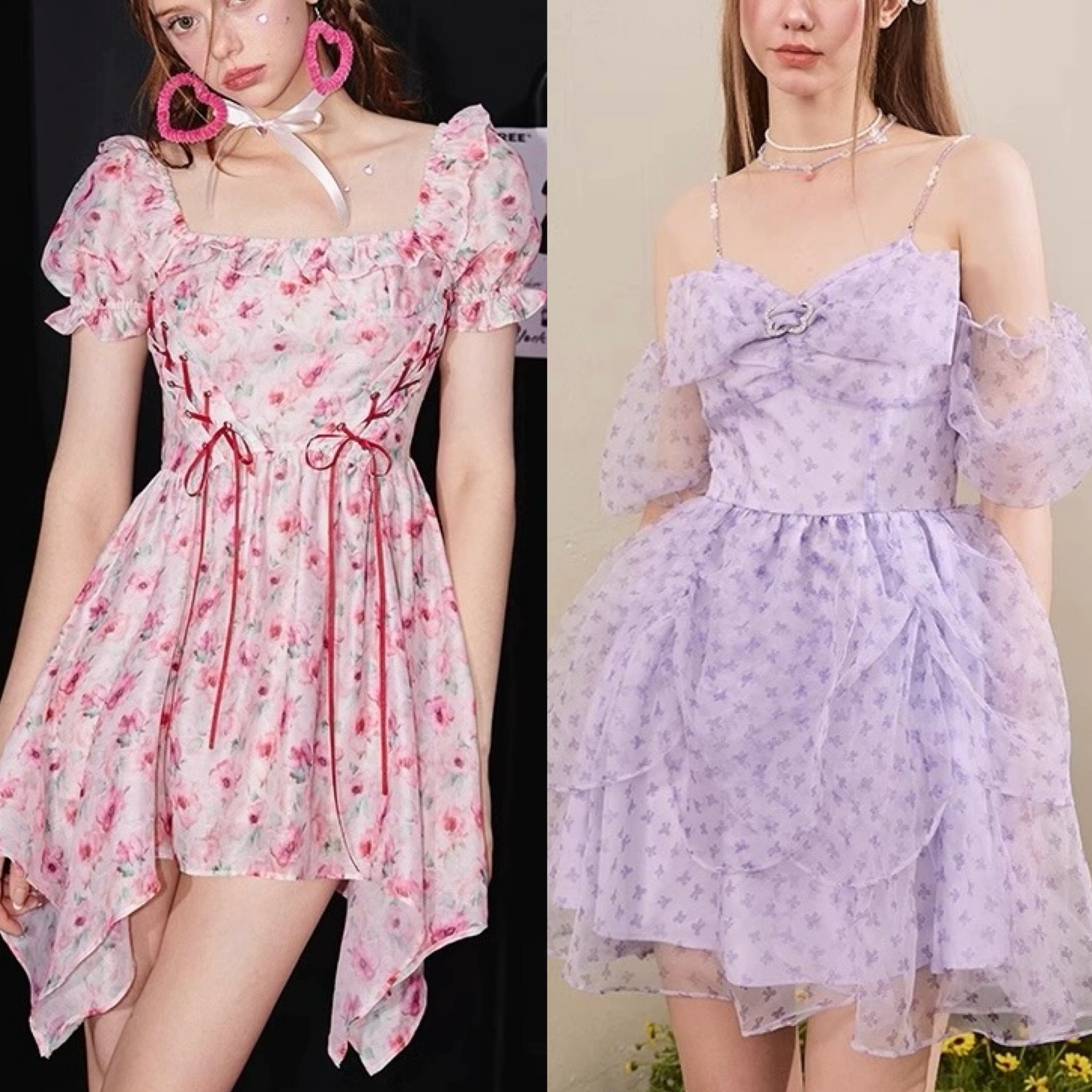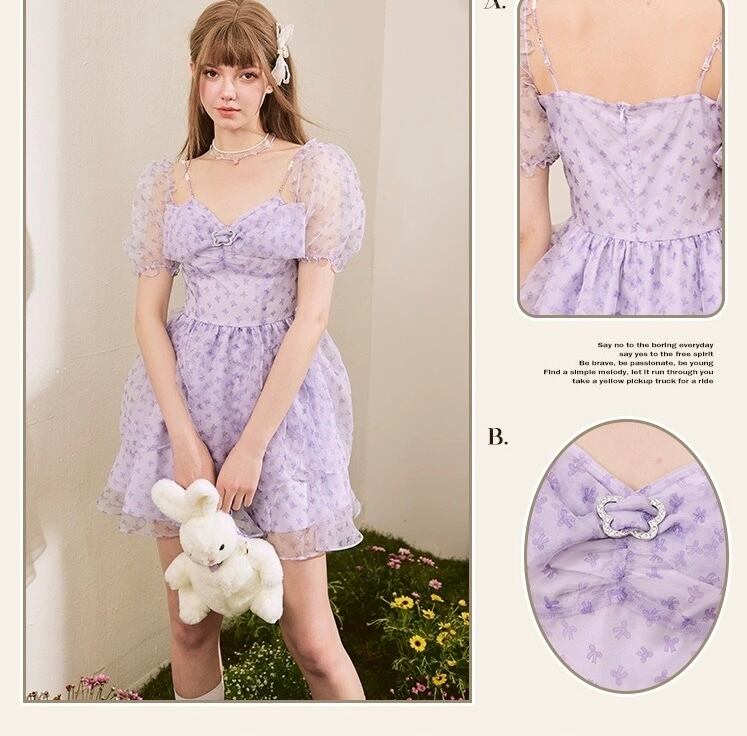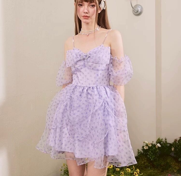 ガーリー 花柄 フラワー オフショルダー 紫 ワンピース ドレス リボン