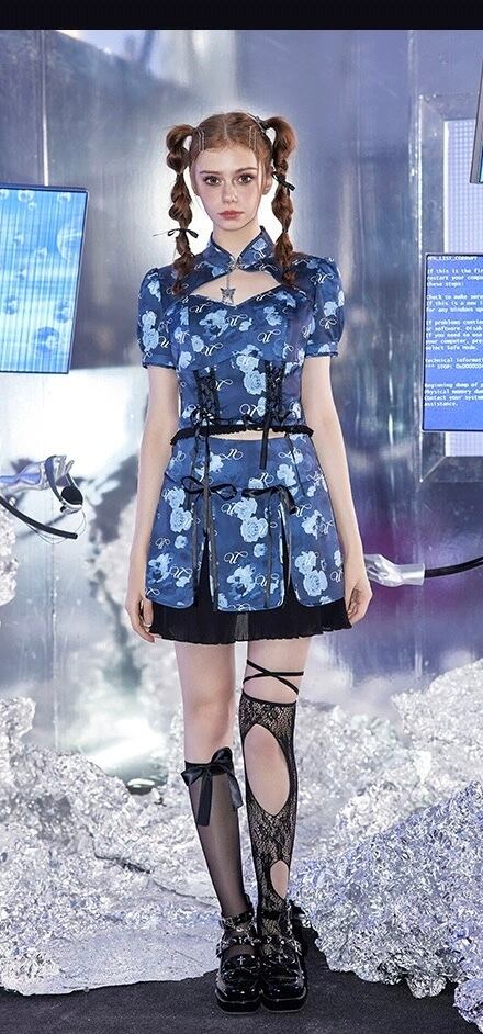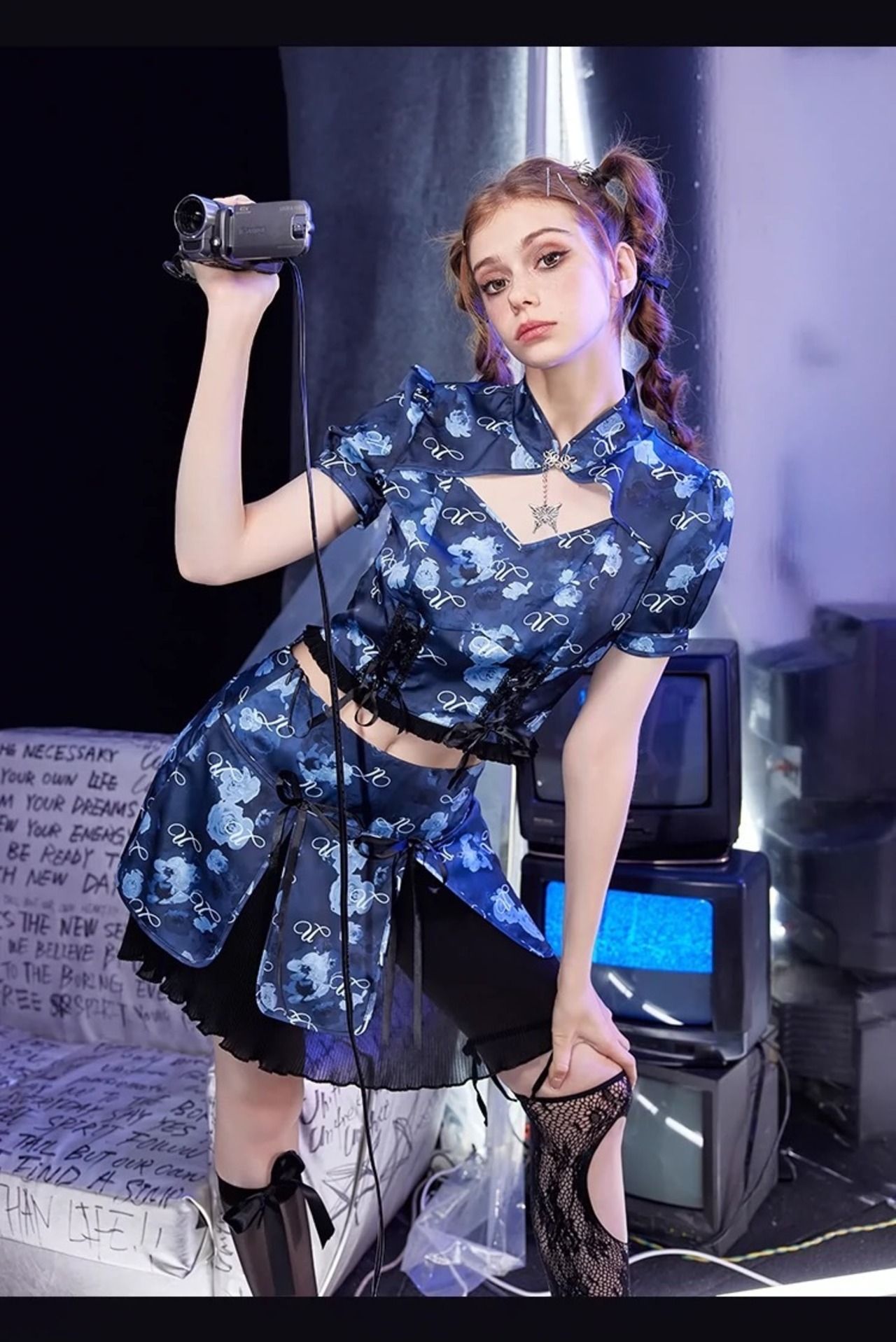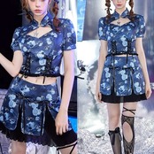 【セットアップ】チャイナ ワンピース ブルー ブラウス ミニスカート ツーピース スーツ