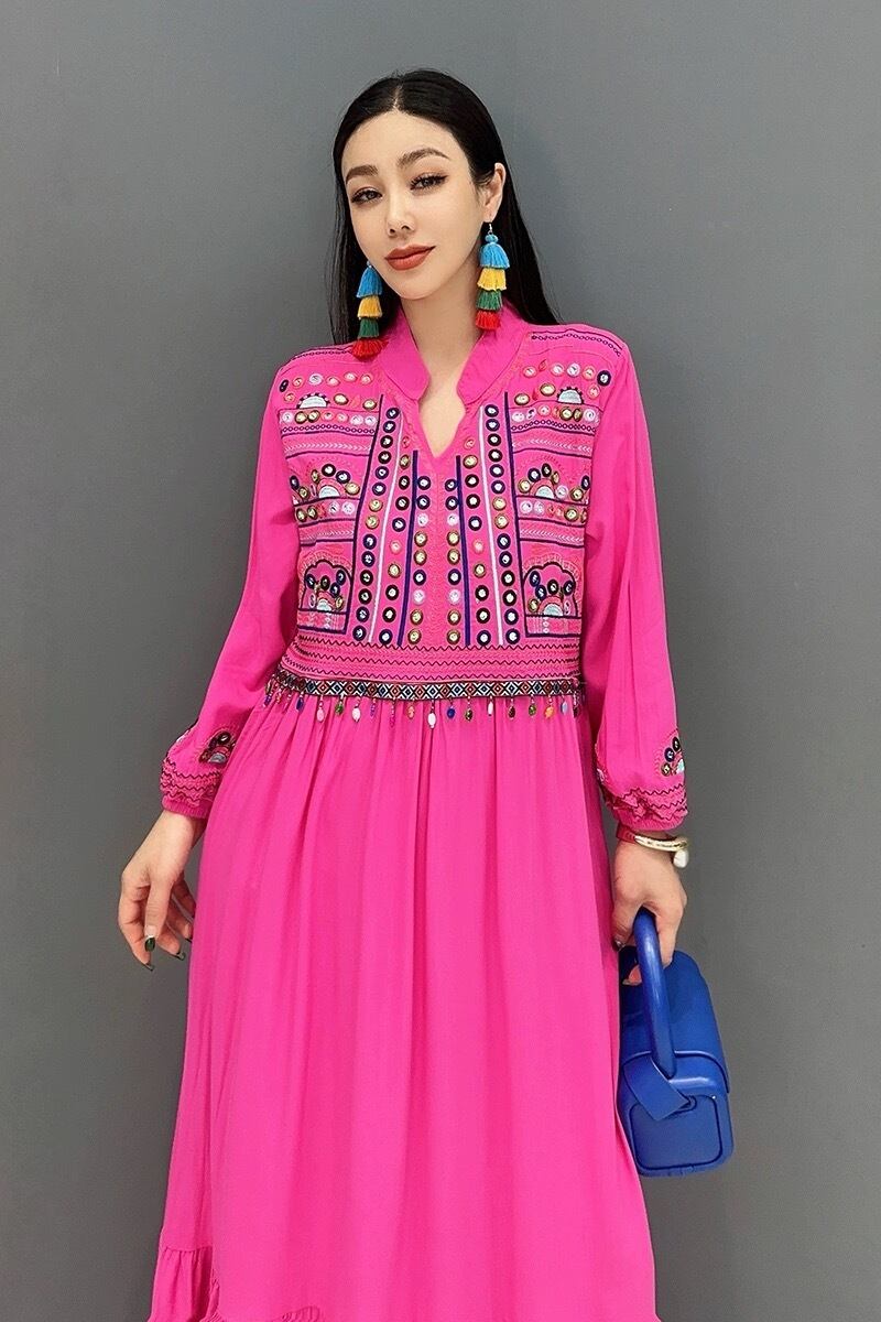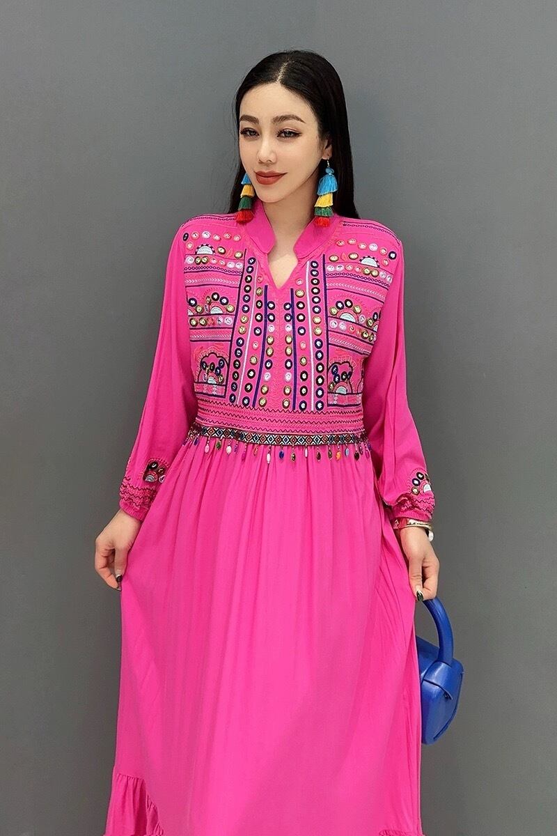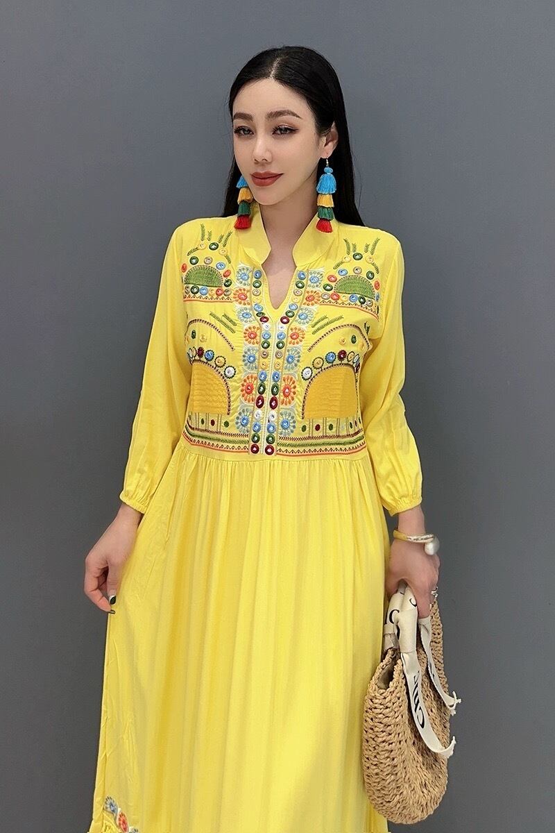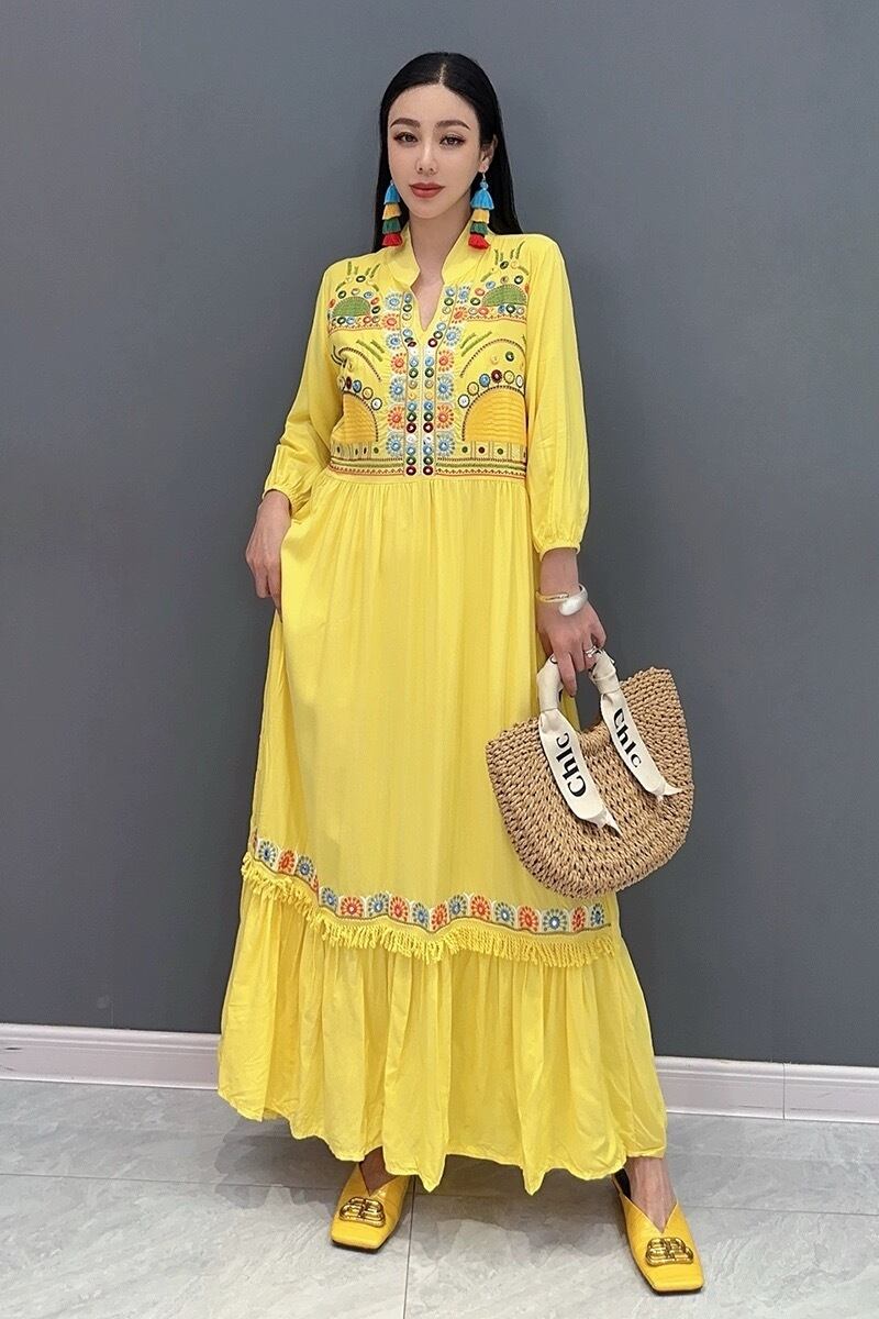 カジュアル エスニック マキシ ブラウス ワンピース ピンク 黄色 白 黒 アジアン