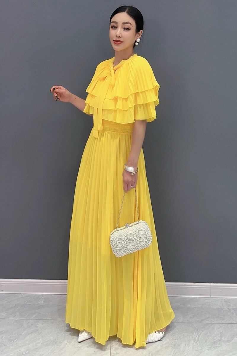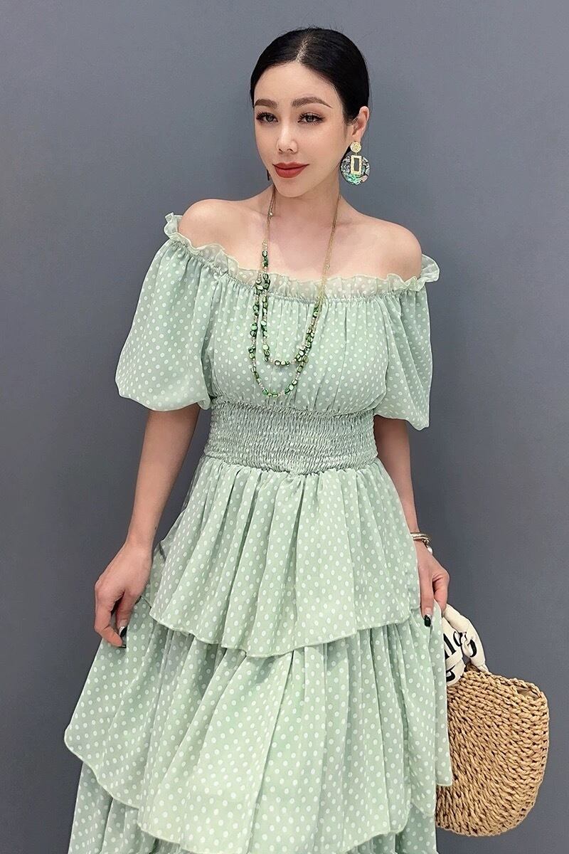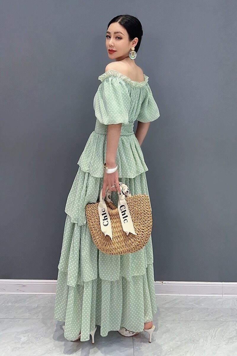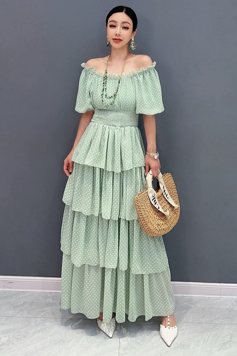 オフショルダー 緑 水玉 ドット ワンピース フリル 黄色 ブラウス ドレス