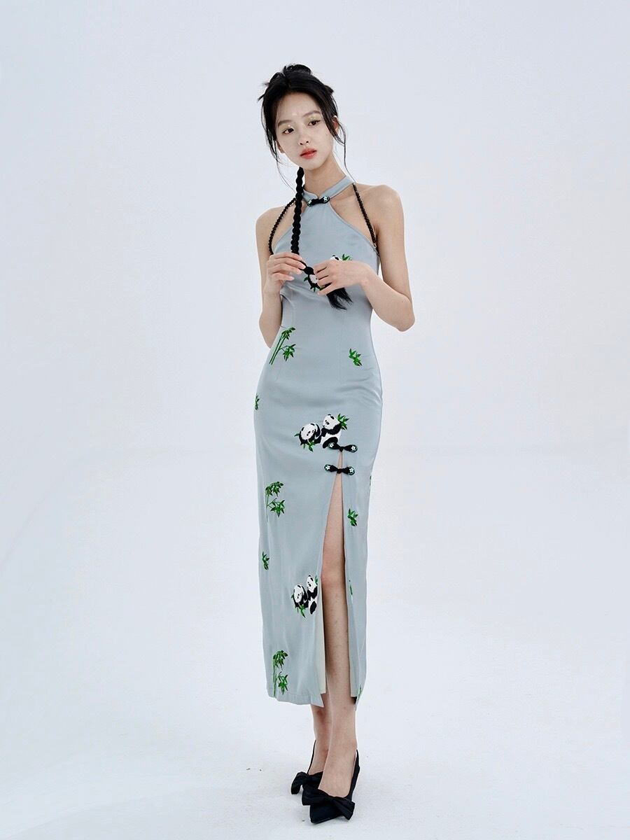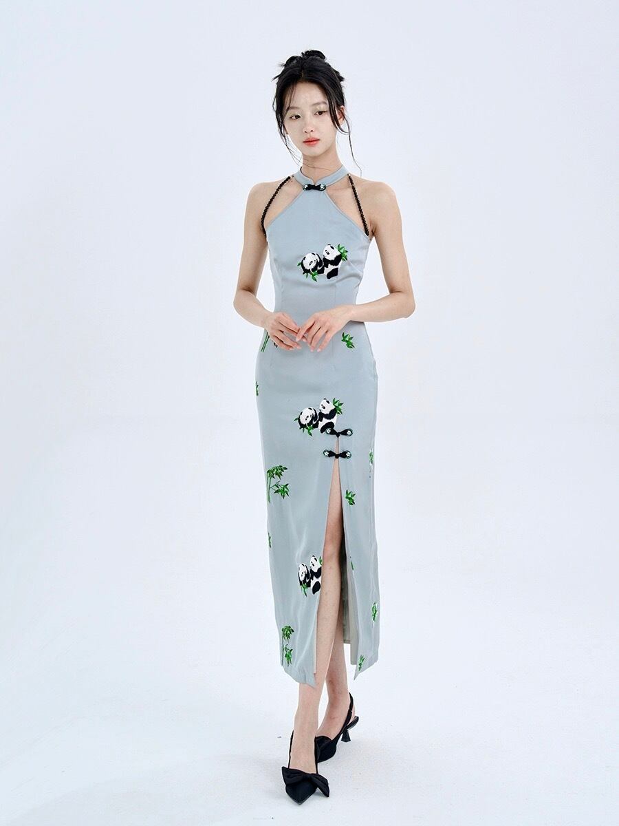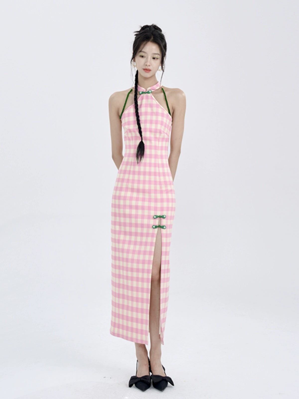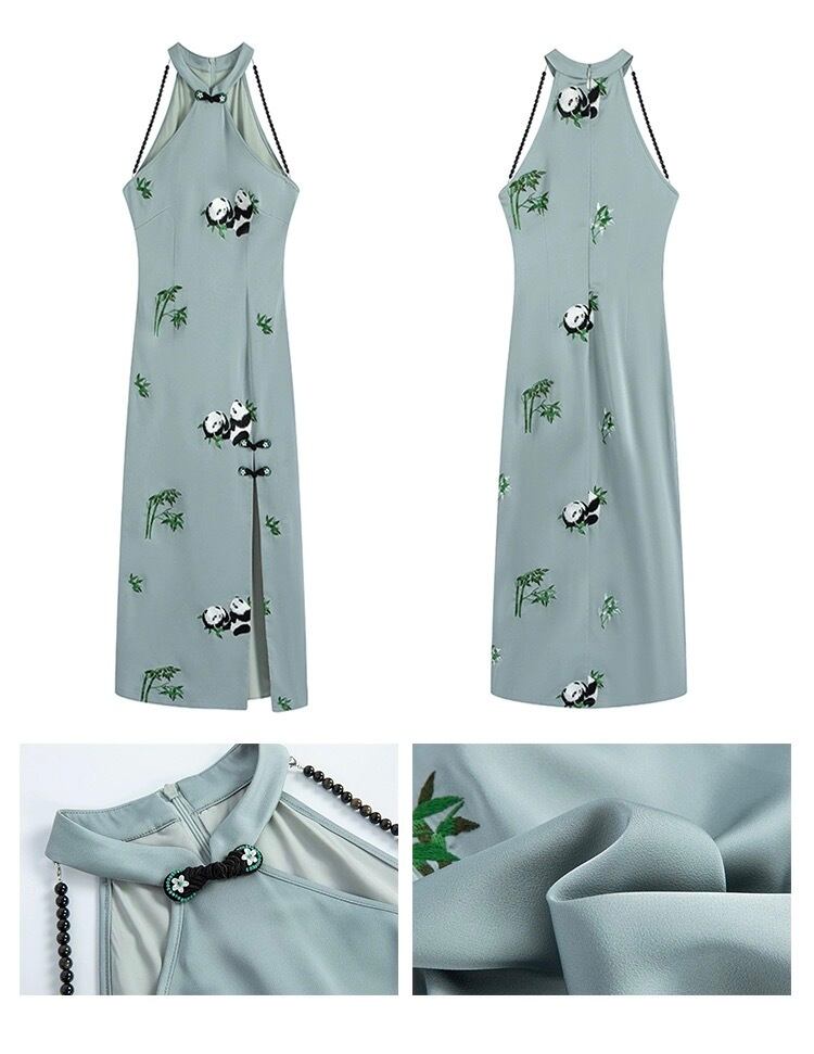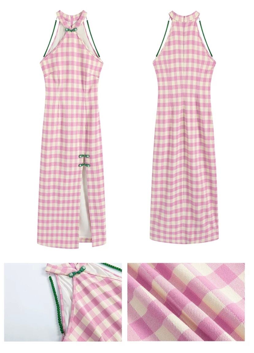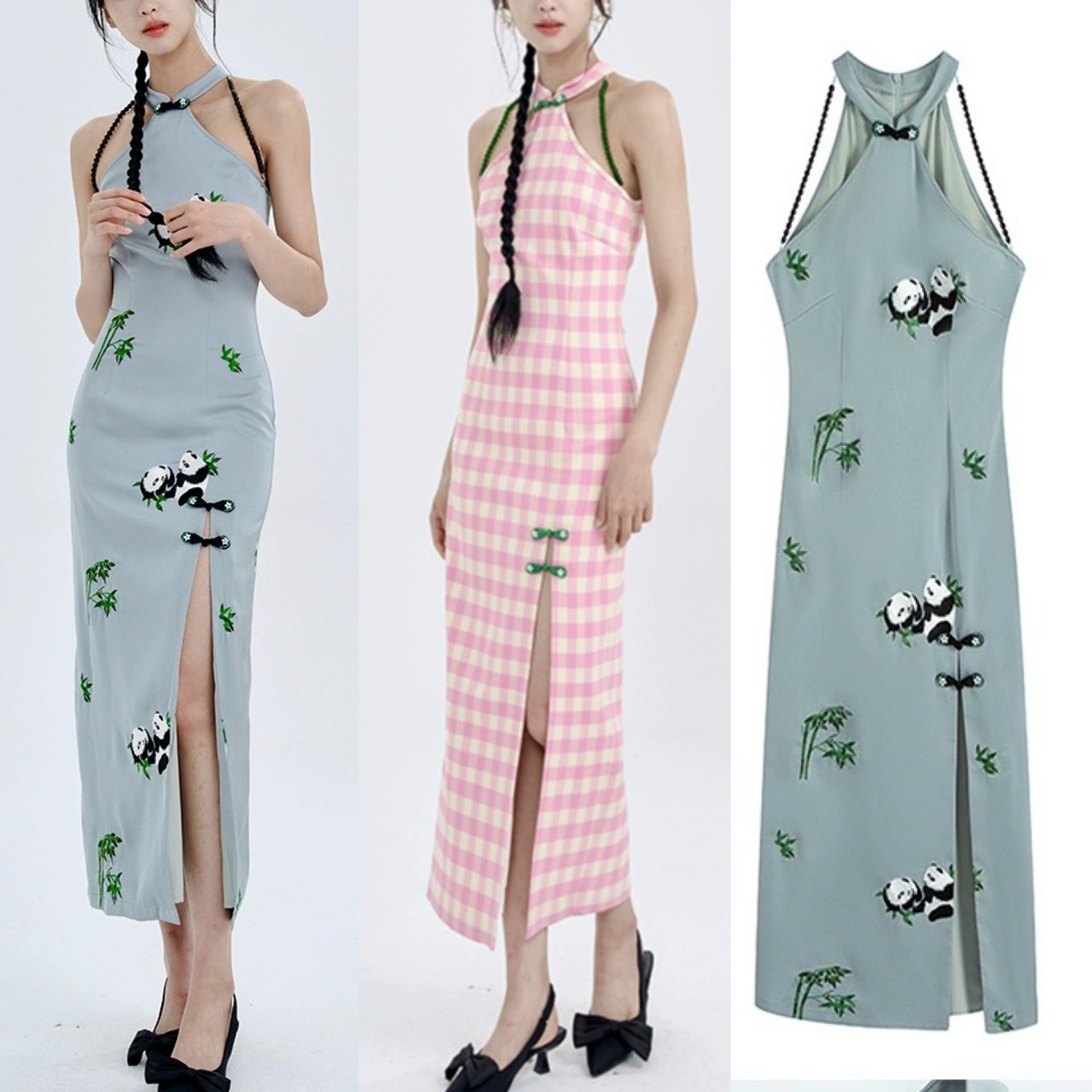 ピンク チェック パンダ グリーン 緑 スリット ワンピース コスプレ ドレス チャイナ ドレス