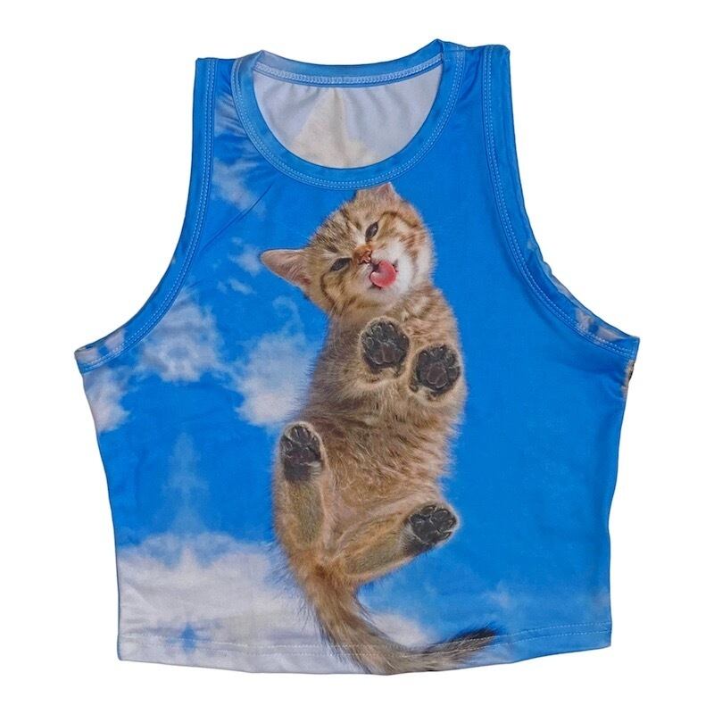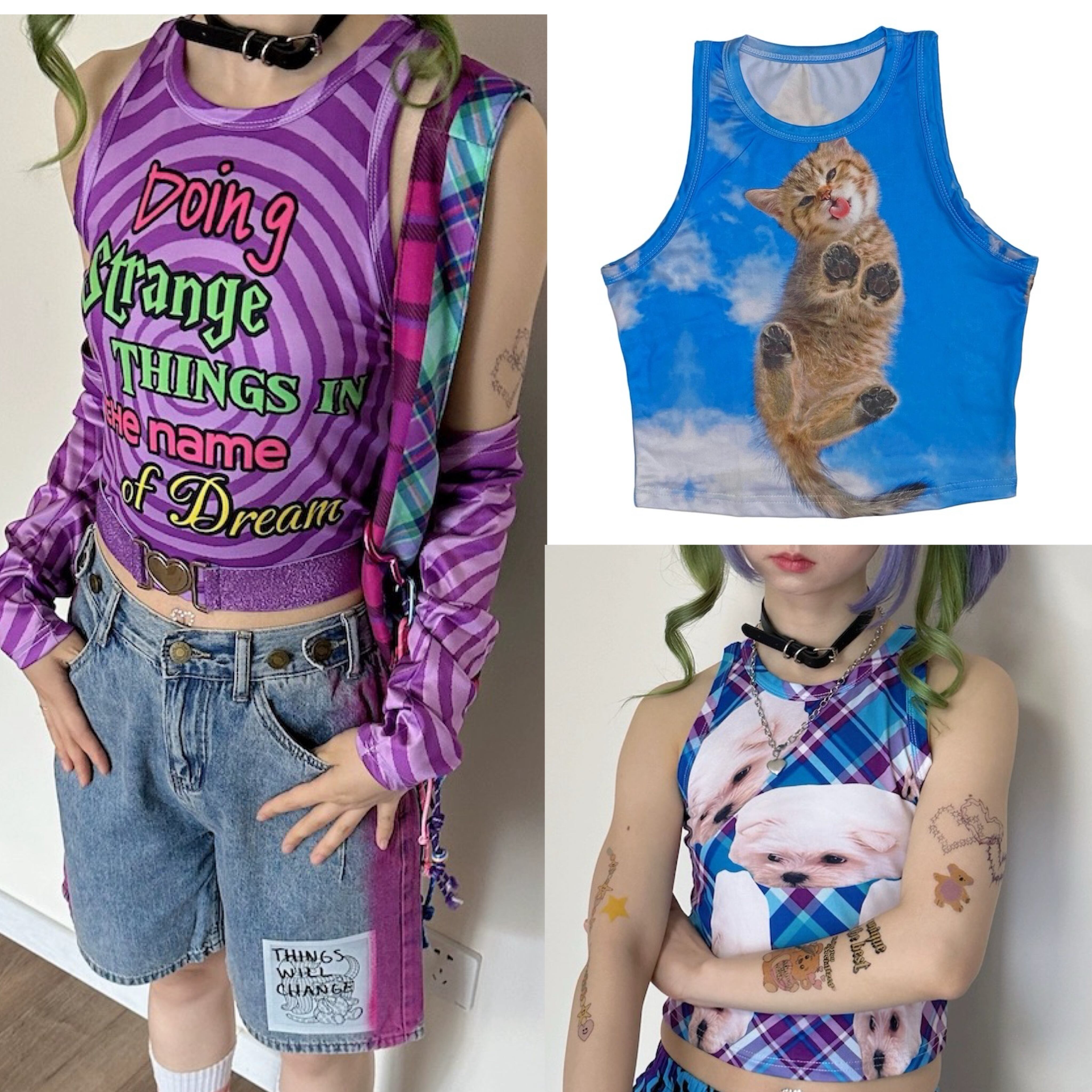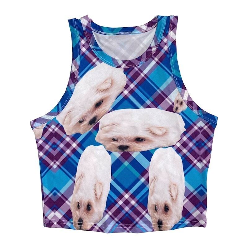 タンクトップ 水色 ブラウス チェック カジュアル 犬