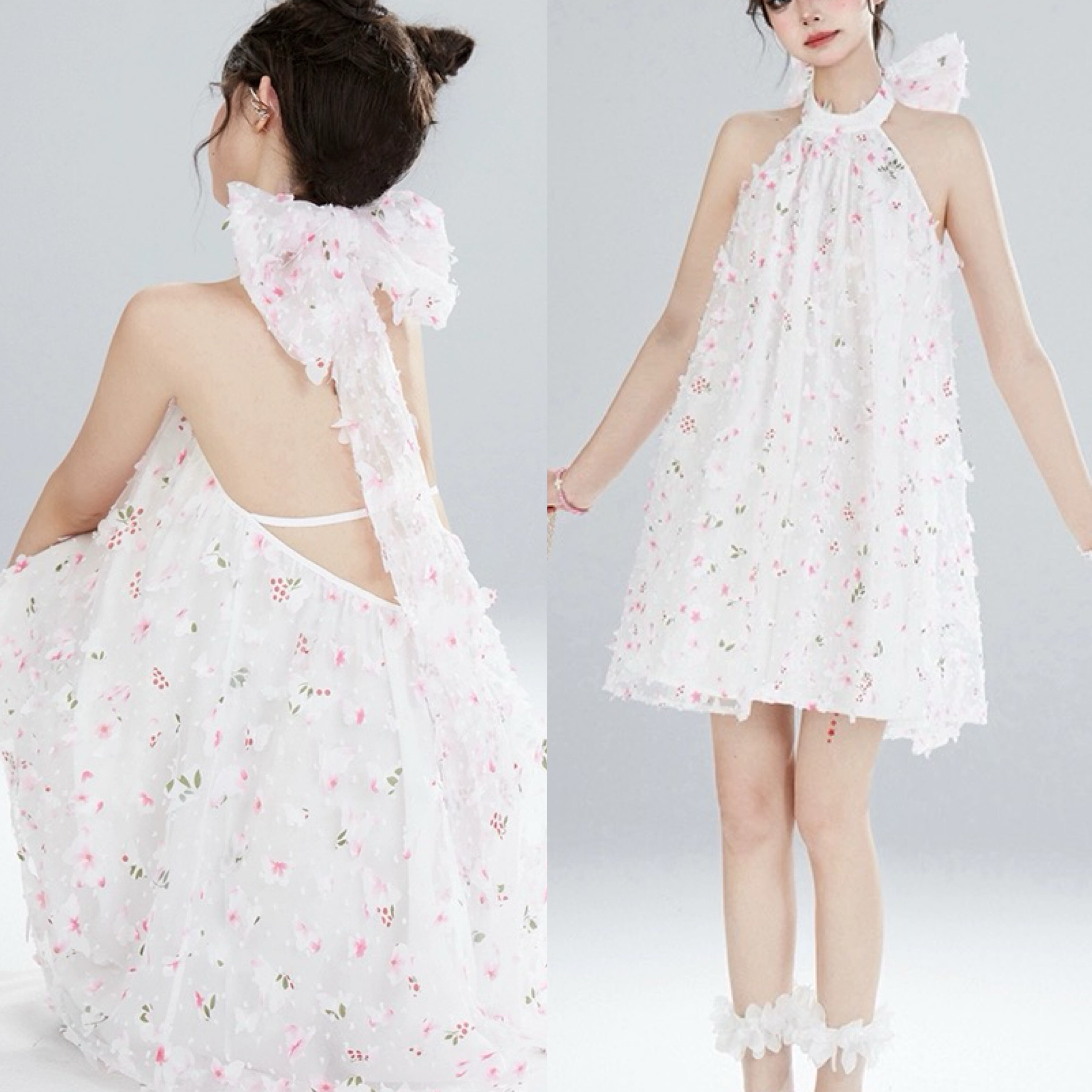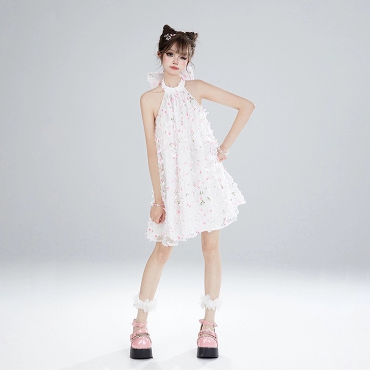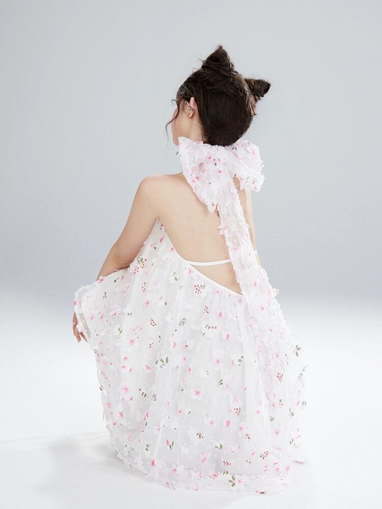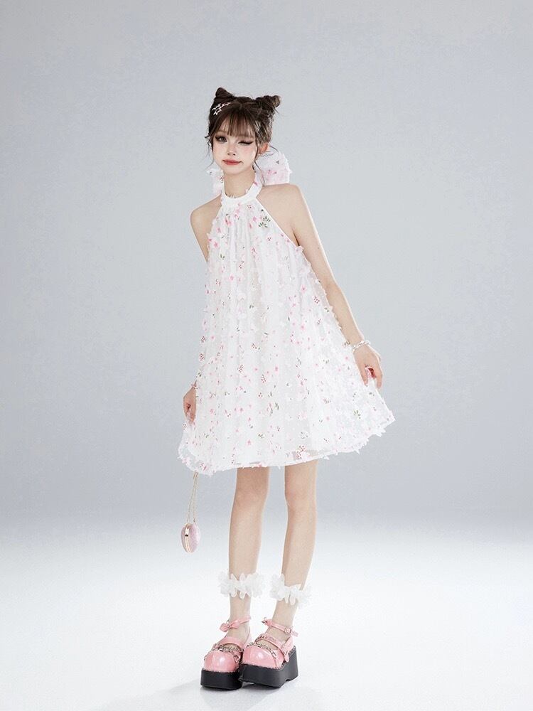 白 リボン ガーリー ホルダーネック ワンピース