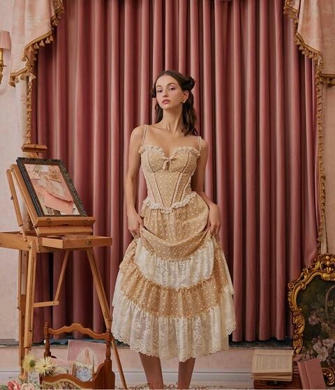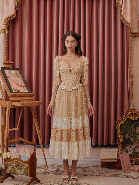 ベージュ 水玉 ドット ワンピース ガーリー エレガント