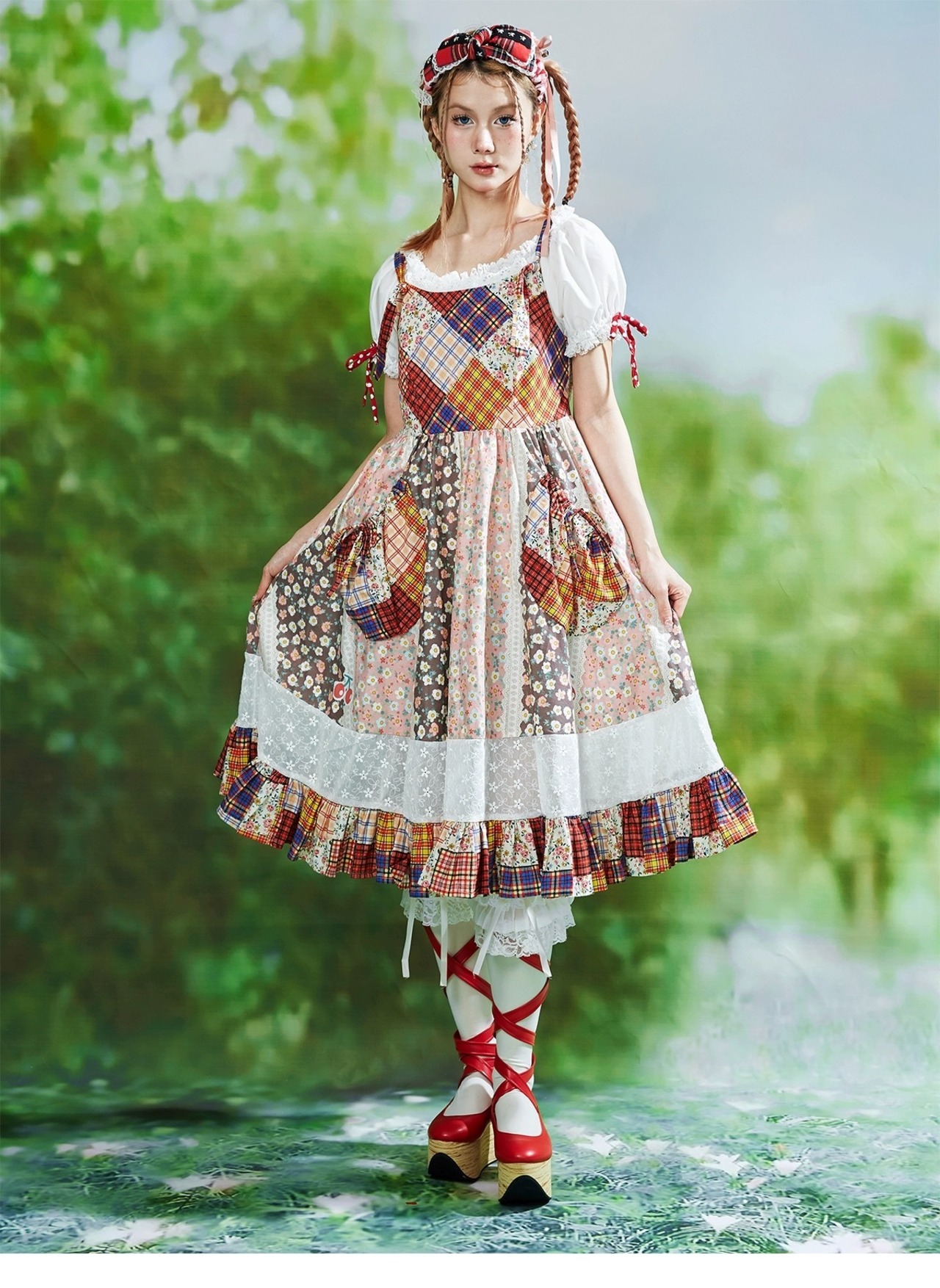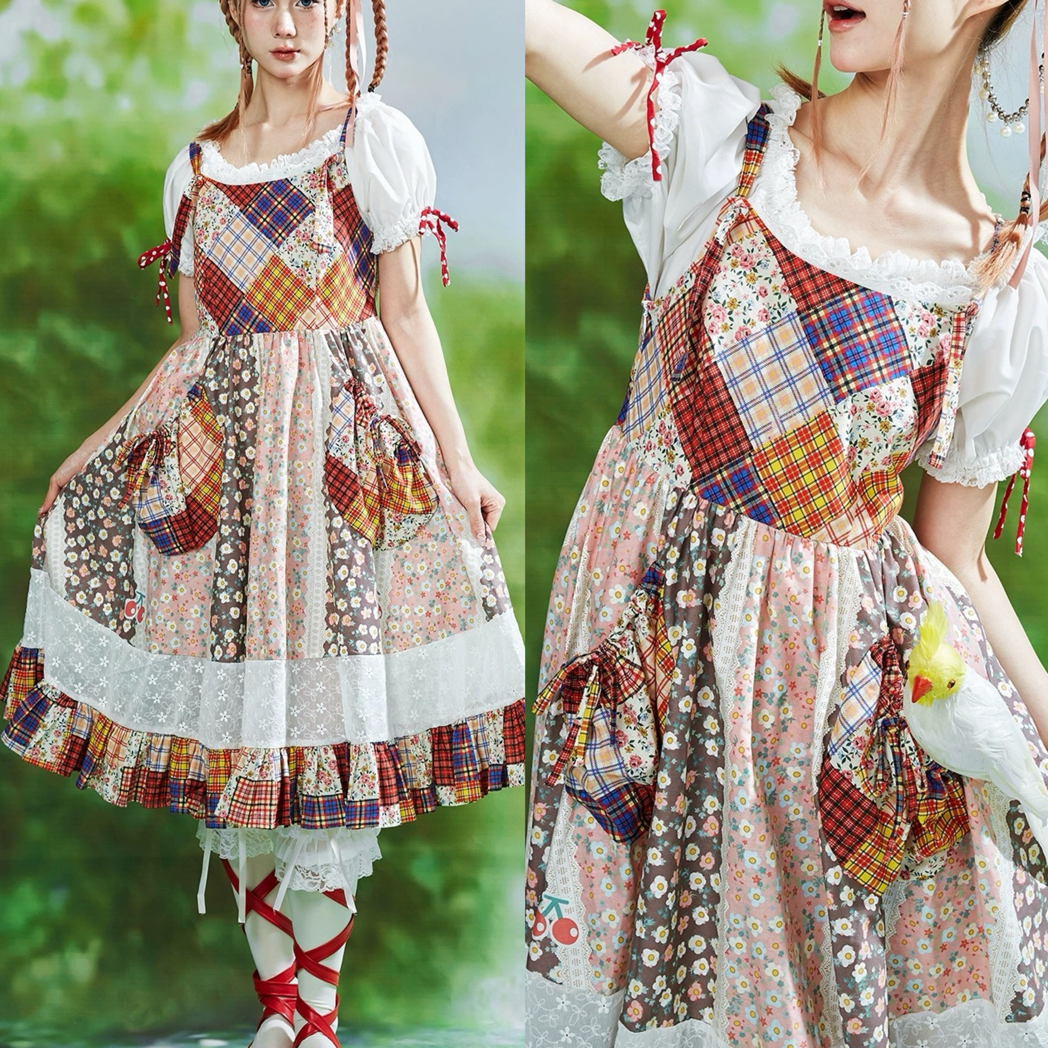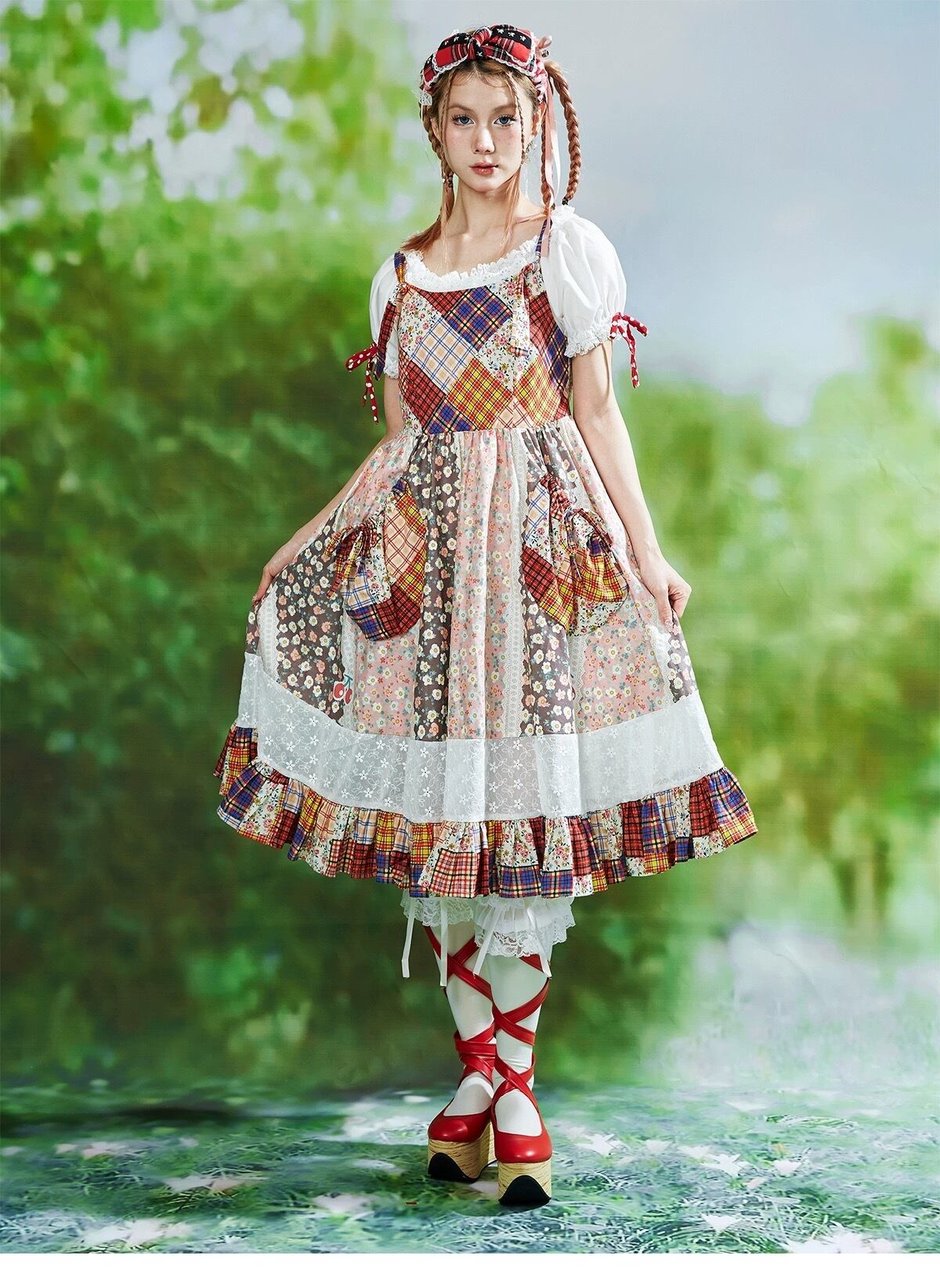 パッチワーク 茶色 花柄 フラワー ワンピース ガーリー 可愛い