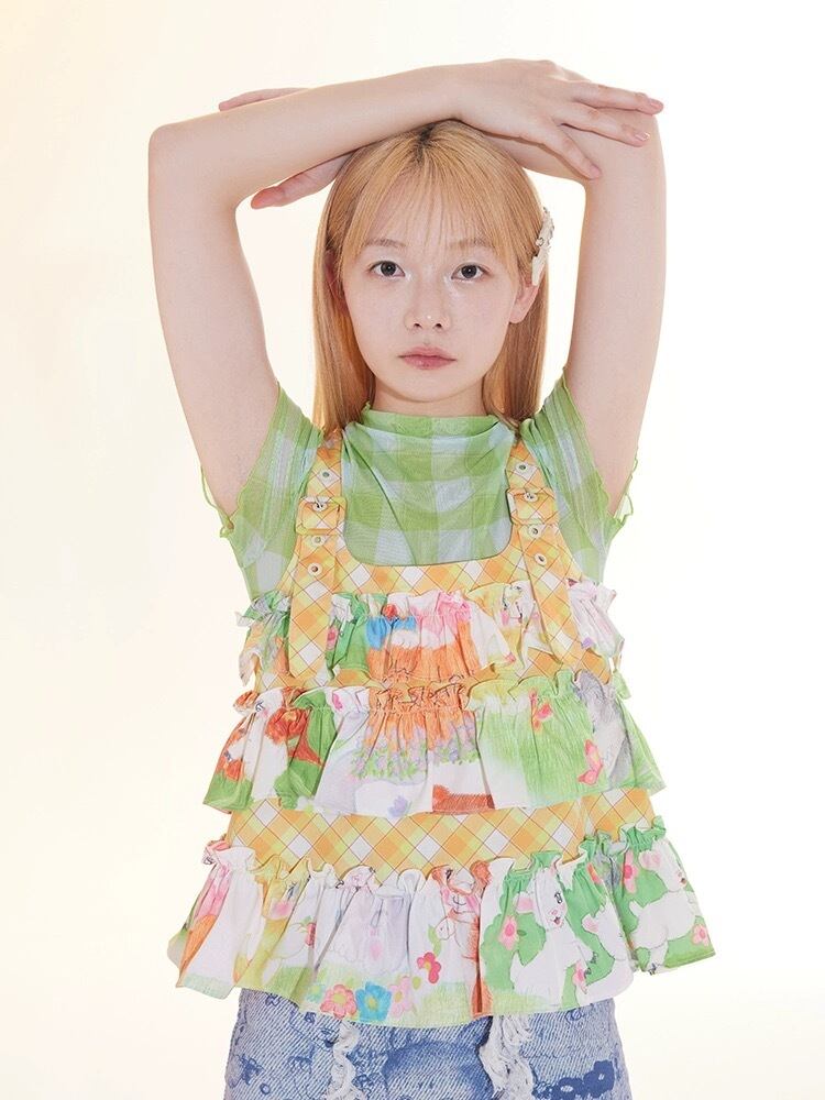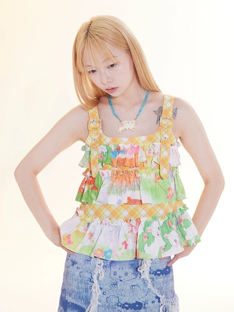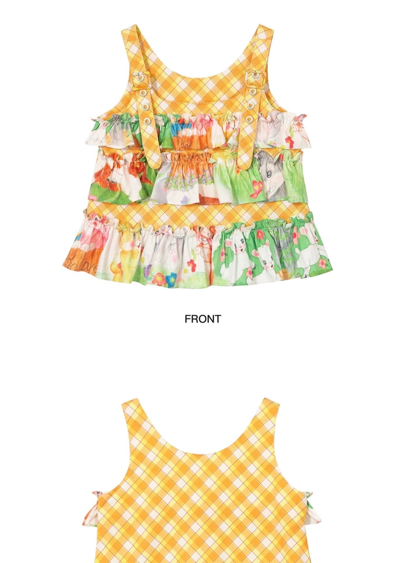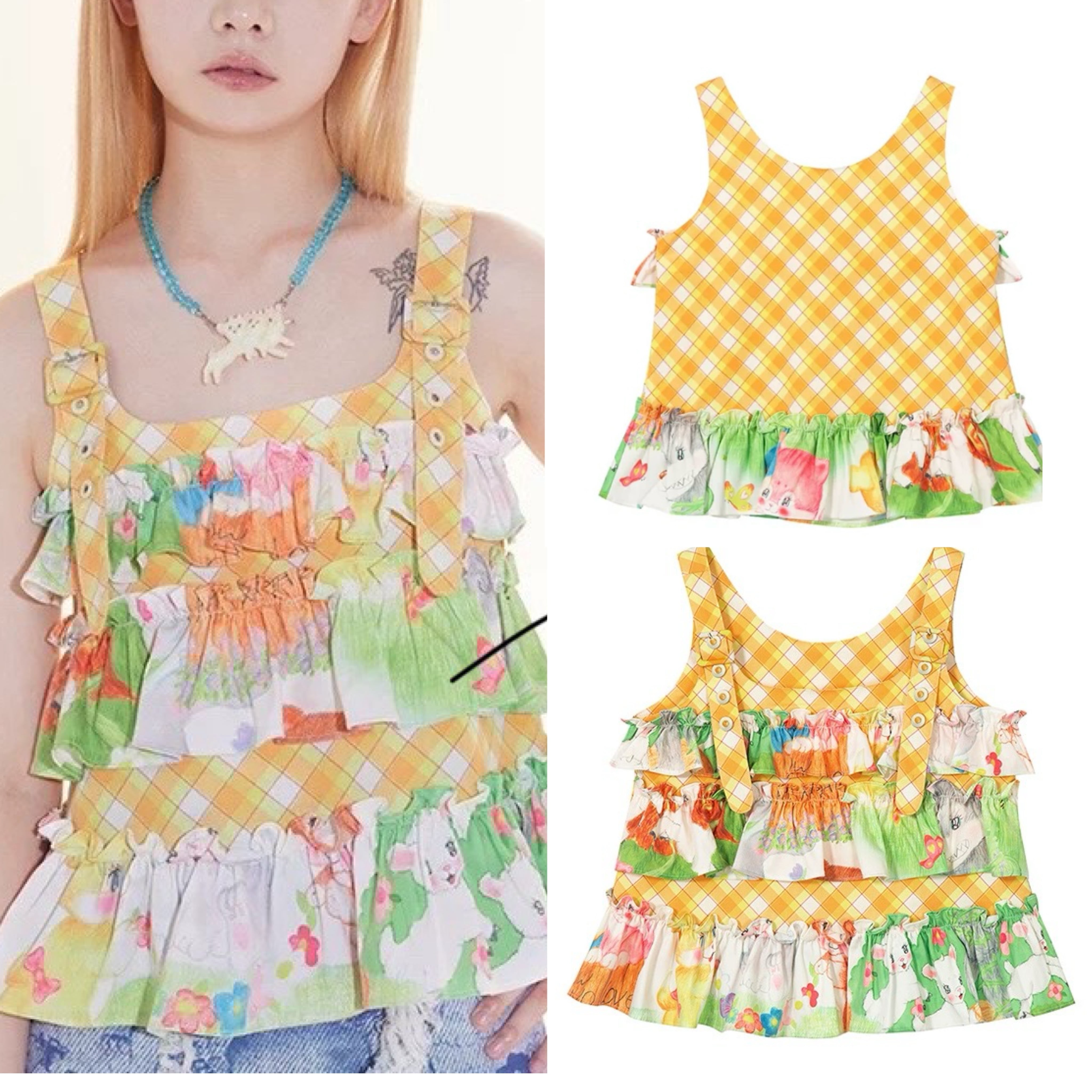 黄色 チェック トップス ブラウス ガーリー フリル キャミソール 可愛い アニマル 緑