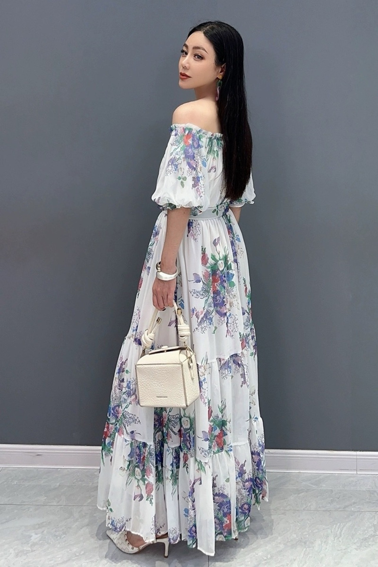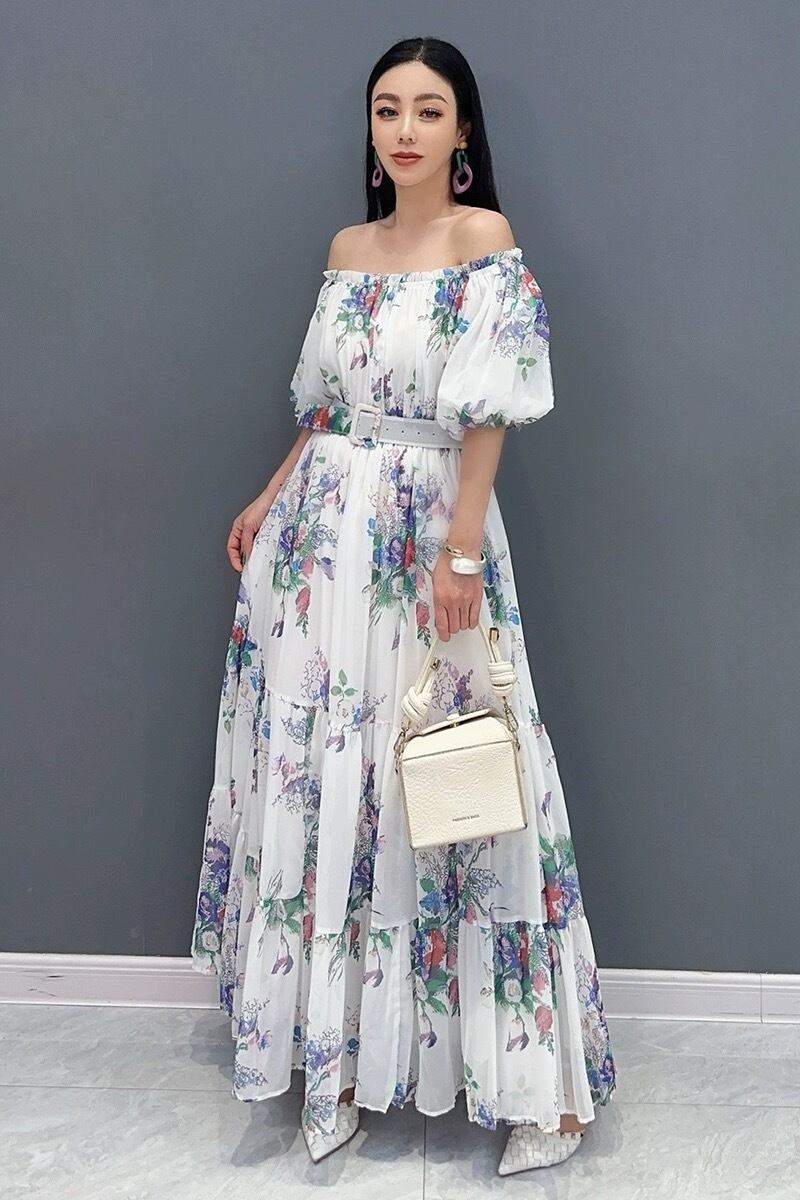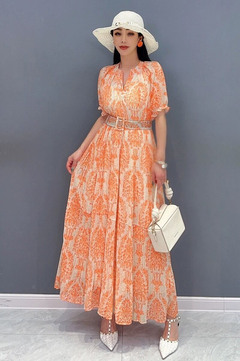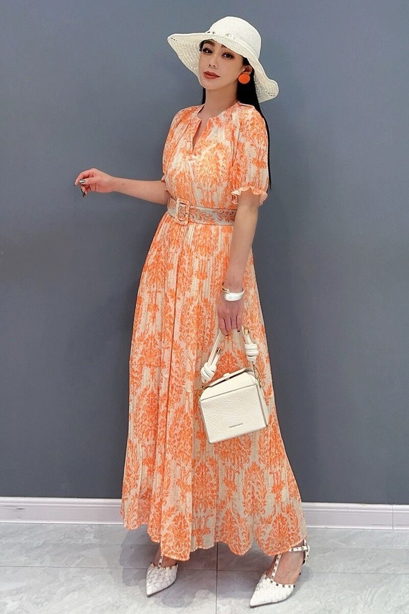 マキシ ロング ワンピース 白 オレンジ 花柄 フラワー エレガント