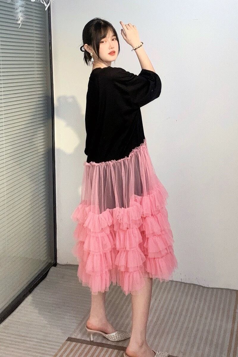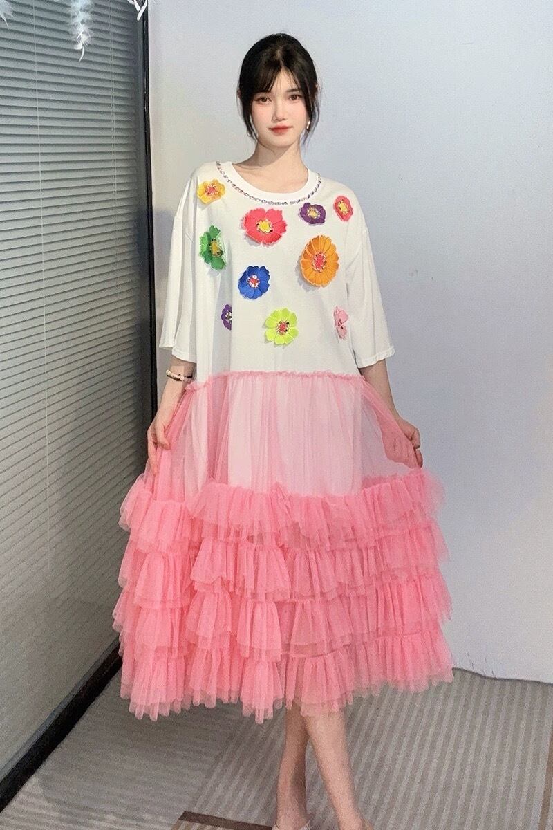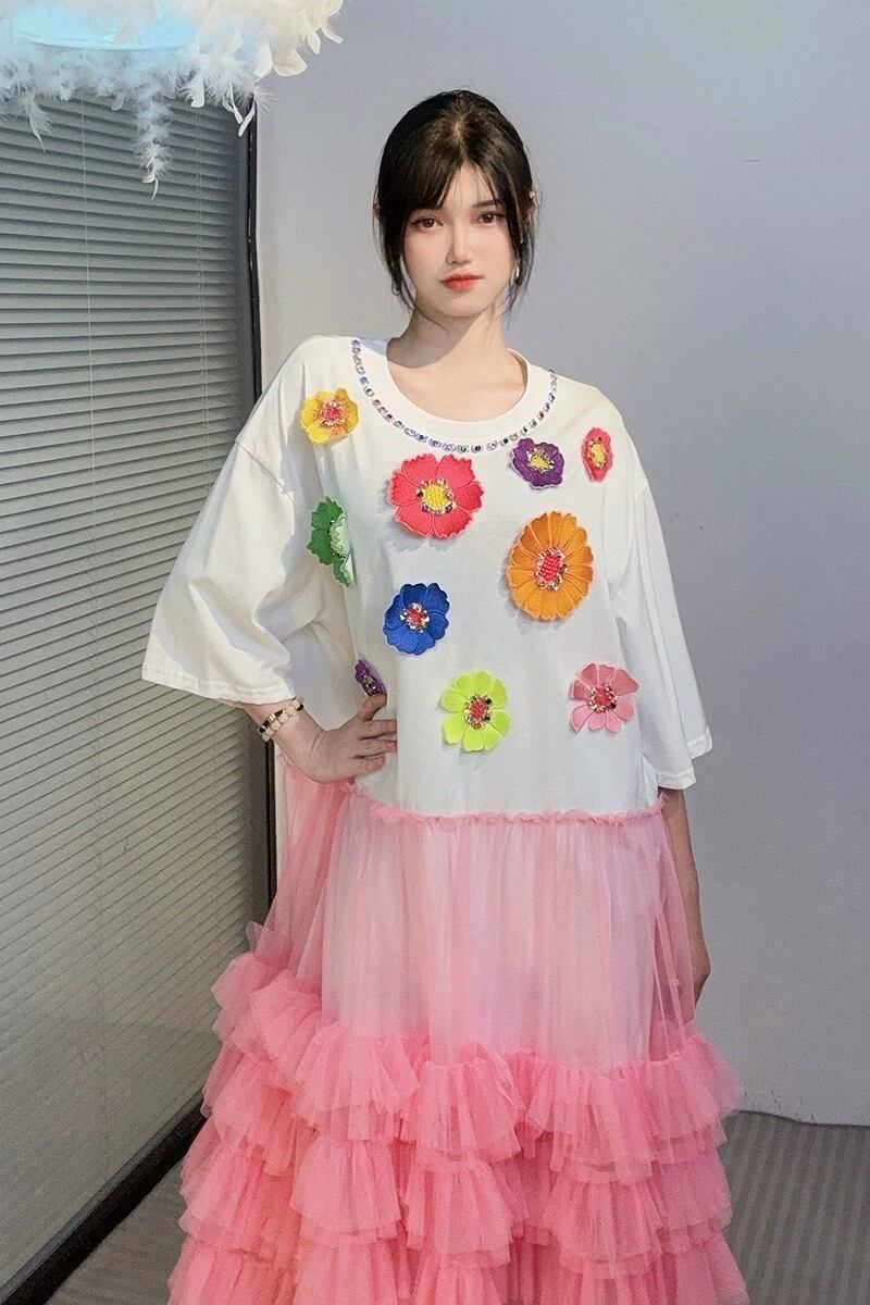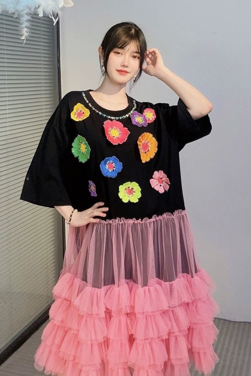 フラワー 花柄 デコレーション ワンピース 黒 白 ピンク カジュアル Tシャツ
