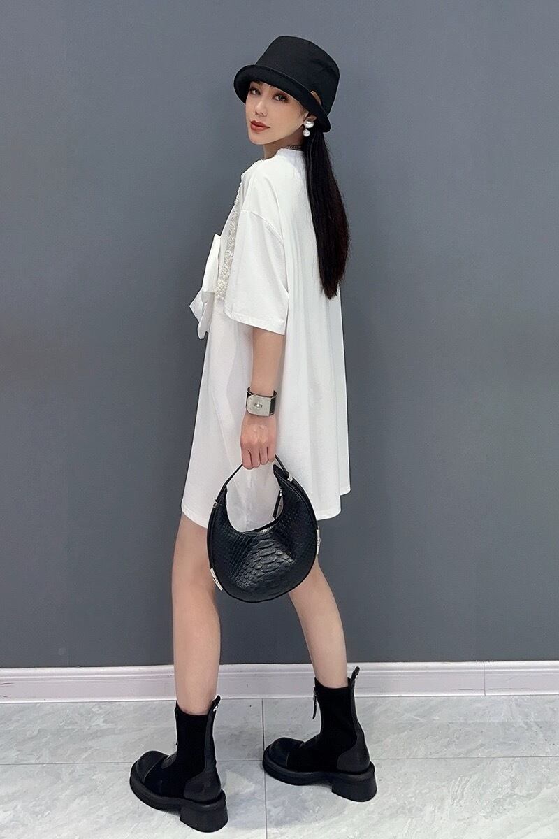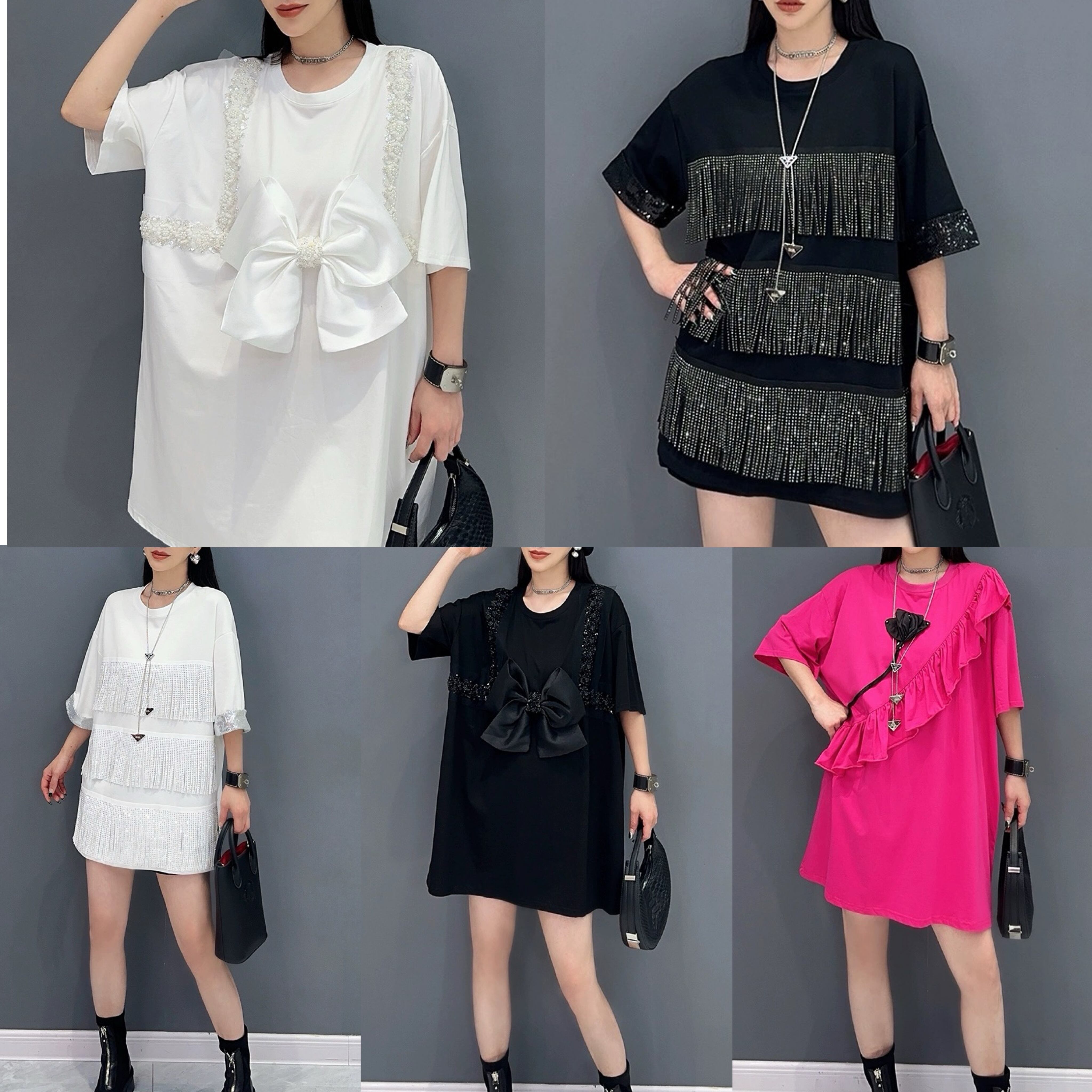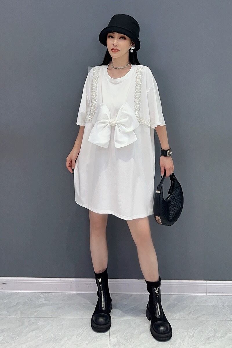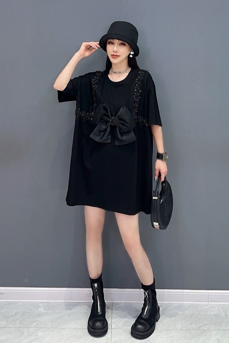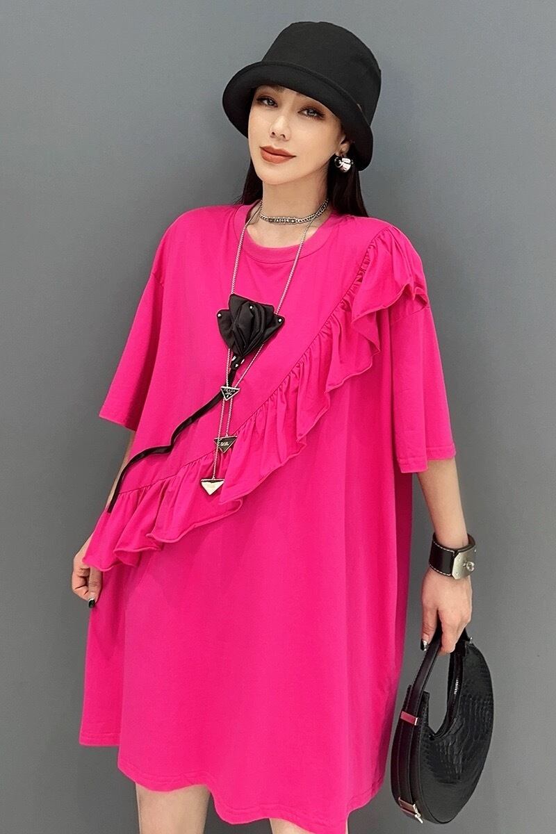 ピンク カジュアル 黒 白 Tシャツ ワンピース リボン デコレーション 薔薇 花