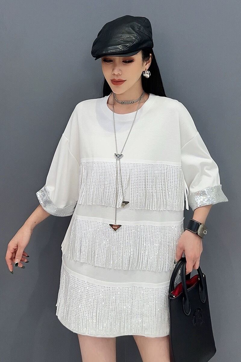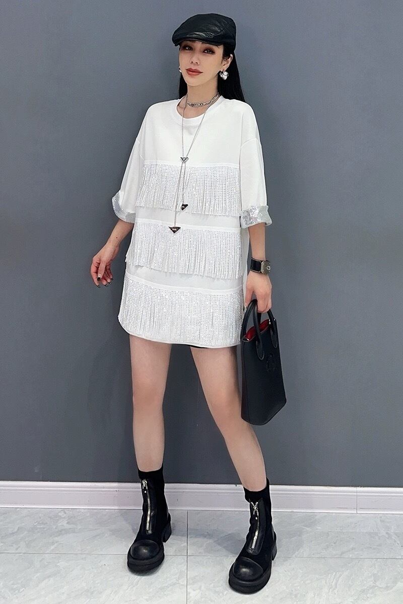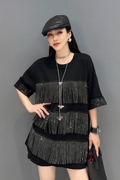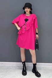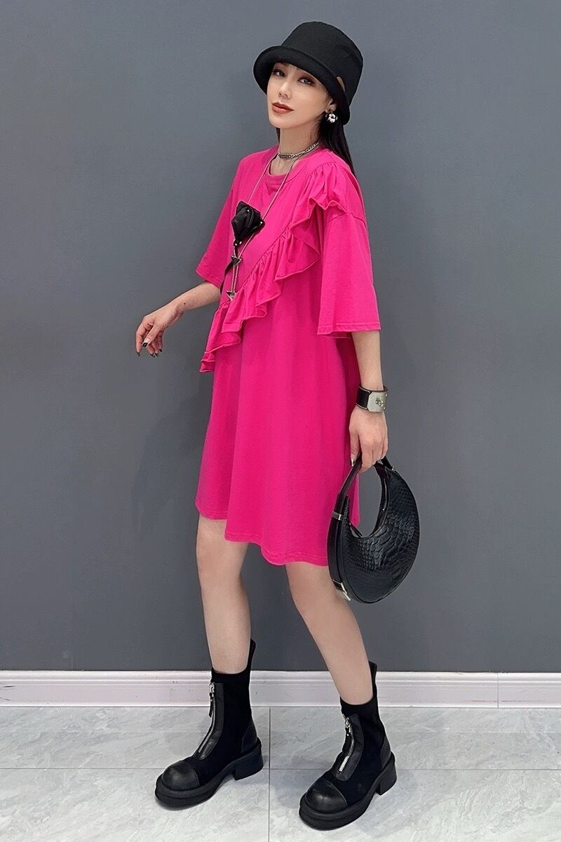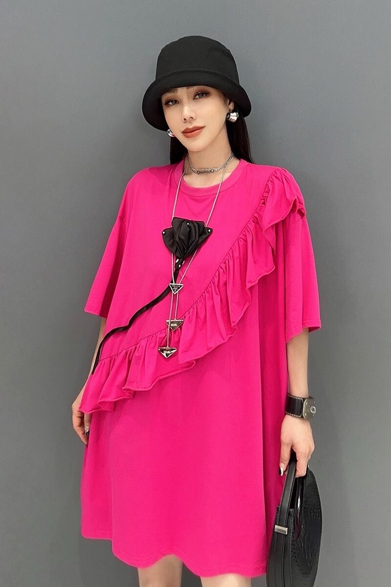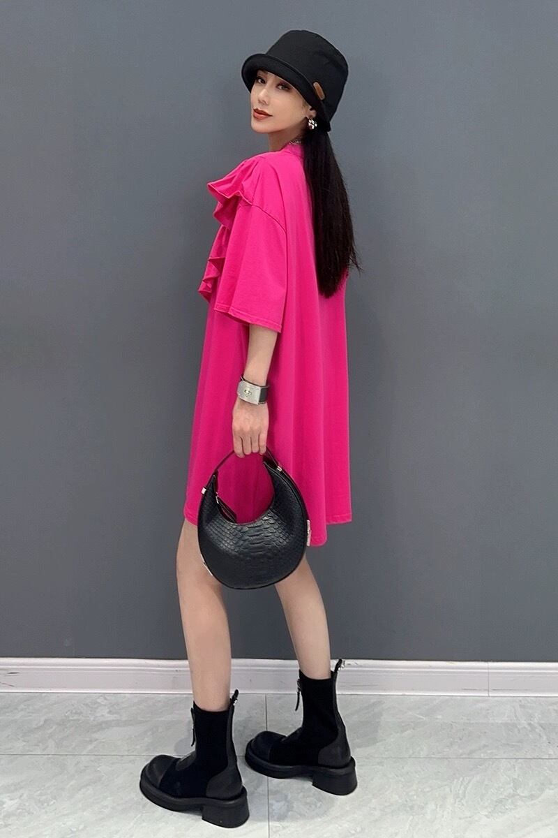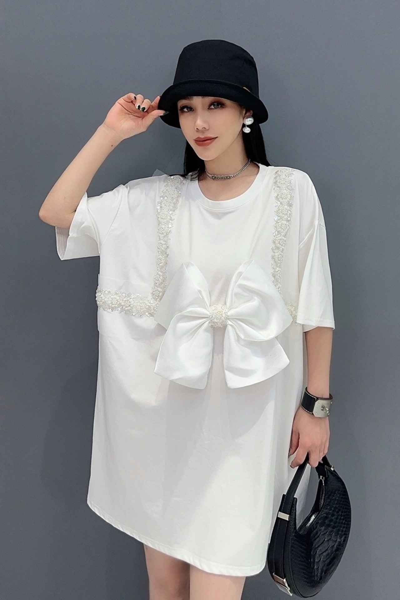 ピンク カジュアル 黒 白 Tシャツ ワンピース リボン デコレーション 薔薇 花