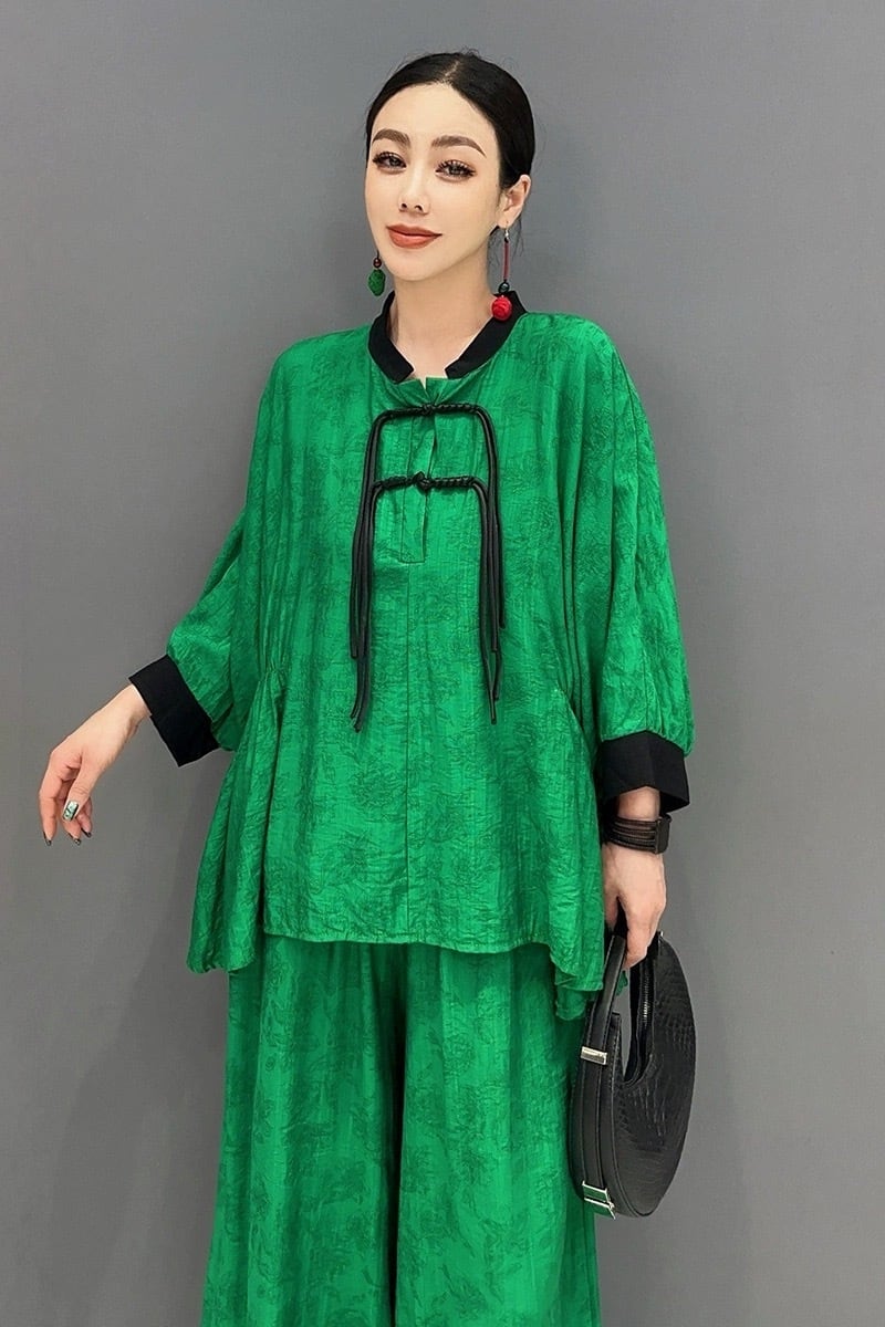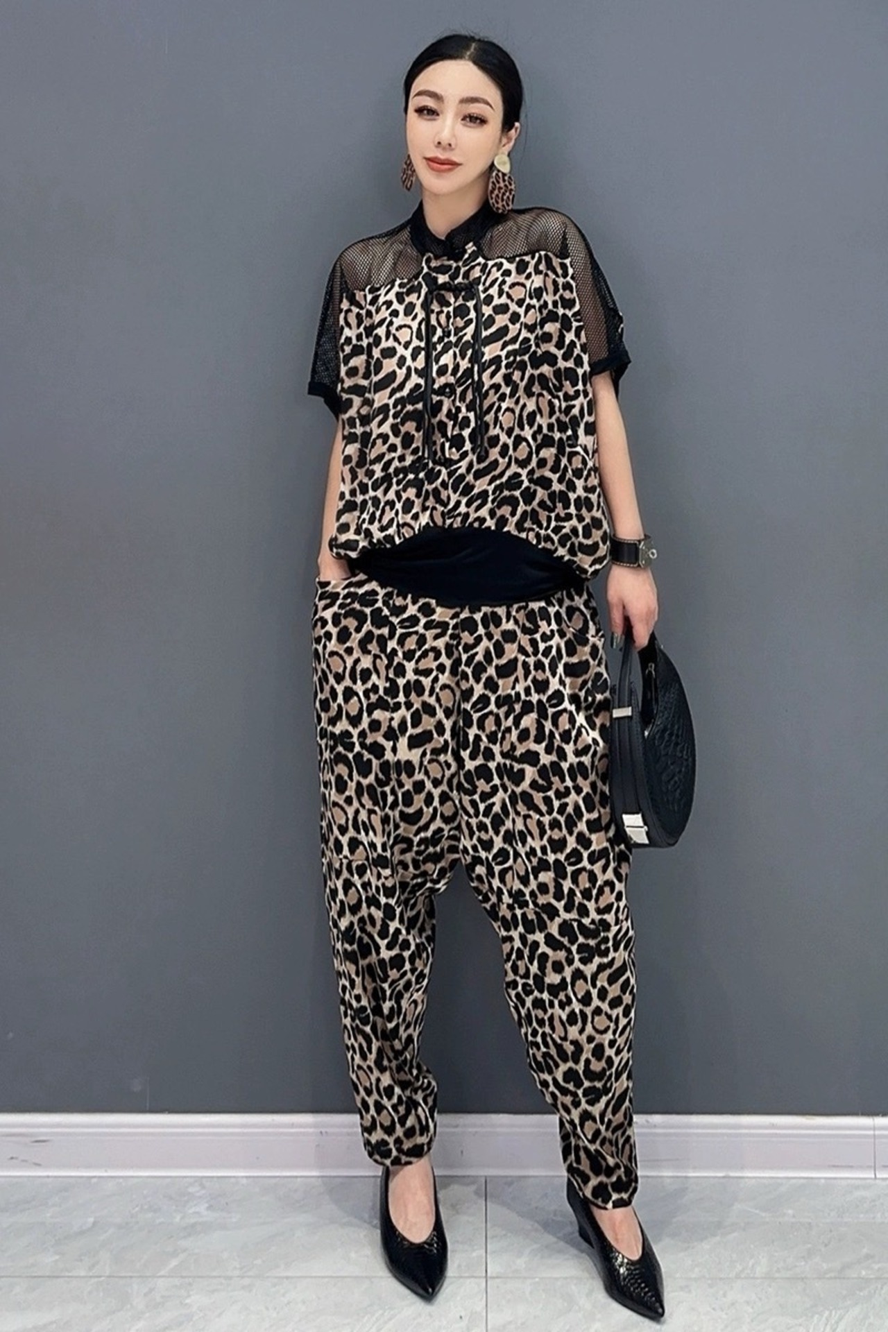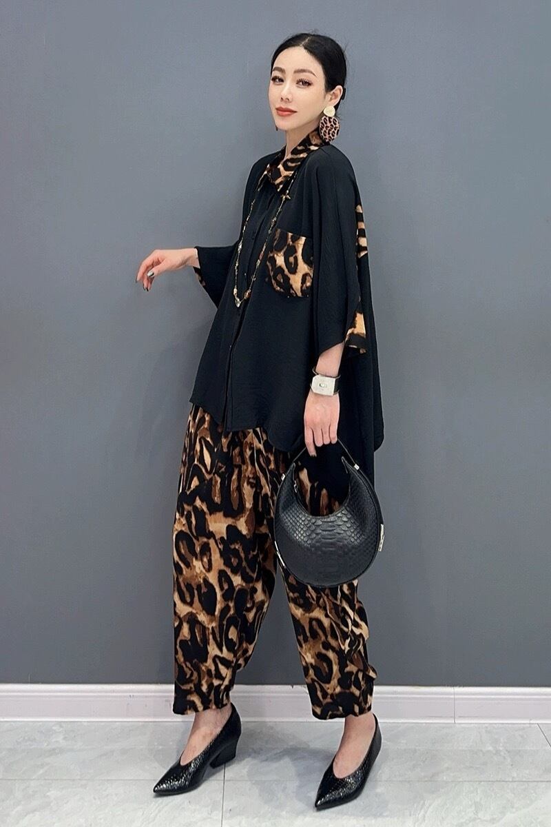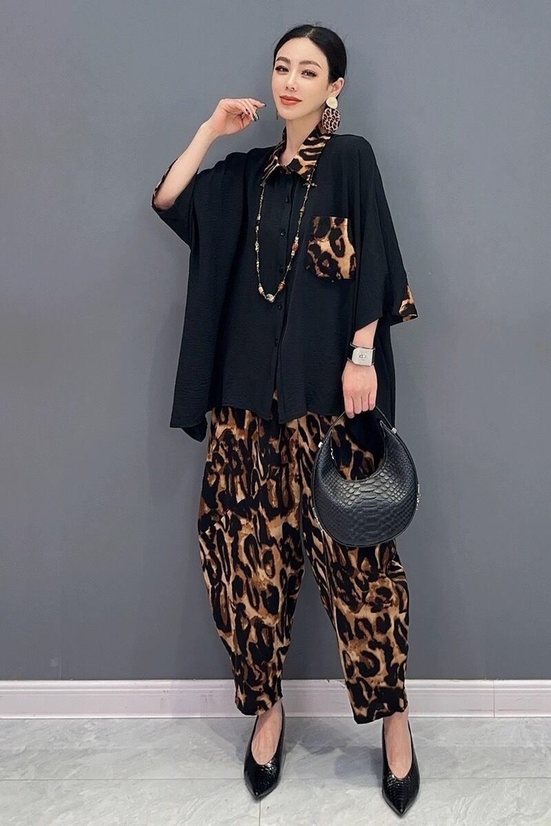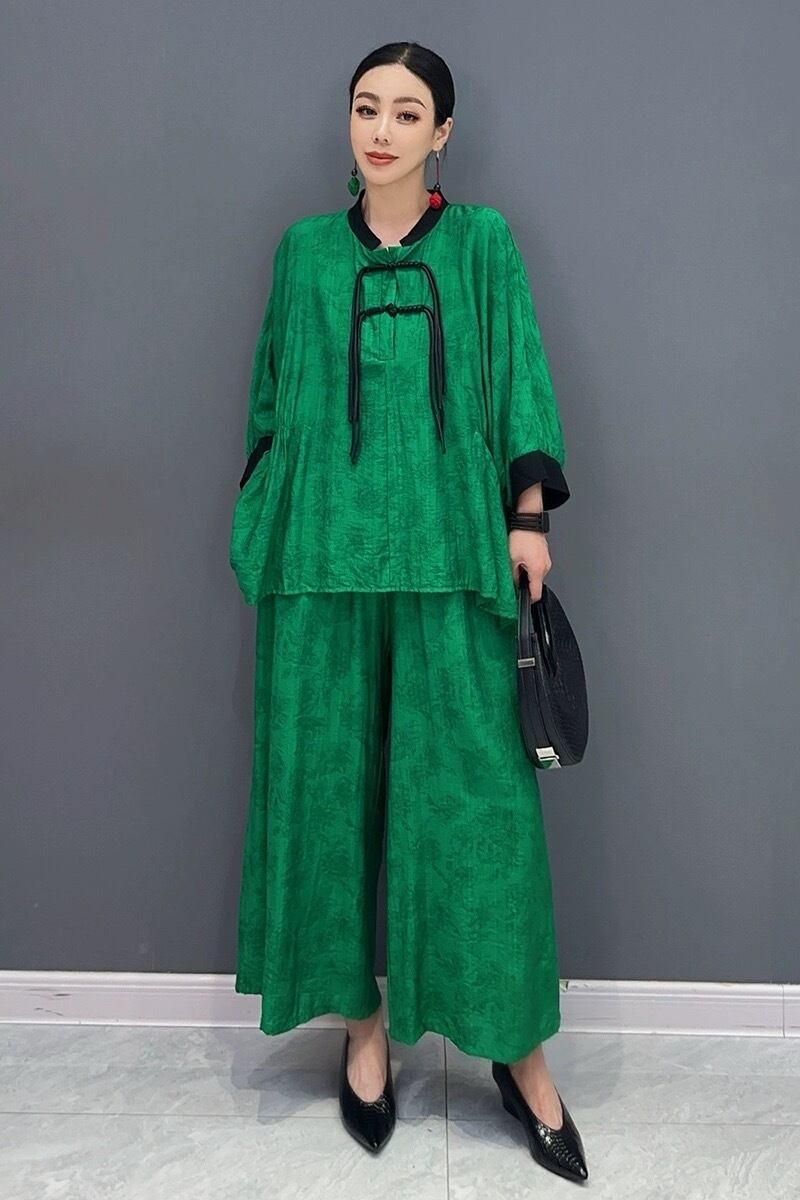 【セットアップ】レオパード ヒョウ柄 ブラウス パンツ スウェット カジュアル チャイナ 緑