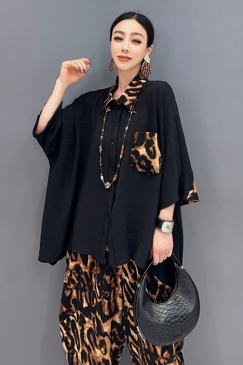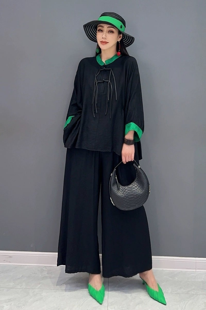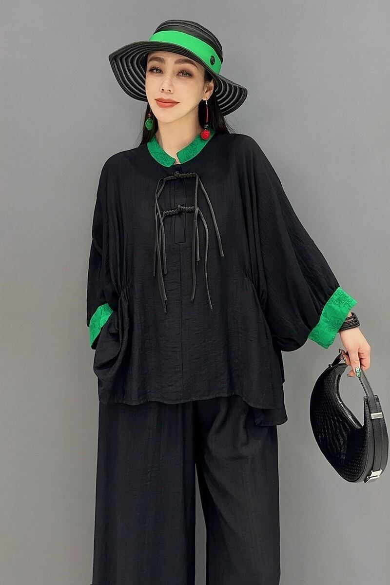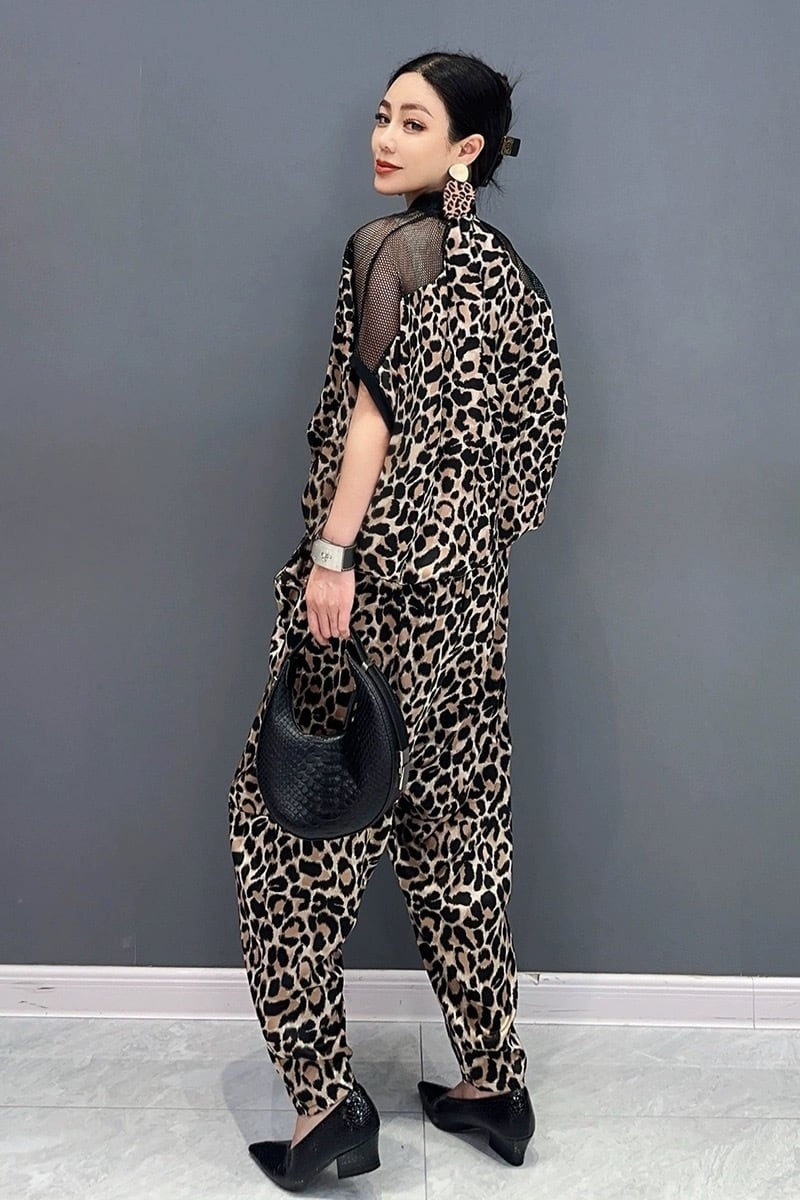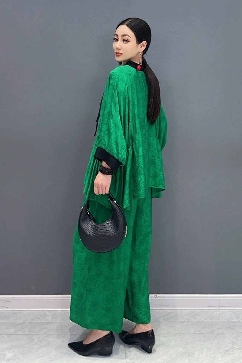 【セットアップ】レオパード ヒョウ柄 ブラウス パンツ スウェット カジュアル チャイナ 緑
