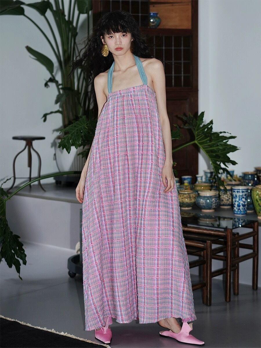 ピンク マキシ ワンピース 水色 リボン チェック ガーリー マキシ ゆったり