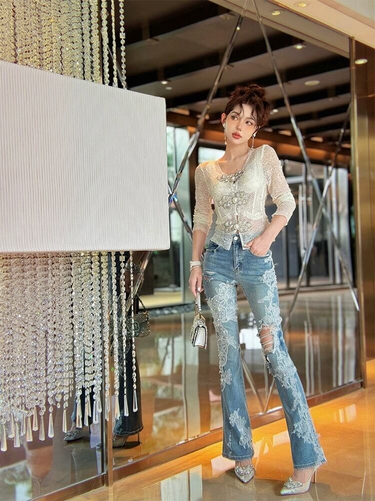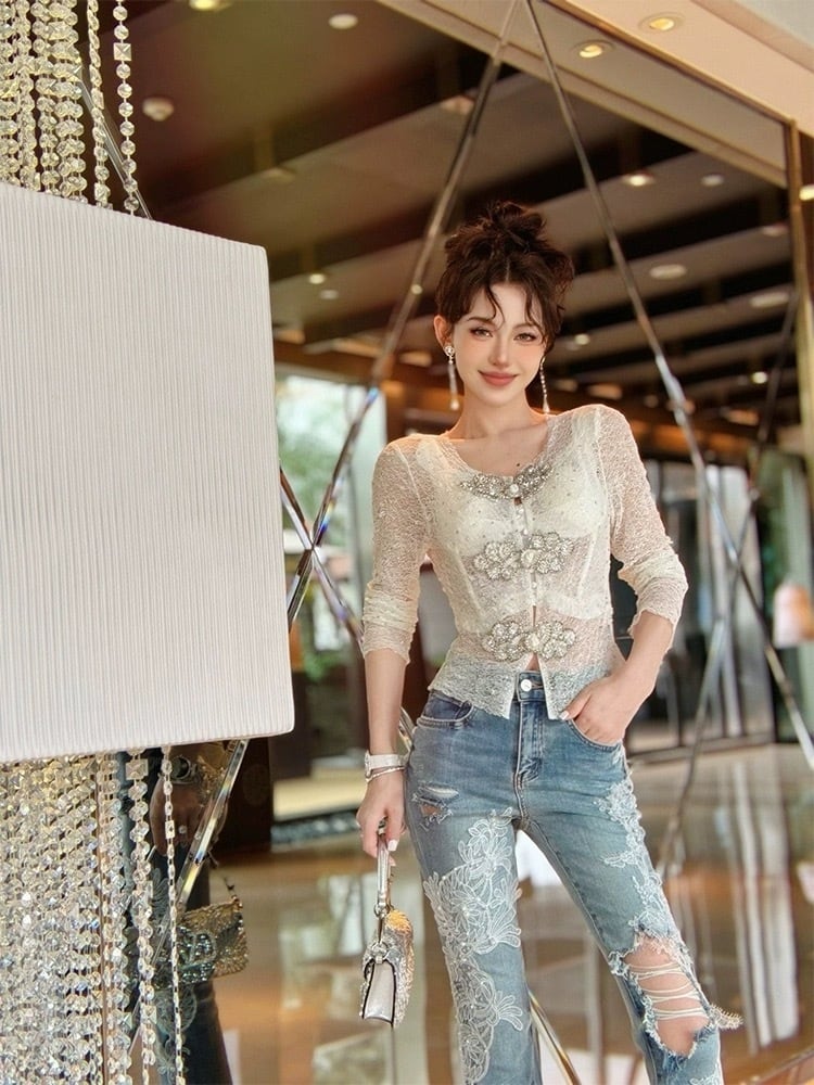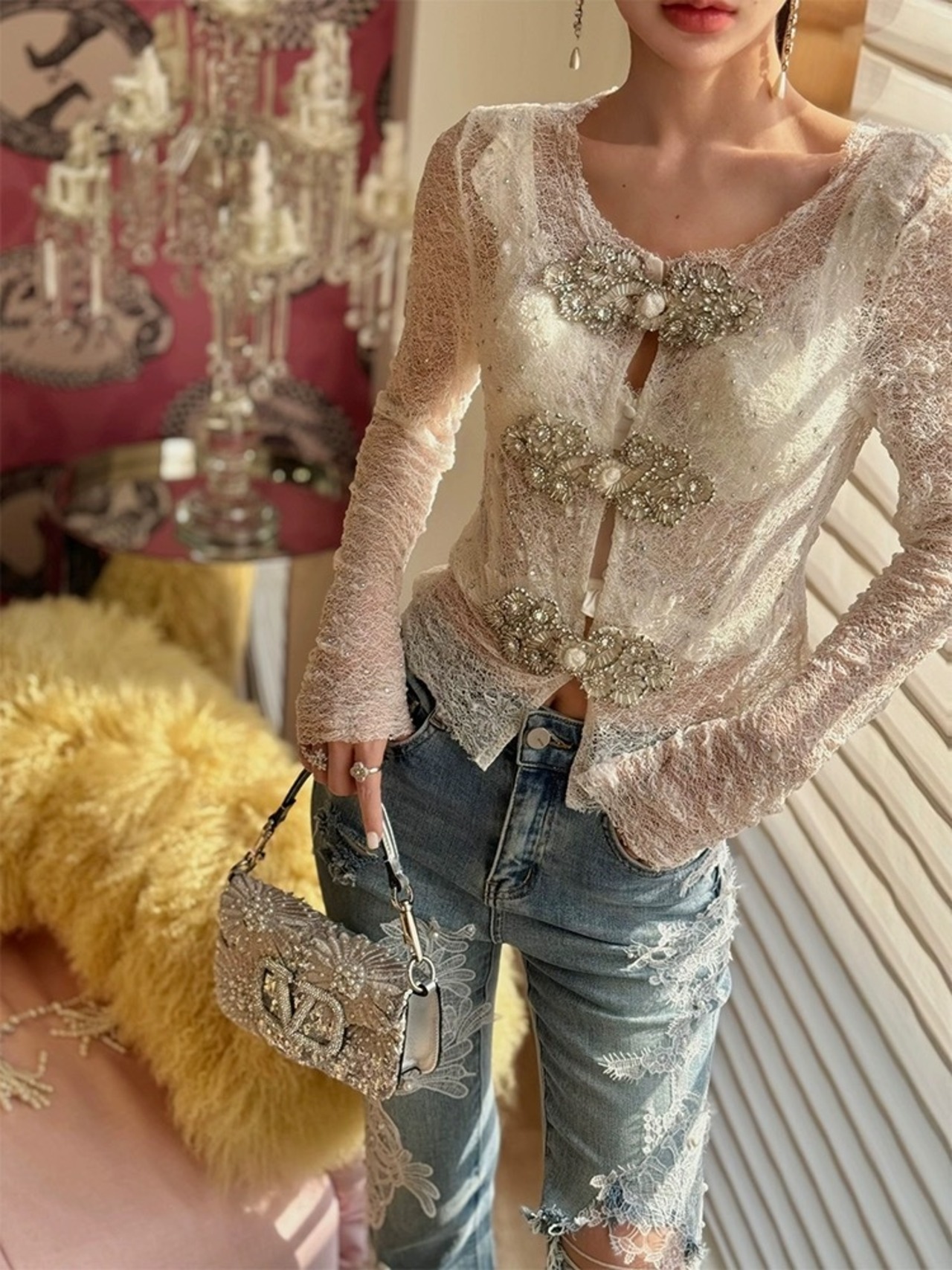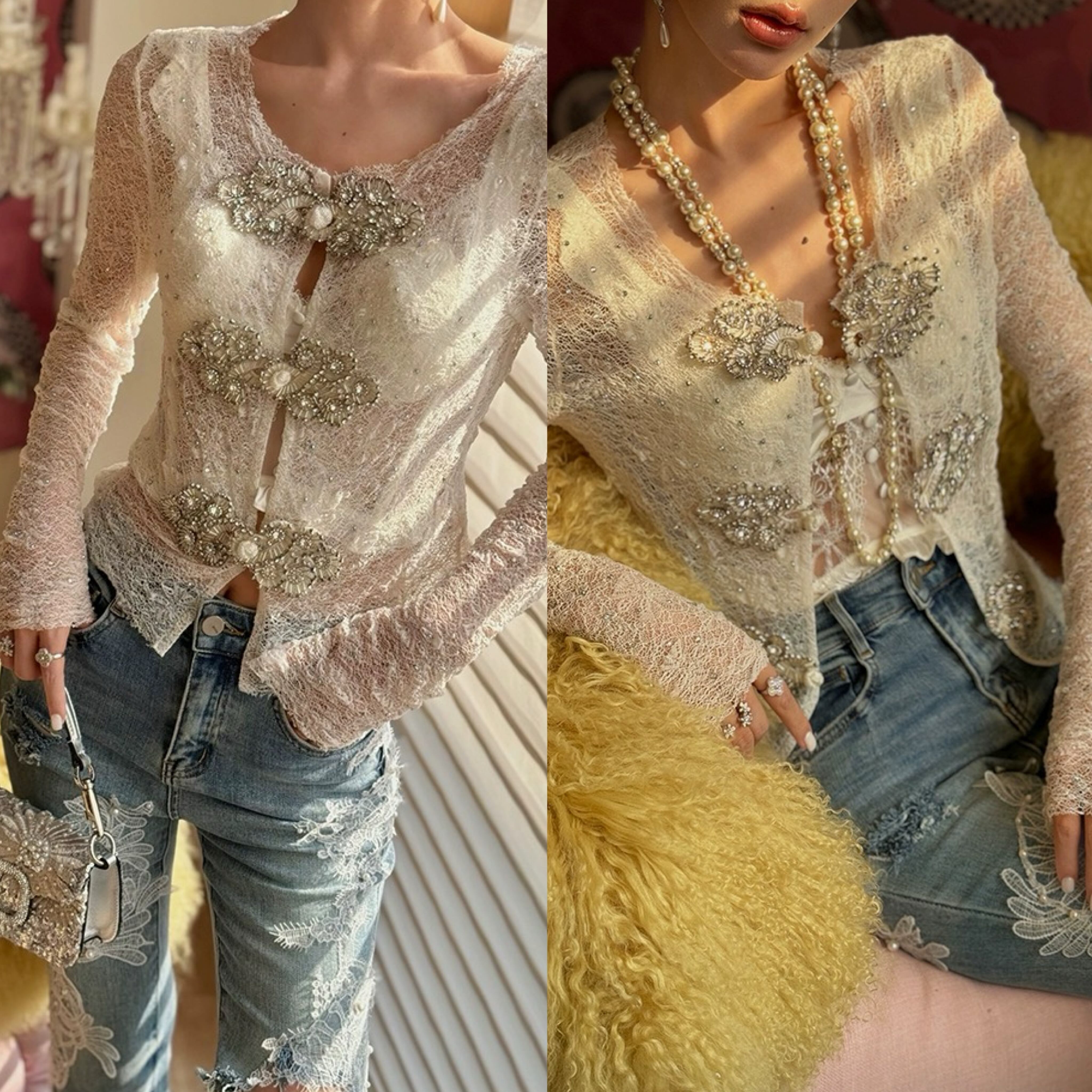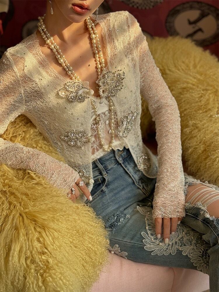 キラキラ ブラウス シースルー カーディガン 白 レース フラワー 花柄 ラインストーン ラメ カーディガン