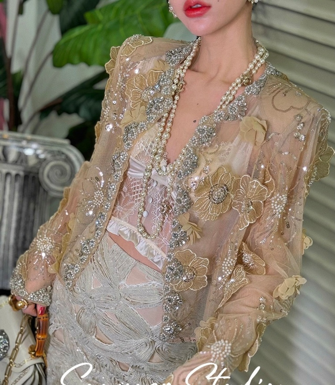 【ジャケット】シースルー 花柄 フラワー ベージュ 白 キラキラ ラインストーン アウター ジャケット カーディガン