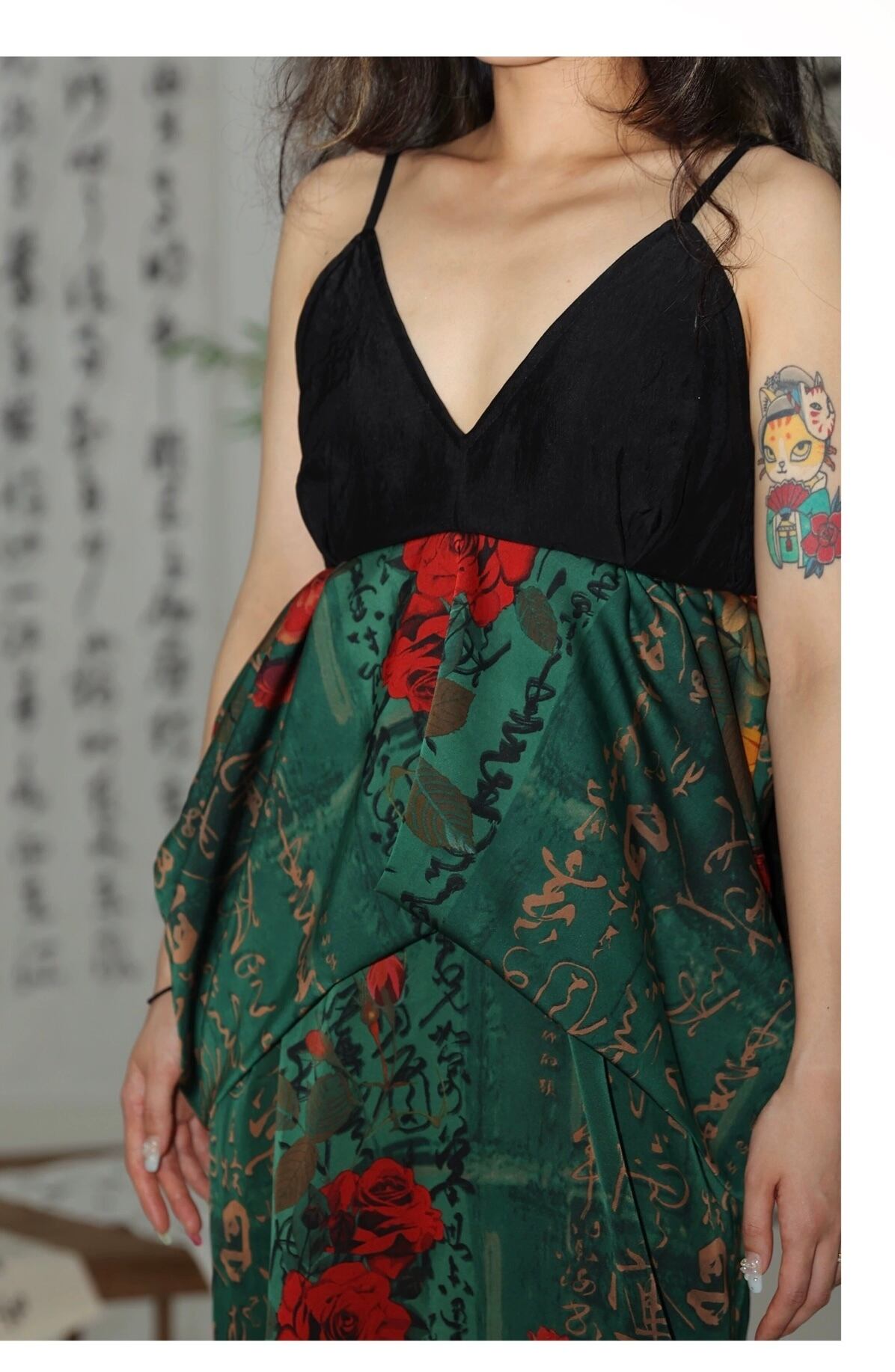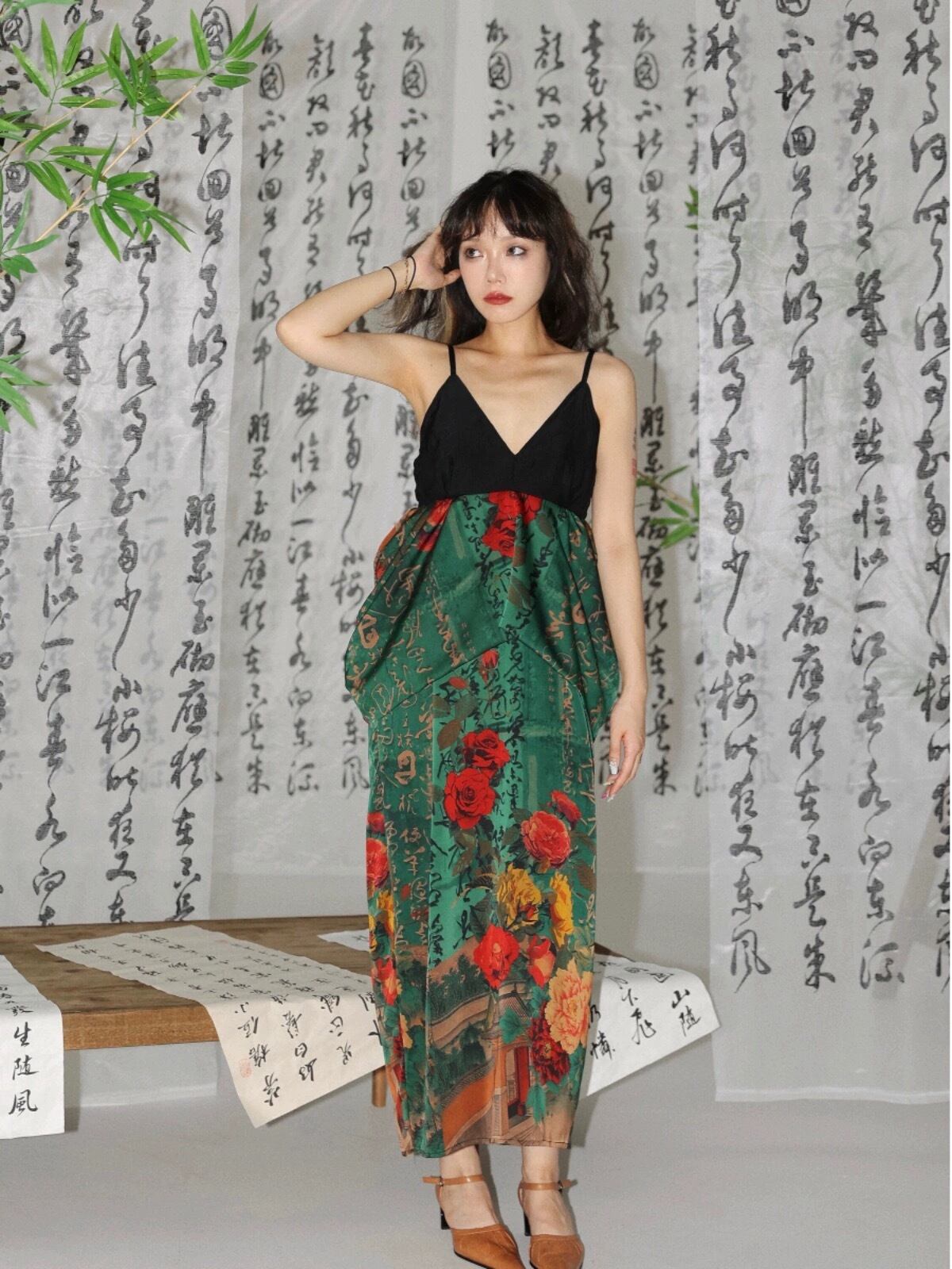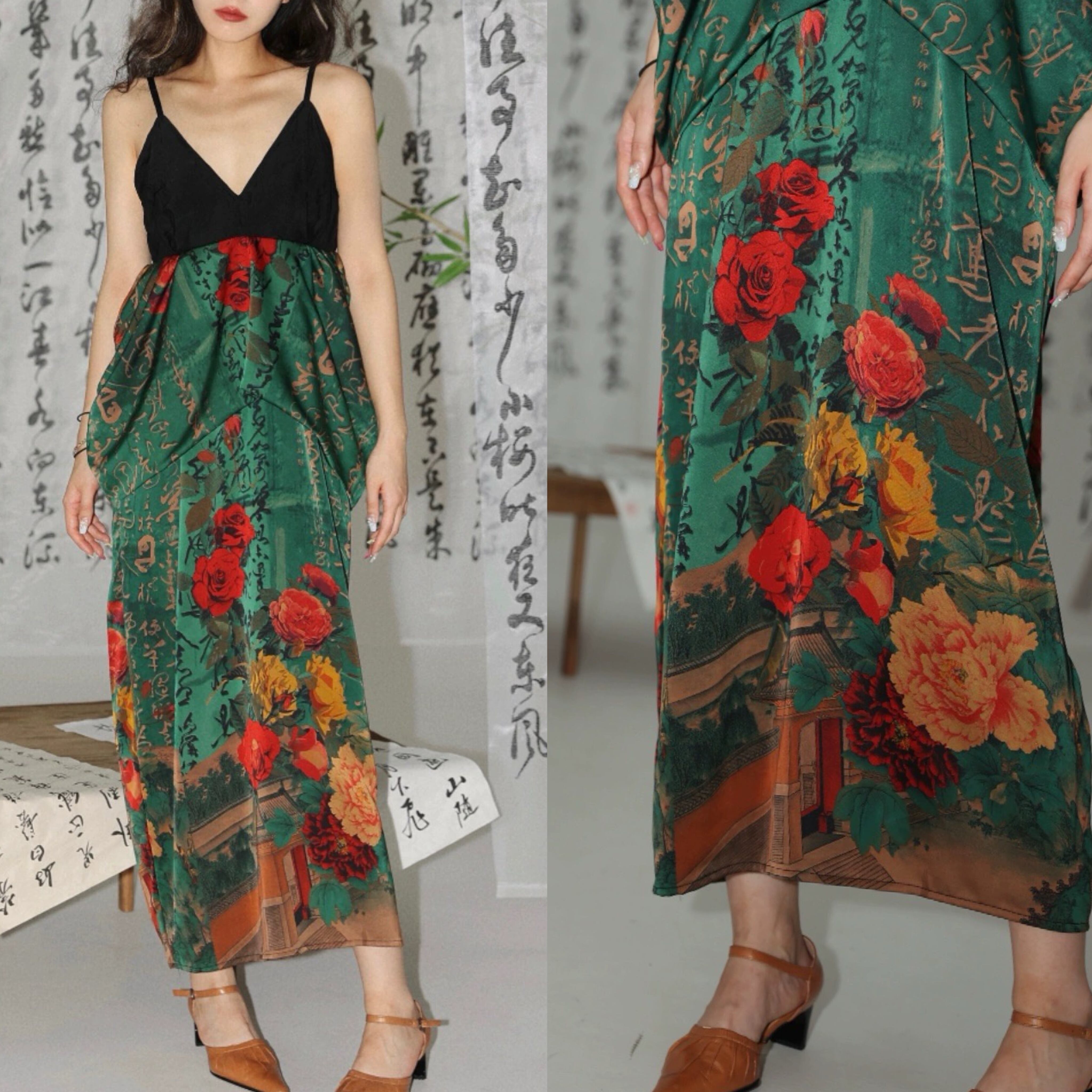緑 フラワー 花柄 赤 チャイナ ワンピース キャミソール エスニック