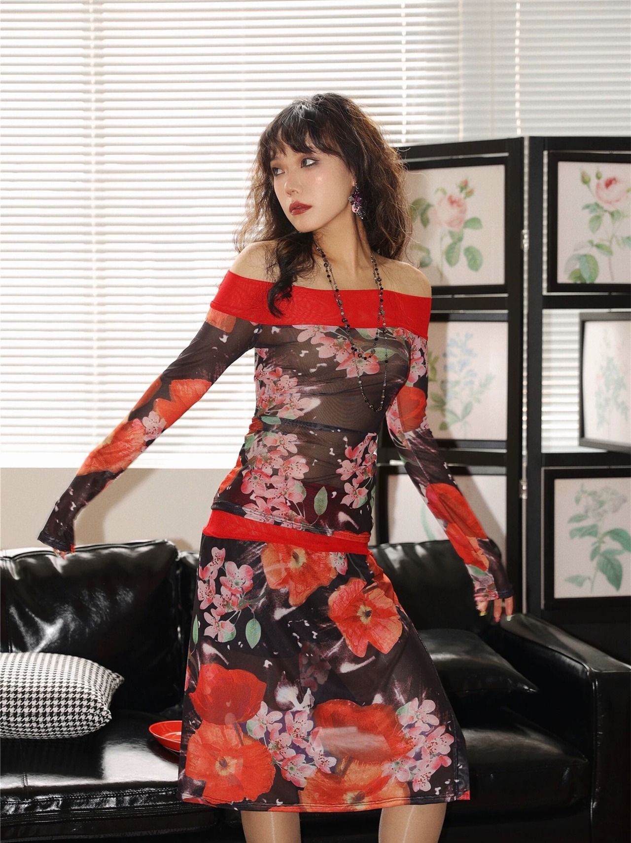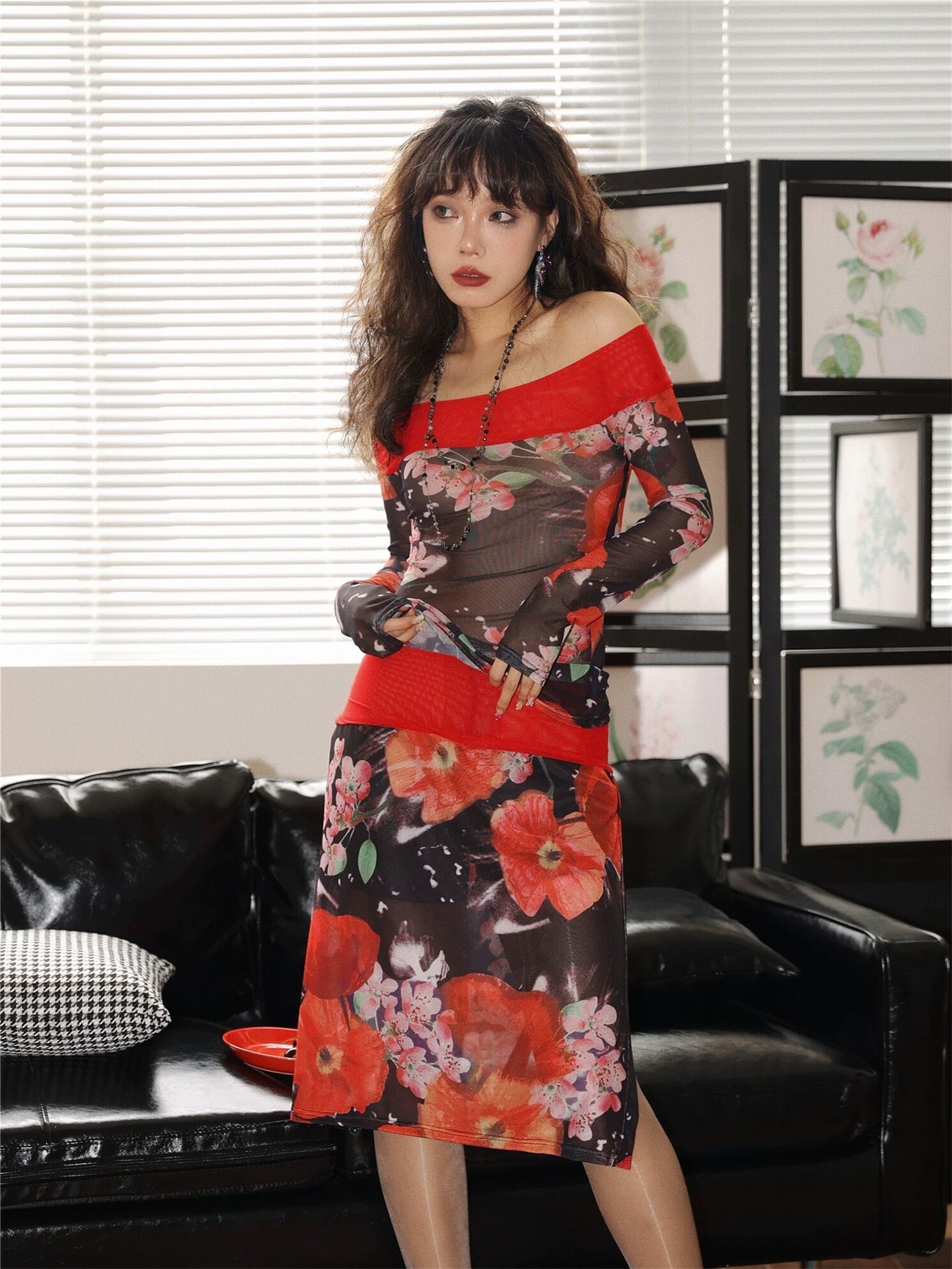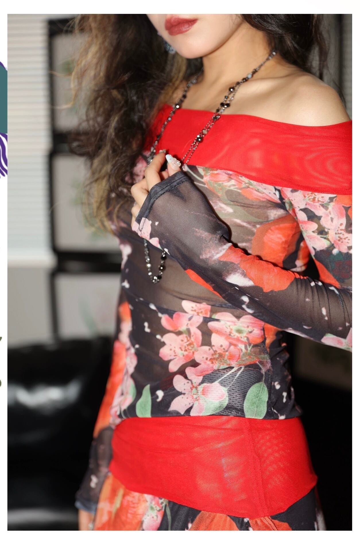 赤 オフショルダー トップス ブラウス スカート 花柄 赤 和柄 浴衣 セットアップ チャイナ
