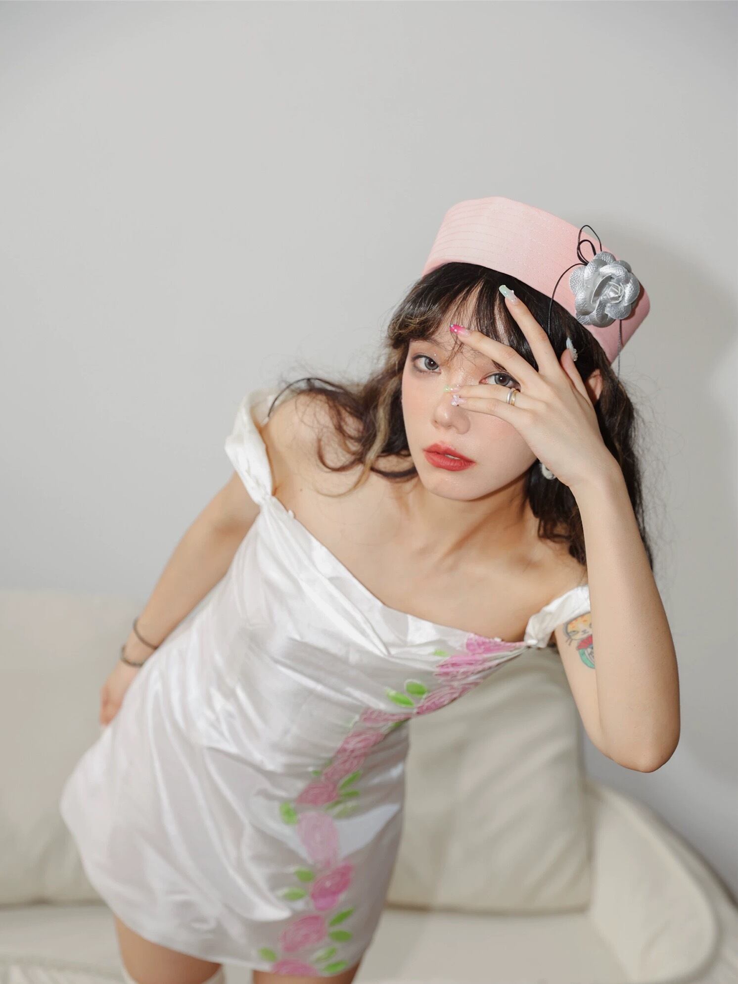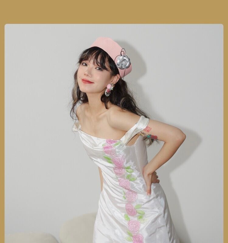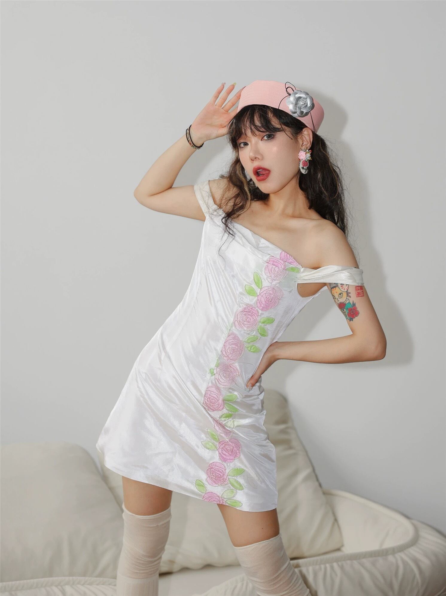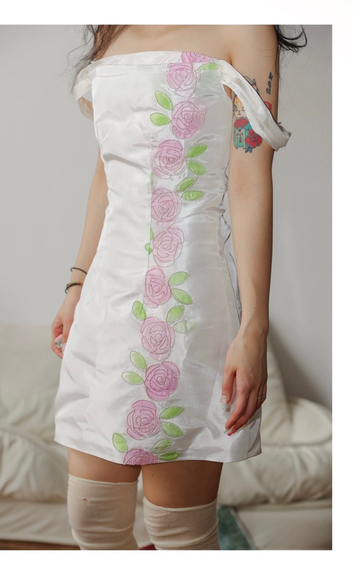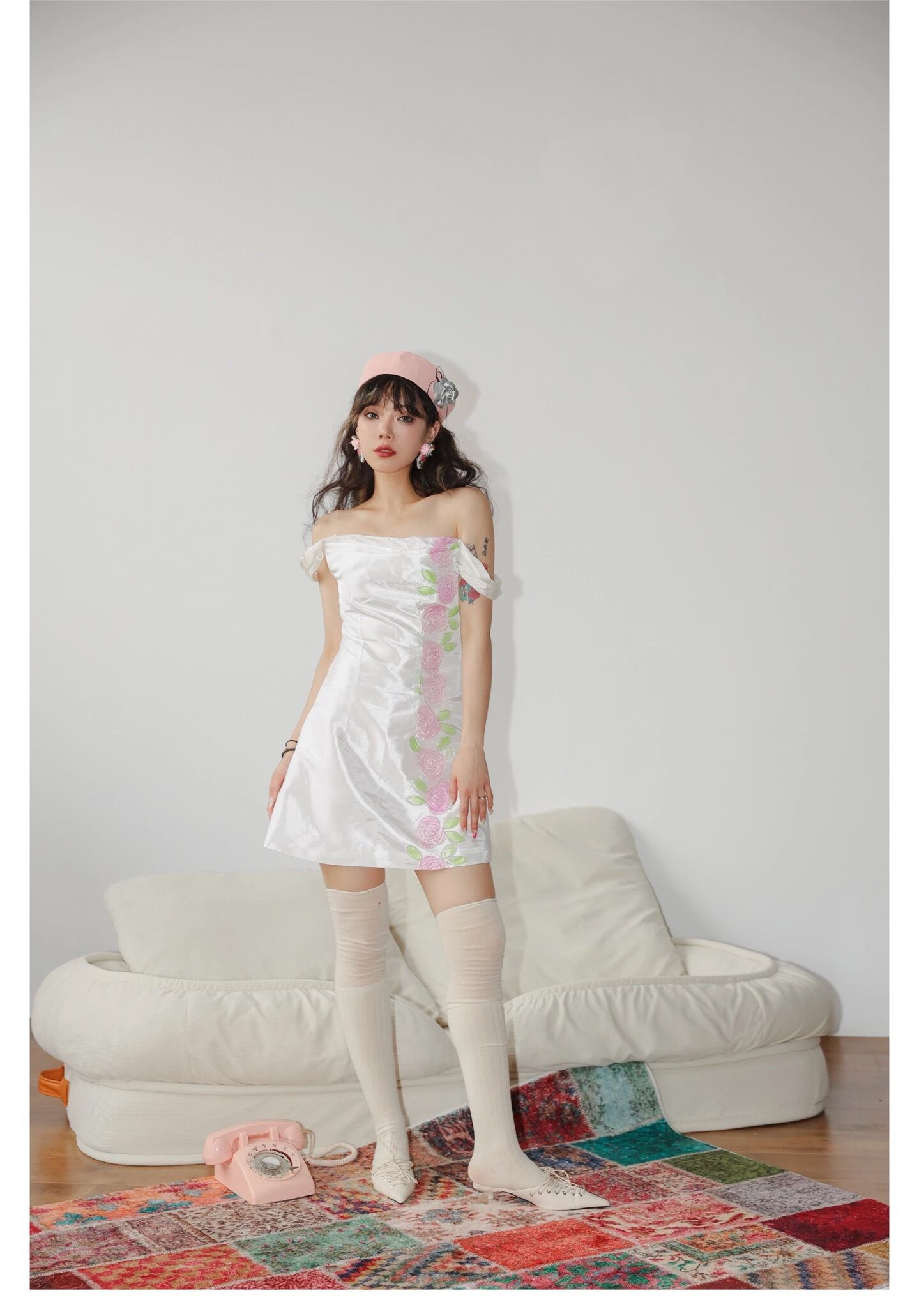 白 オフショルダー 薔薇 花柄 フラワー レトロ ガーリー チャイナ