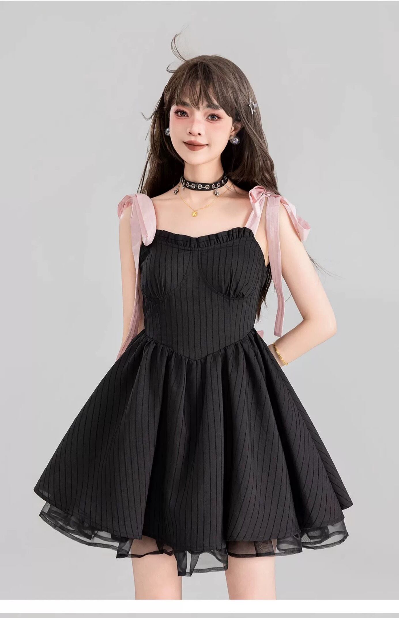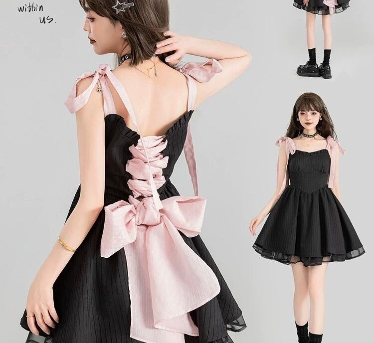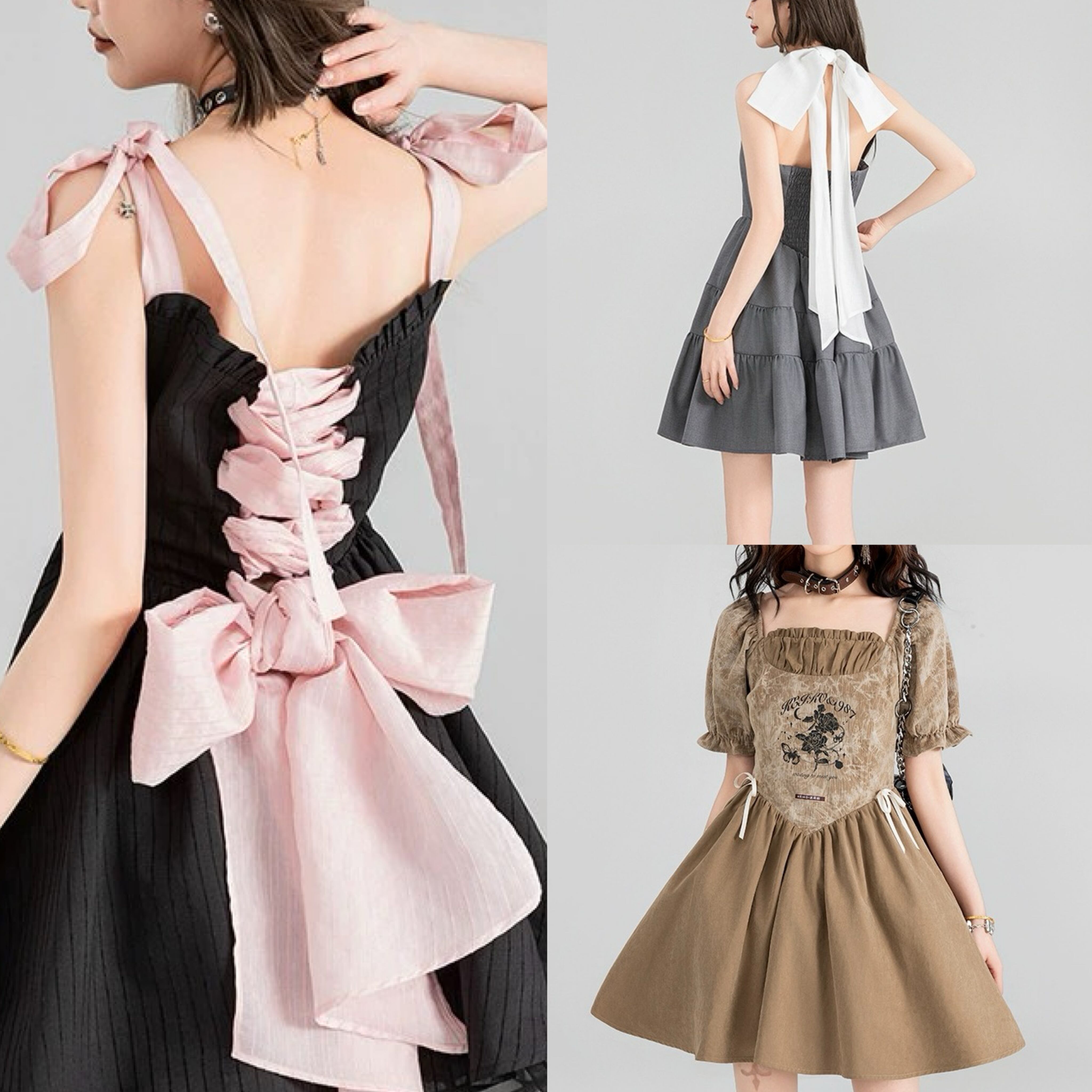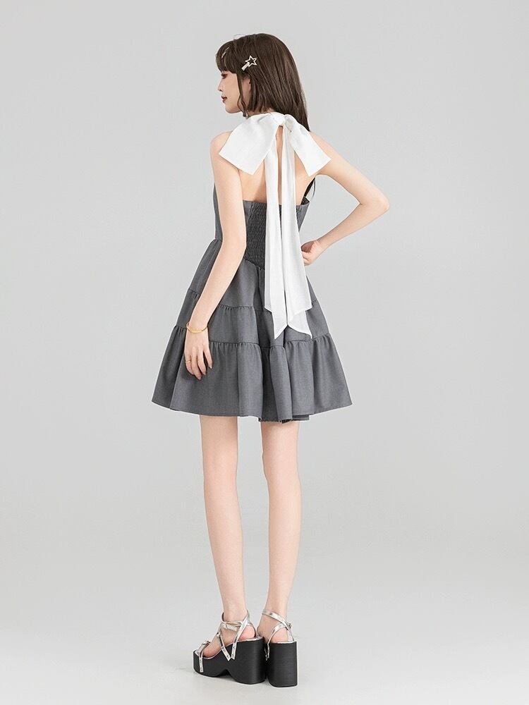 可愛い ガーリー ワンピース リボン グレー 黒 ベージュ 茶色