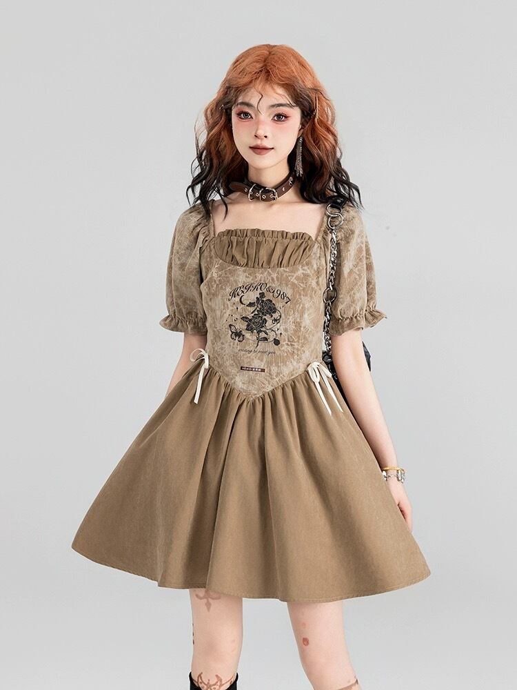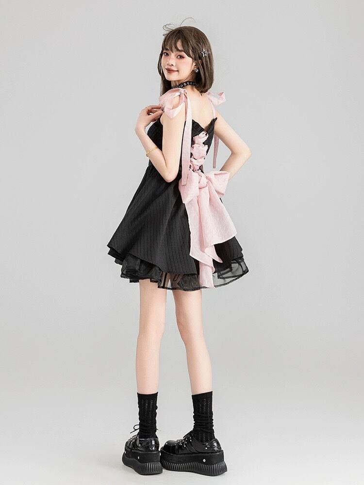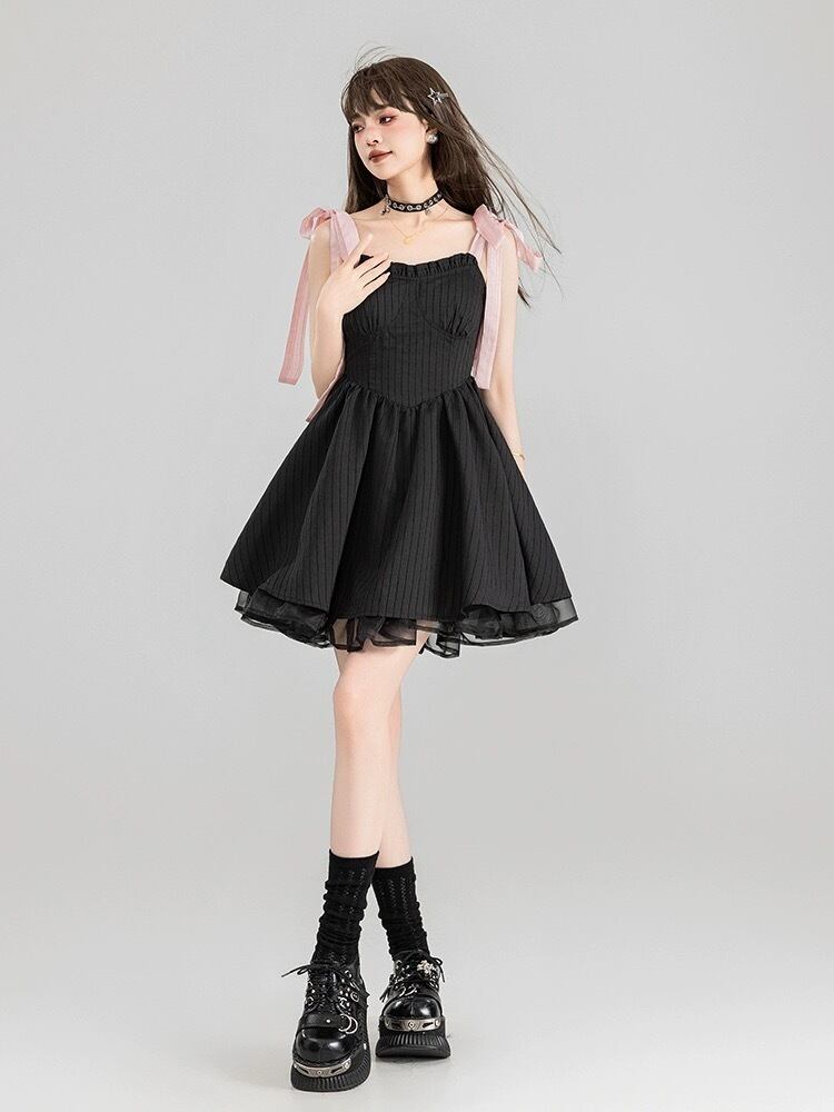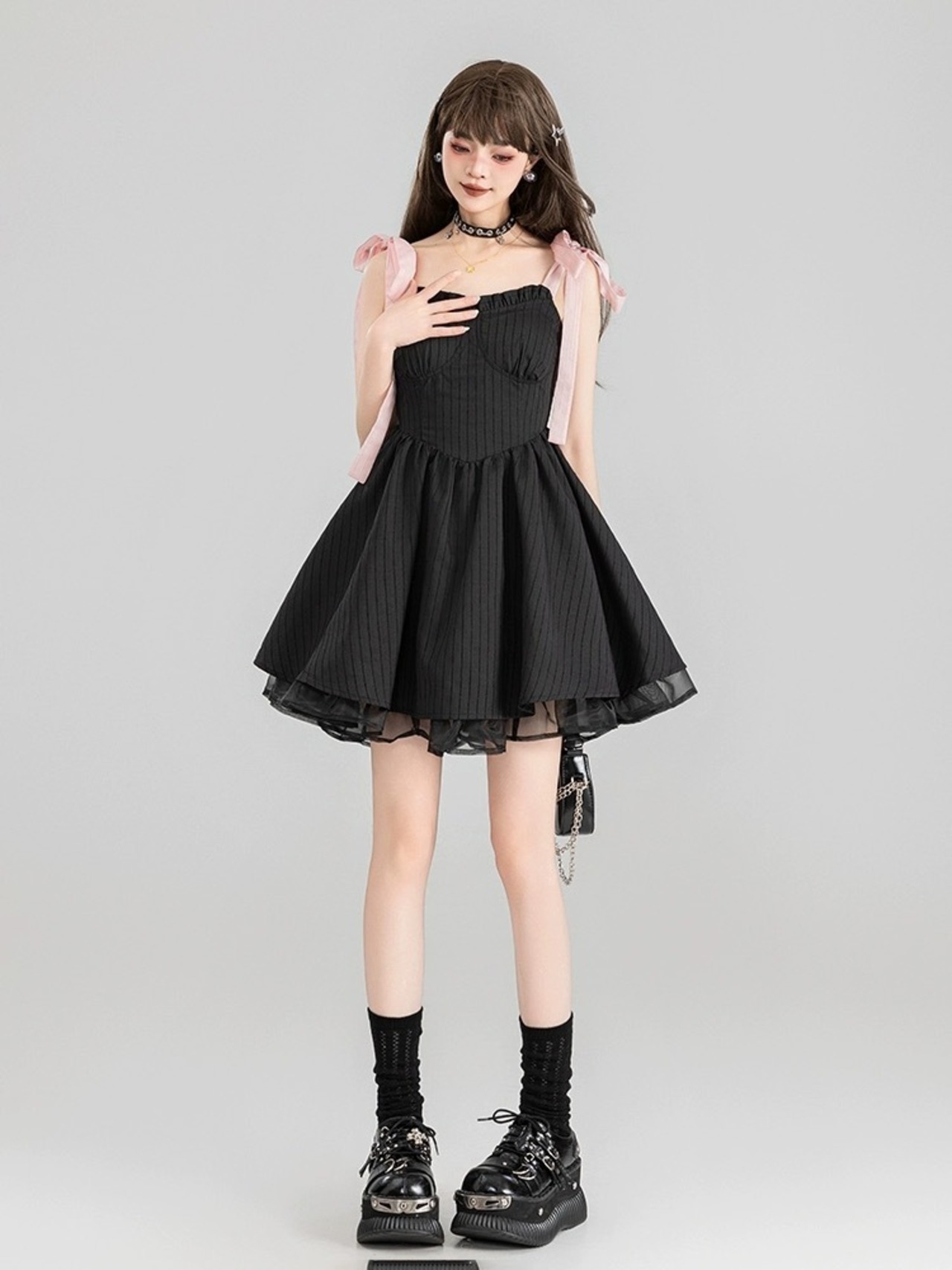可愛い ガーリー ワンピース リボン グレー 黒 ベージュ 茶色