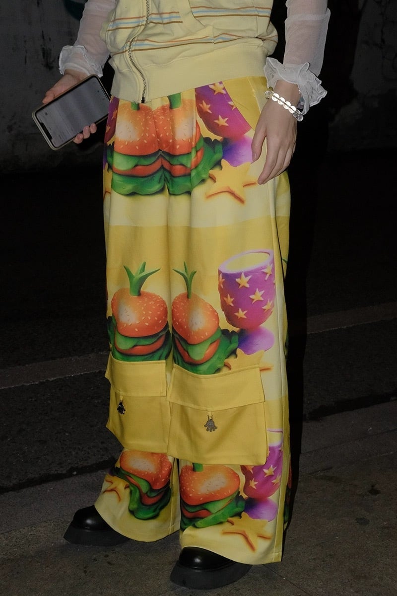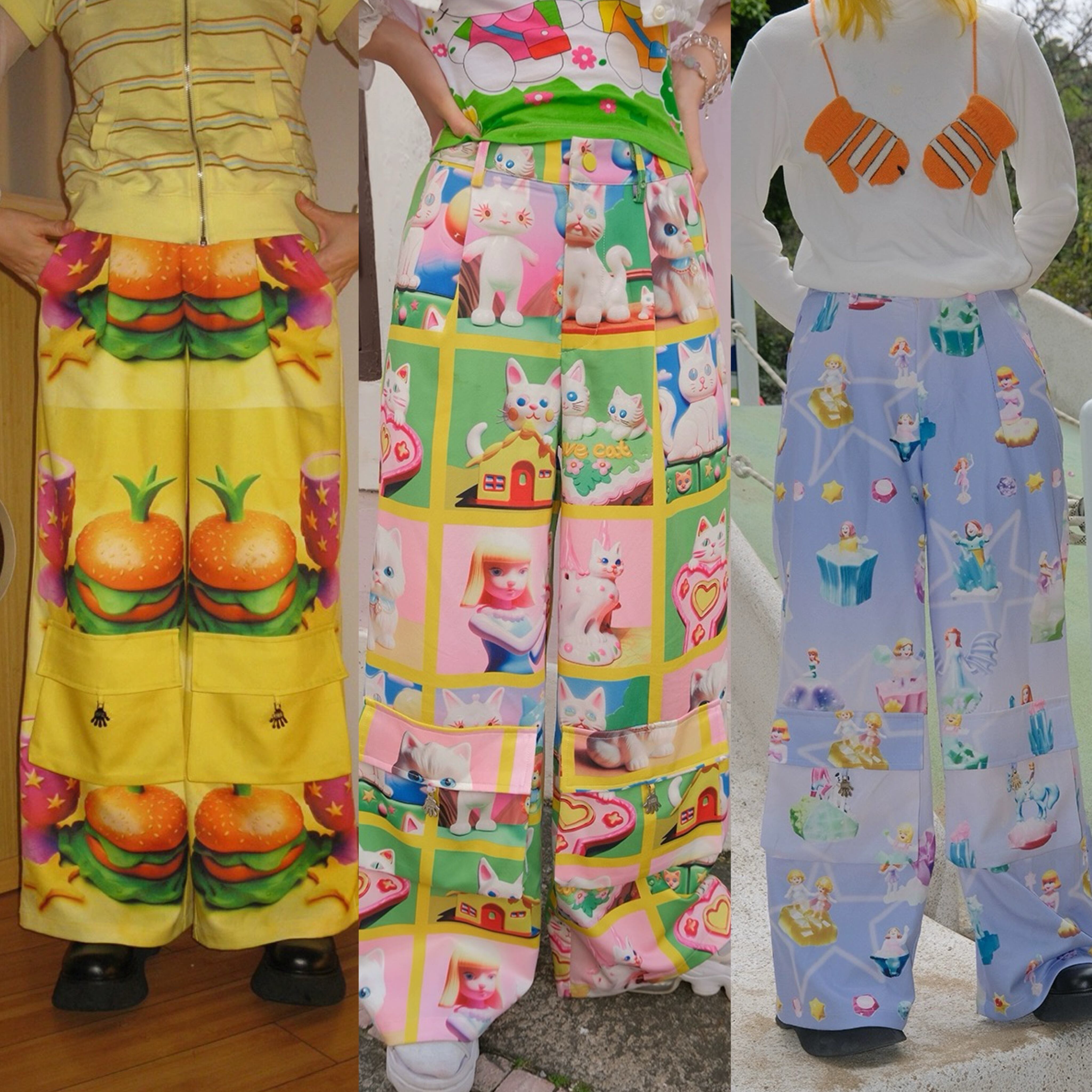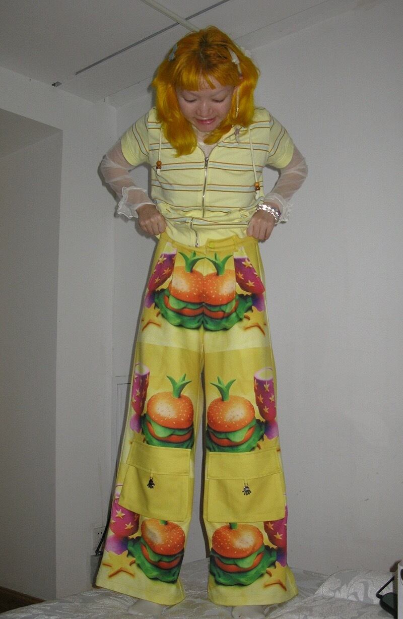 黄色 緑 チェック ハンバーガー 水色 ぬいぐるみ 原宿 可愛い ボトムス ズボン スウェット レトロ