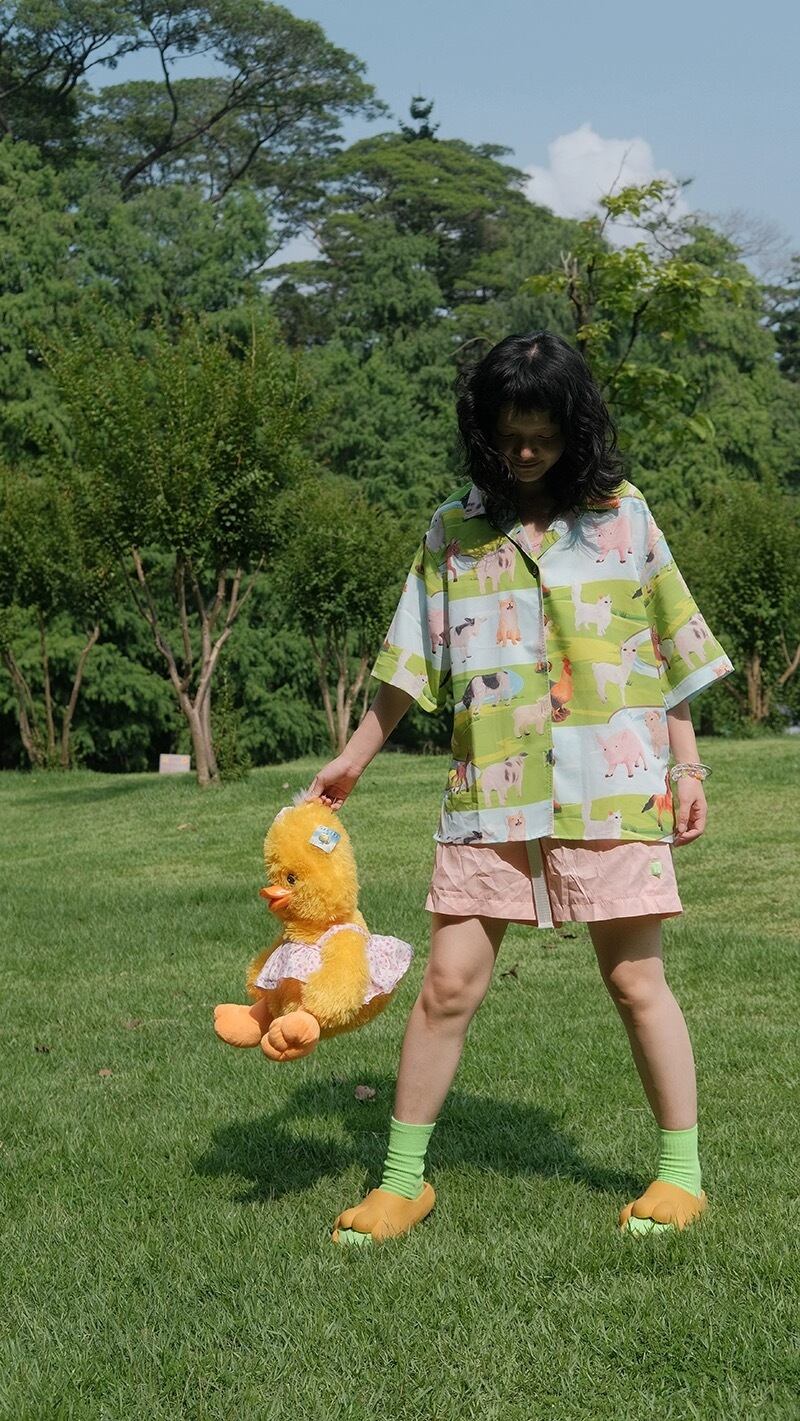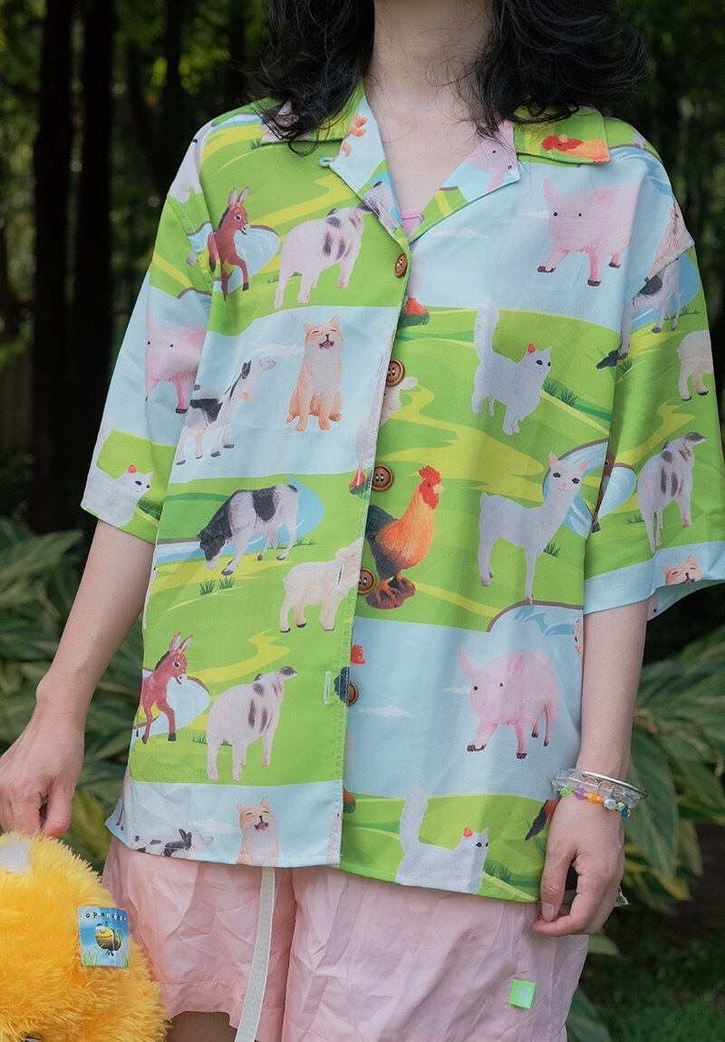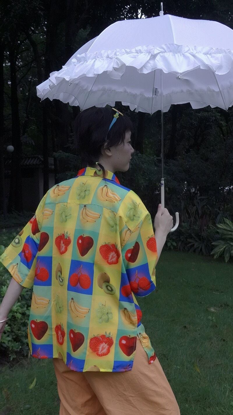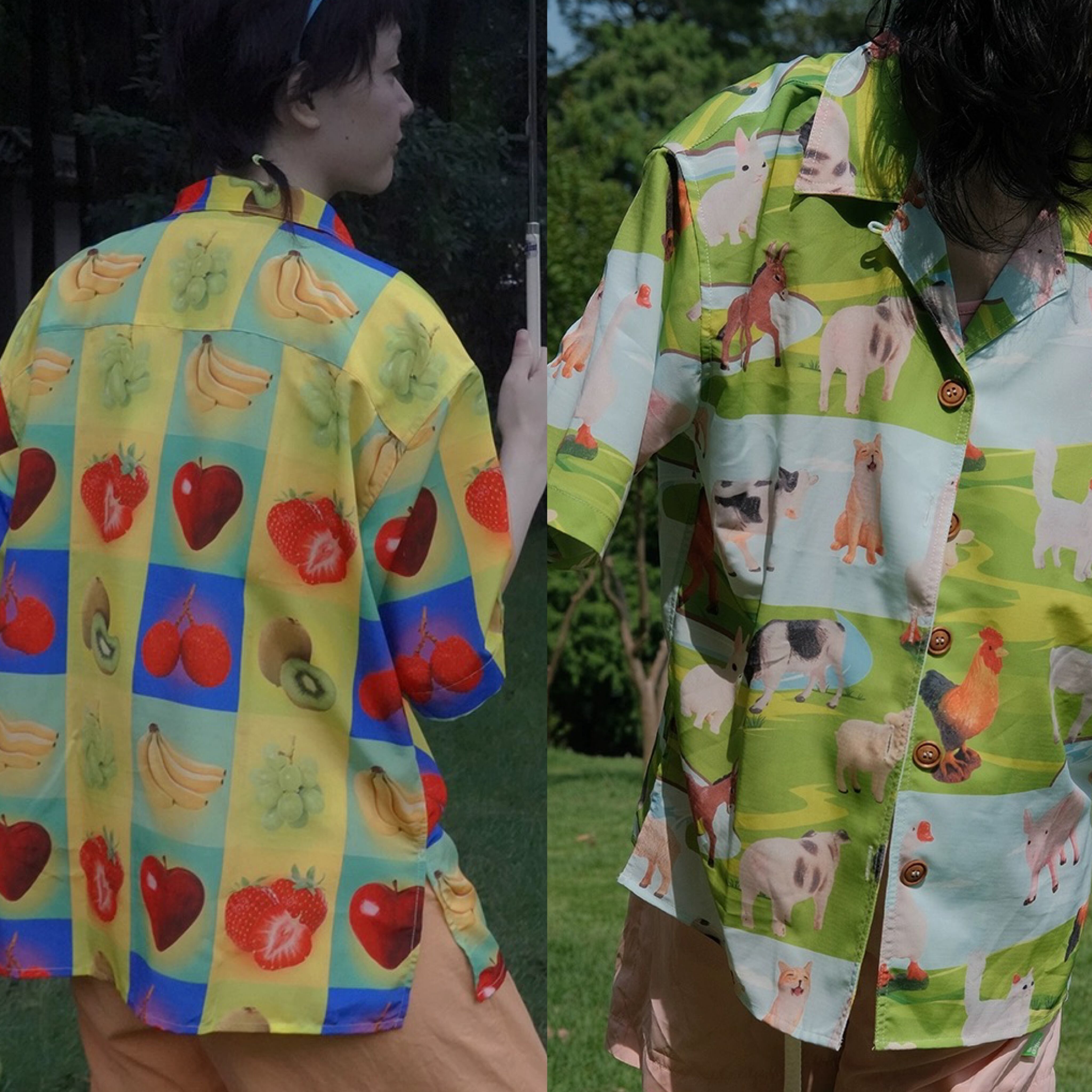 黄色 緑 フルーツ チェック 牧場 アニマル 黄色 緑 ハンバーガー アメリカン シャツ XL 原宿 ブラウス トップス アロハ レトロ カラフル グルメ いちご さくらんぼ 草
