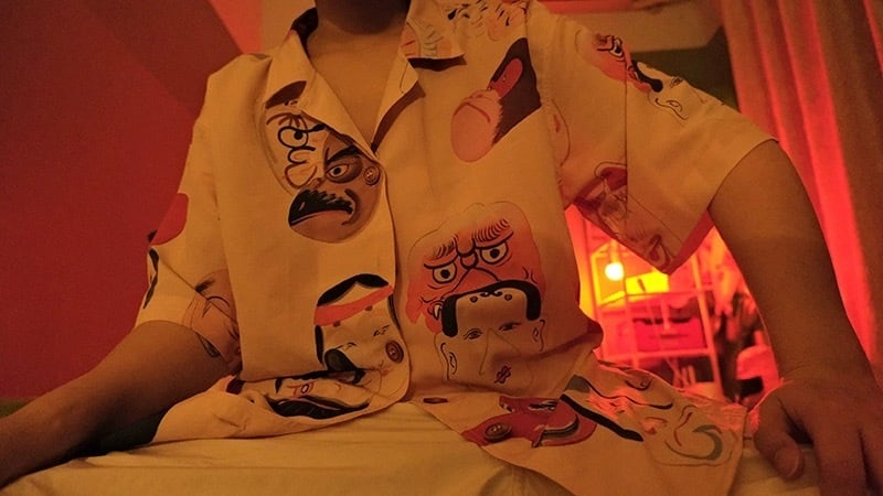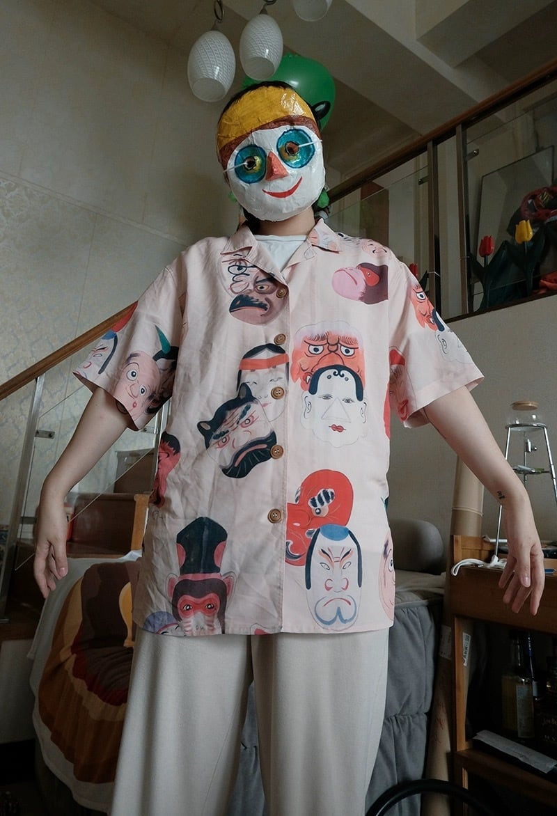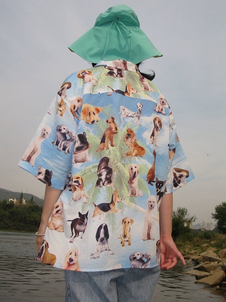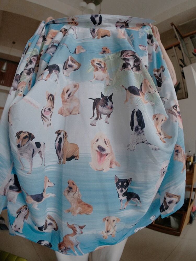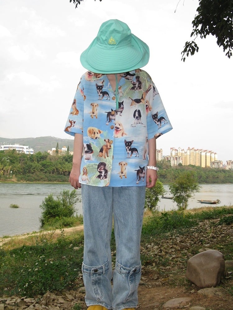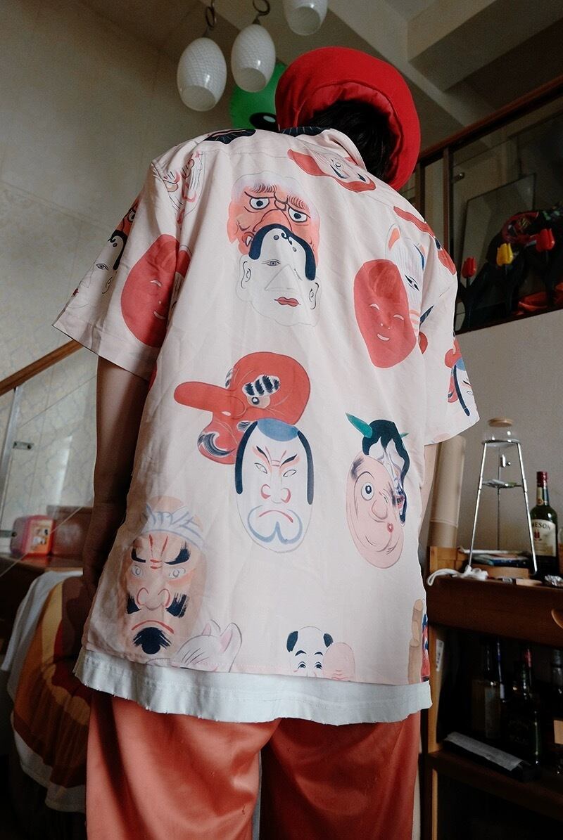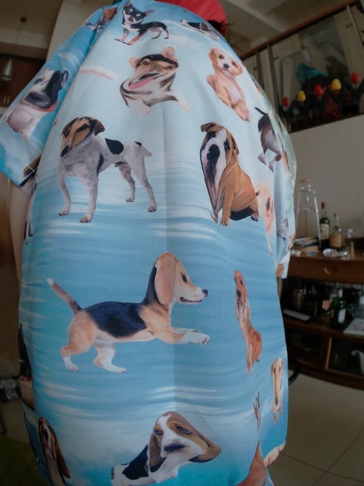 お祭り お面 和柄 水色 犬 ペット 黄色 緑 ハンバーガー アメリカン シャツ XL 原宿 ブラウス トップス アロハ レトロ カラフル グルメ ブルドッグ 夏祭り チワワ ダックス グラデーション