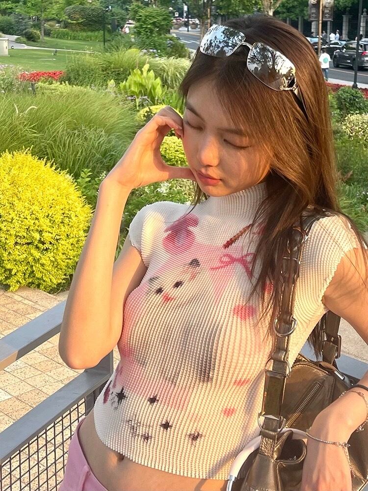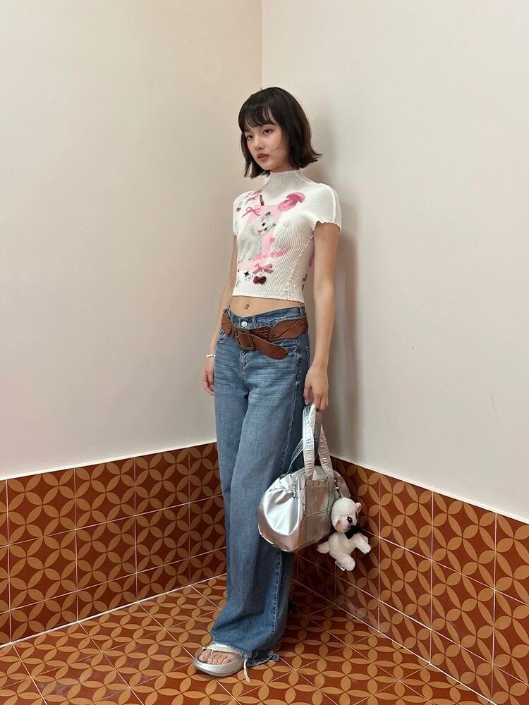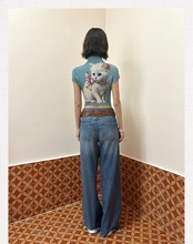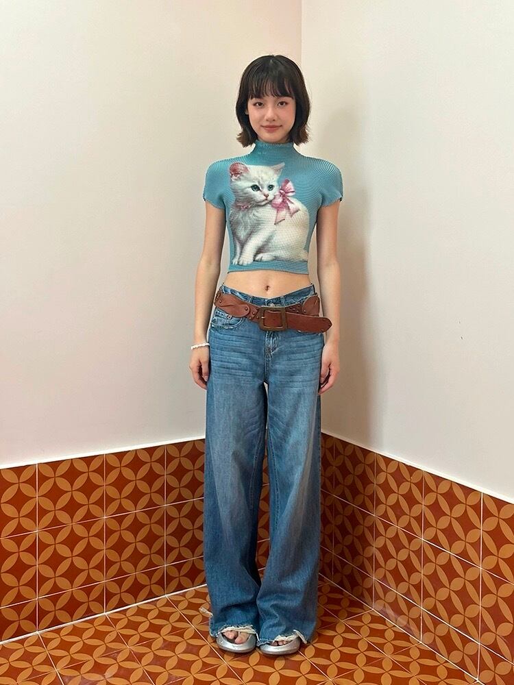 水色 ねこちゃん リボン ピンク Tシャツ ブラウス トップス ハイネック カジュアル Y2K ショート 原宿 可愛い