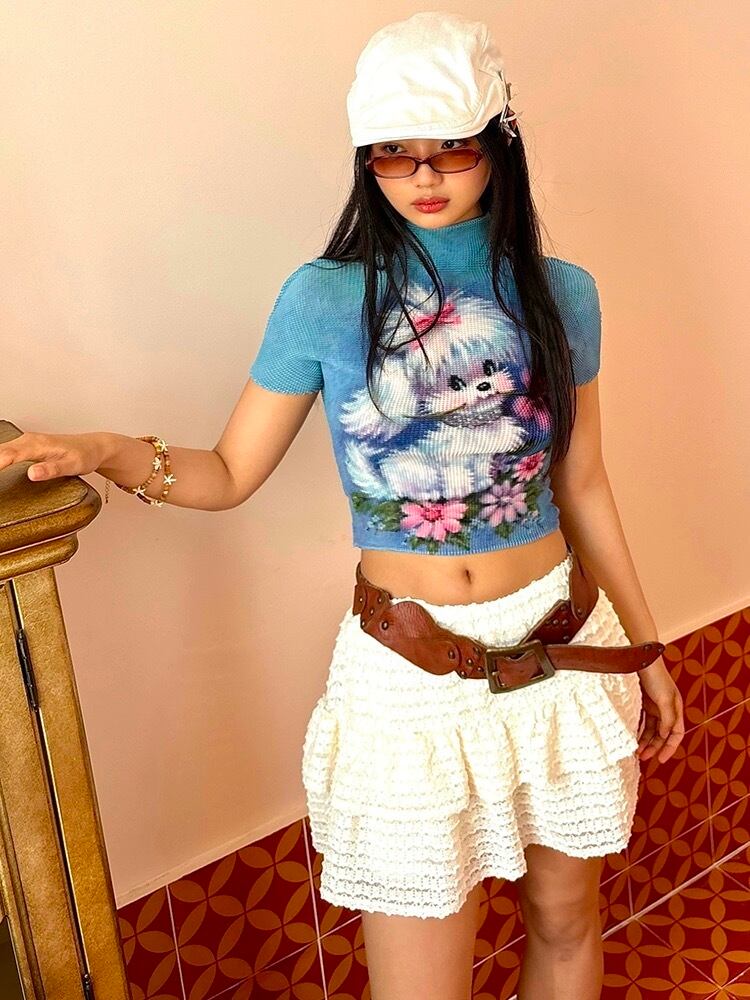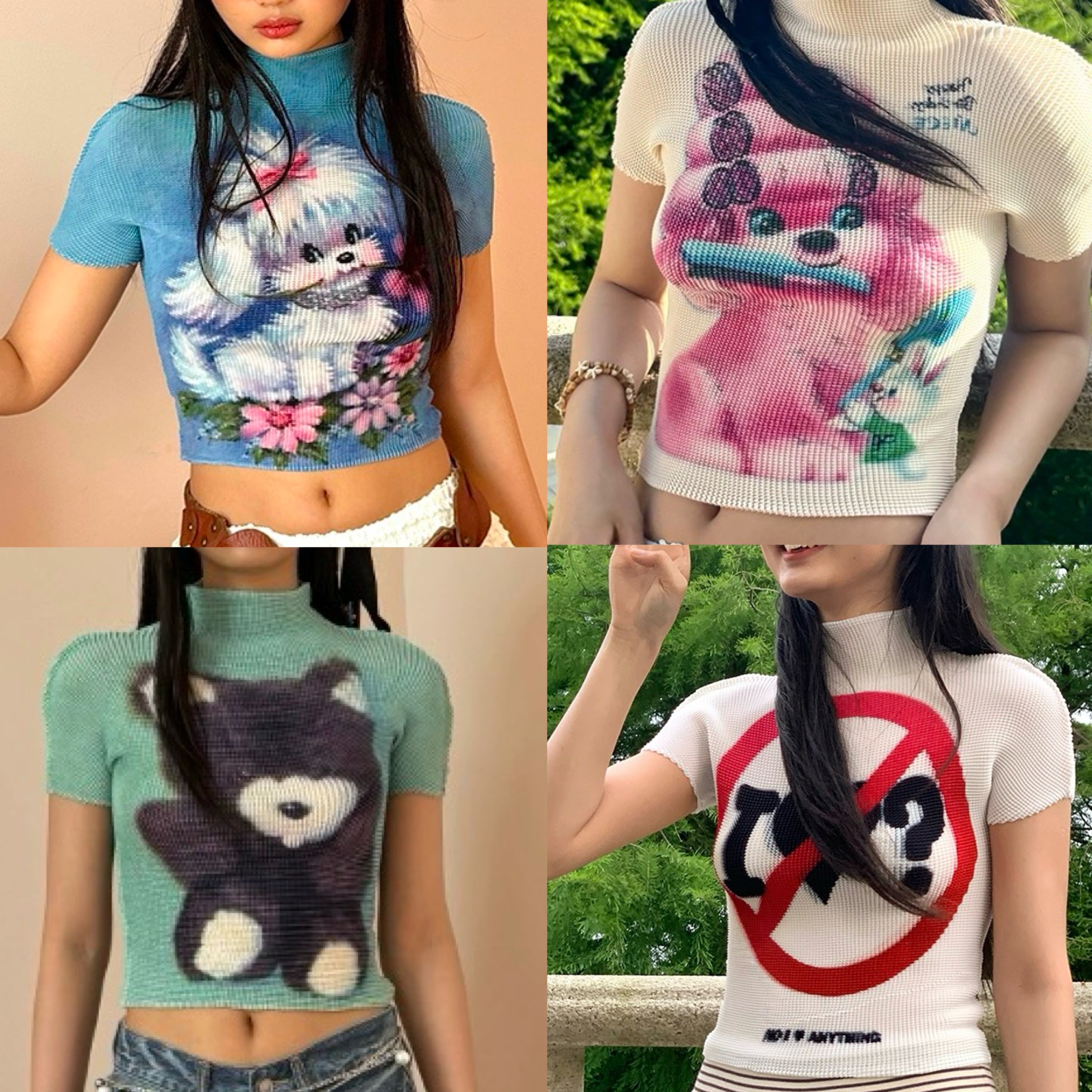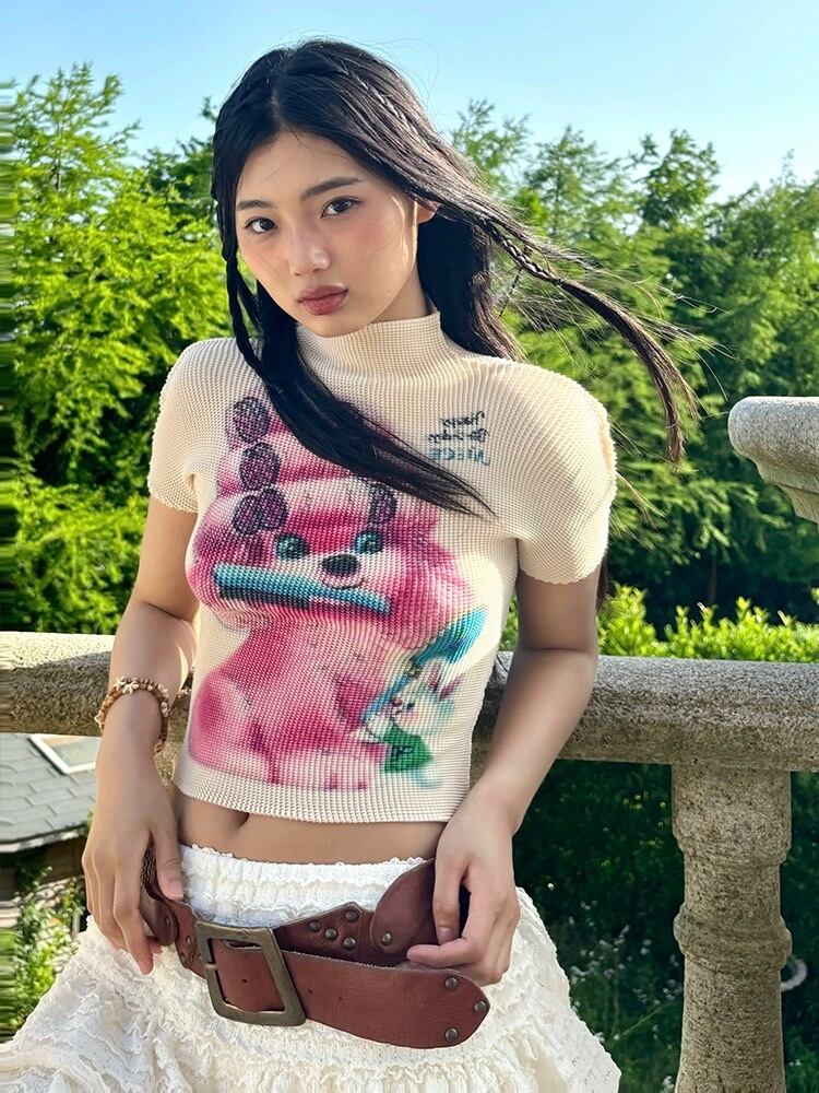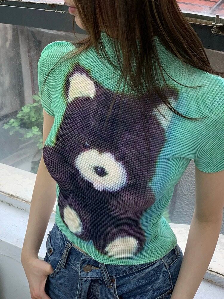 ピンク いぬ くま 緑 クエスチョン 標識 白 水色 ねこちゃん リボン ピンク Tシャツ ブラウス トップス ハイネック カジュアル Y2K ショート 原宿 可愛い 水色