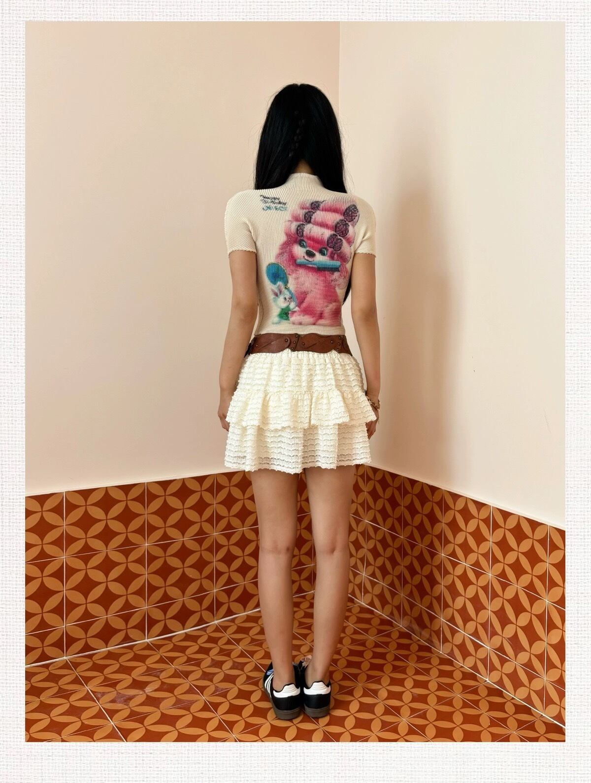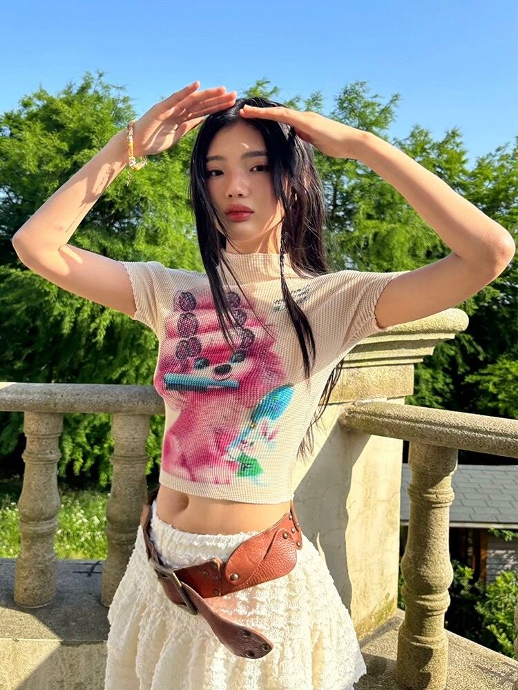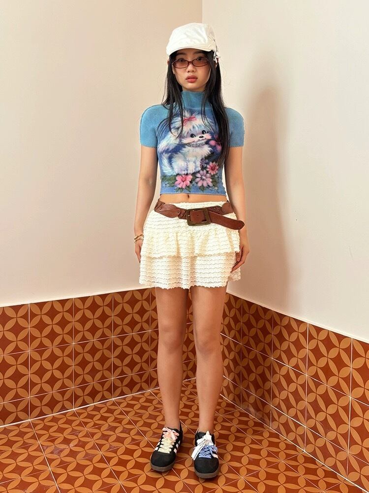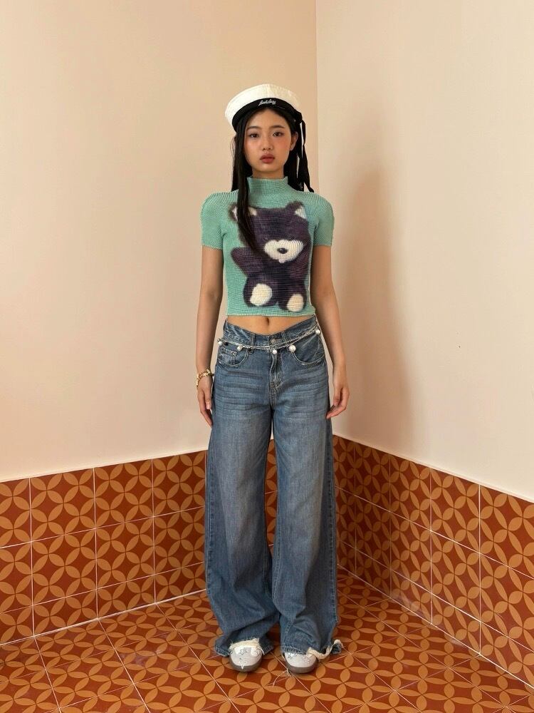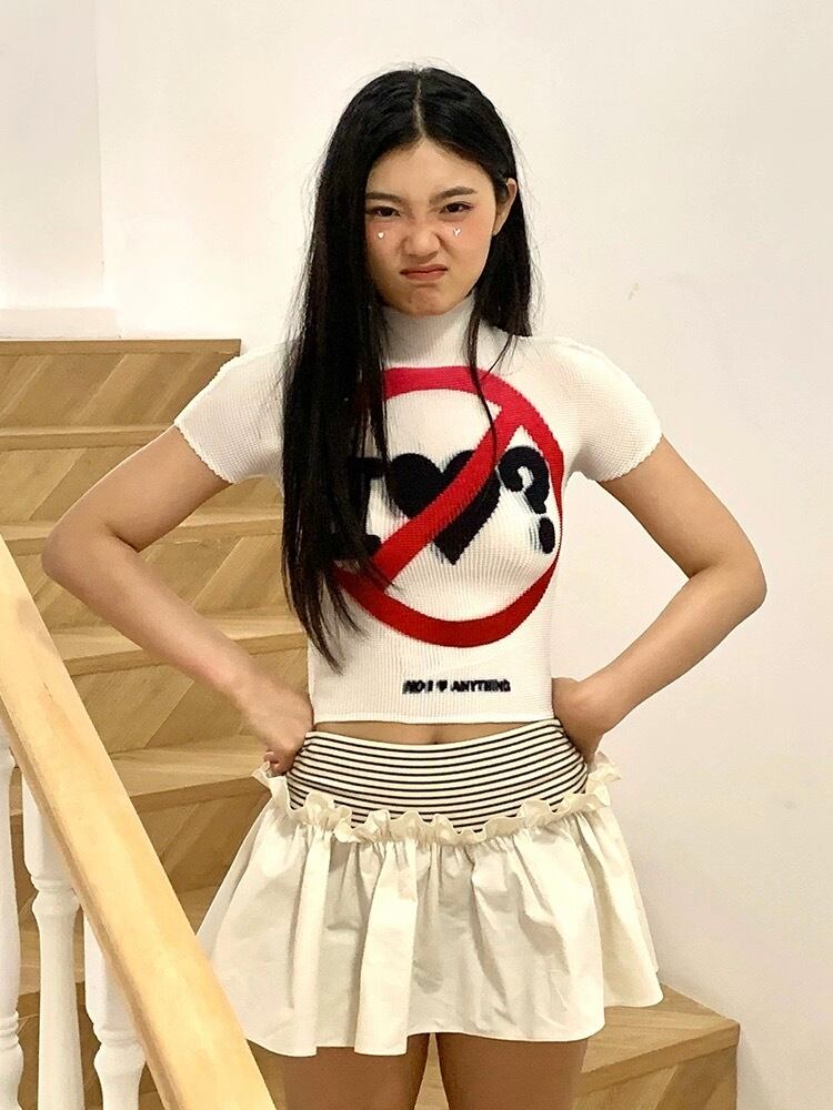 ピンク いぬ くま 緑 クエスチョン 標識 白 水色 ねこちゃん リボン ピンク Tシャツ ブラウス トップス ハイネック カジュアル Y2K ショート 原宿 可愛い 水色