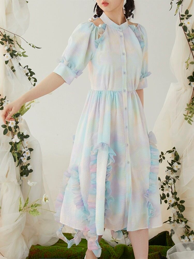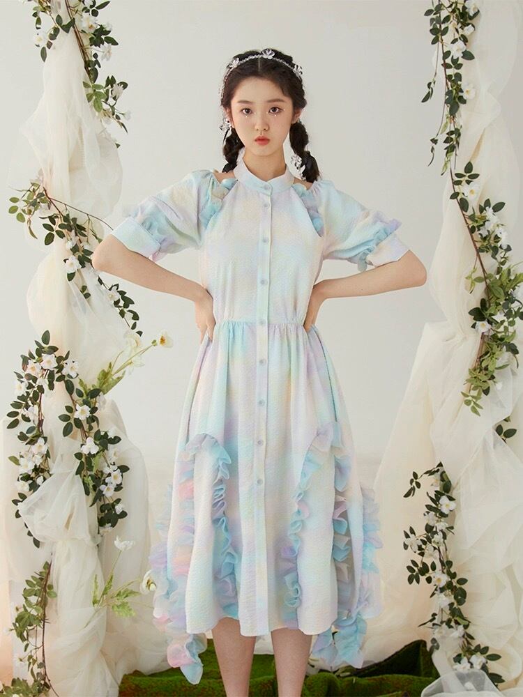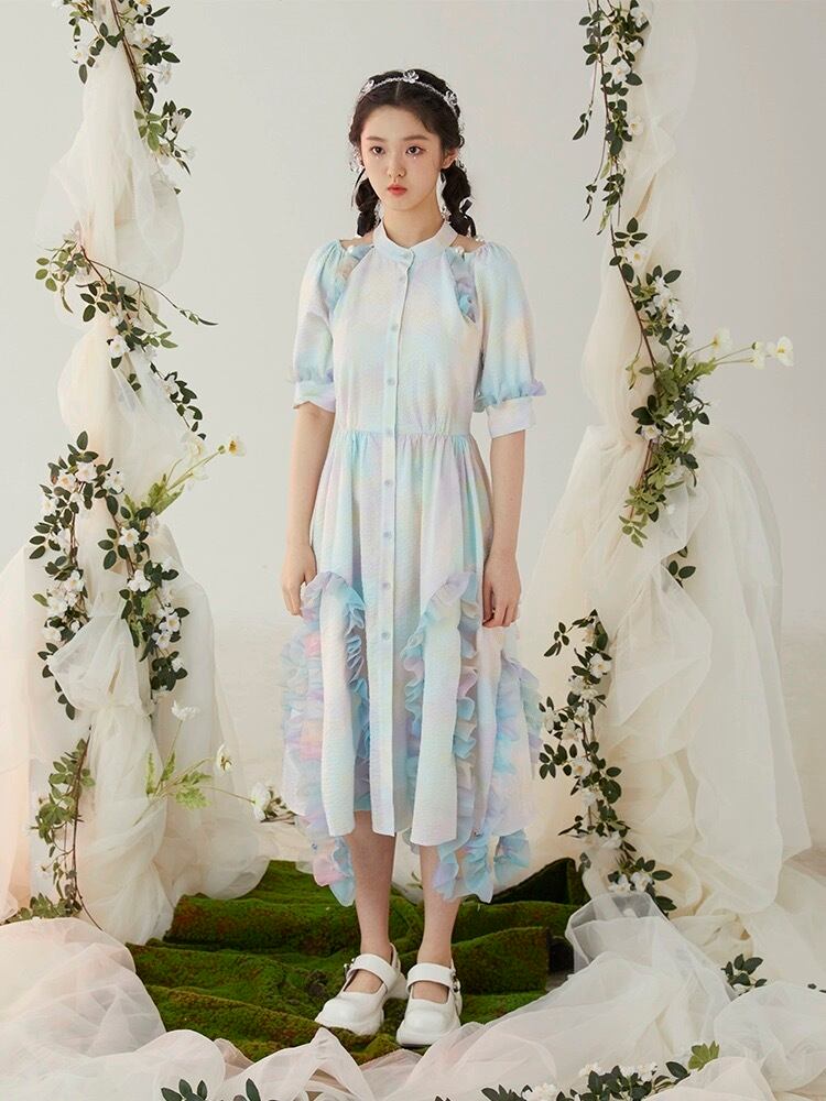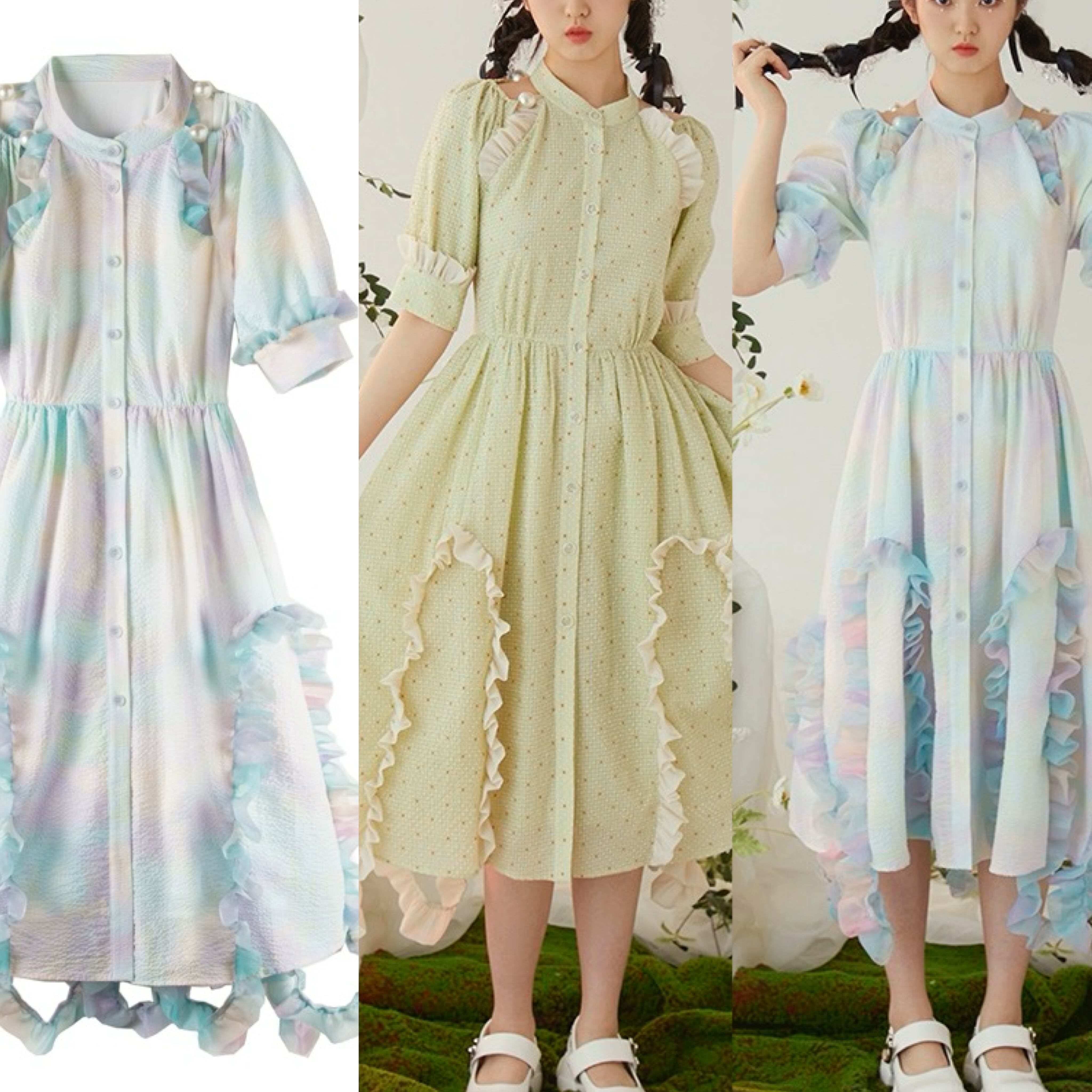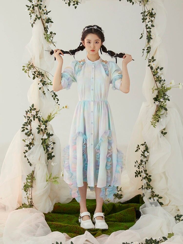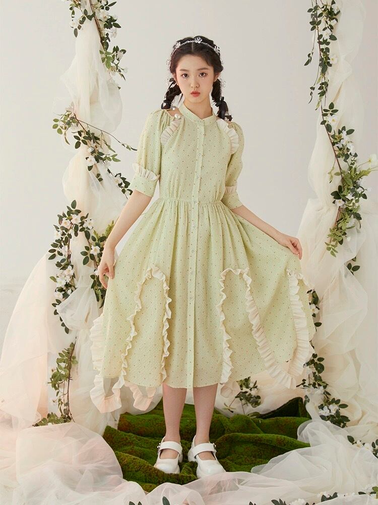 水色 ワンピース 緑 ブラウス ガーリー マキシ 可愛い 原宿