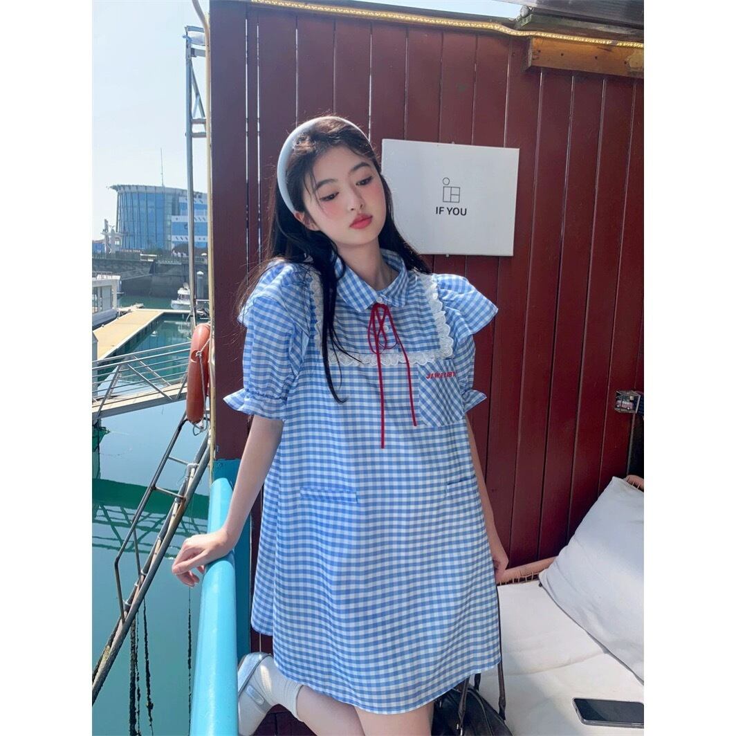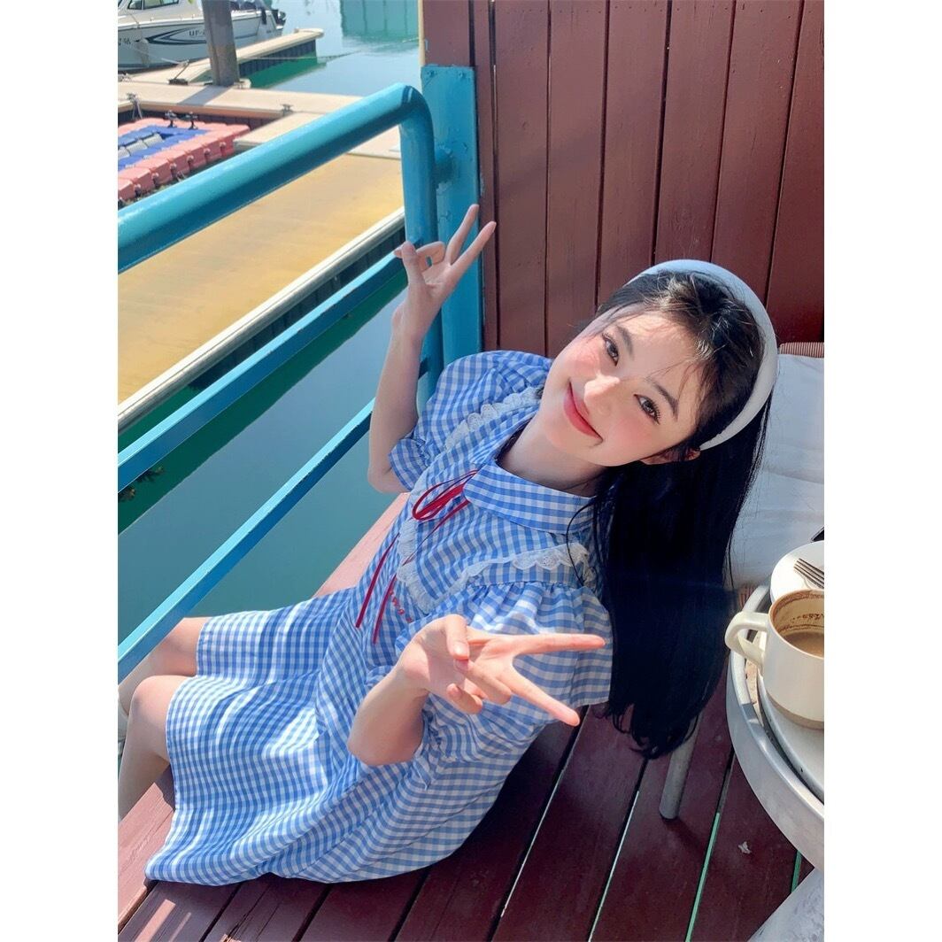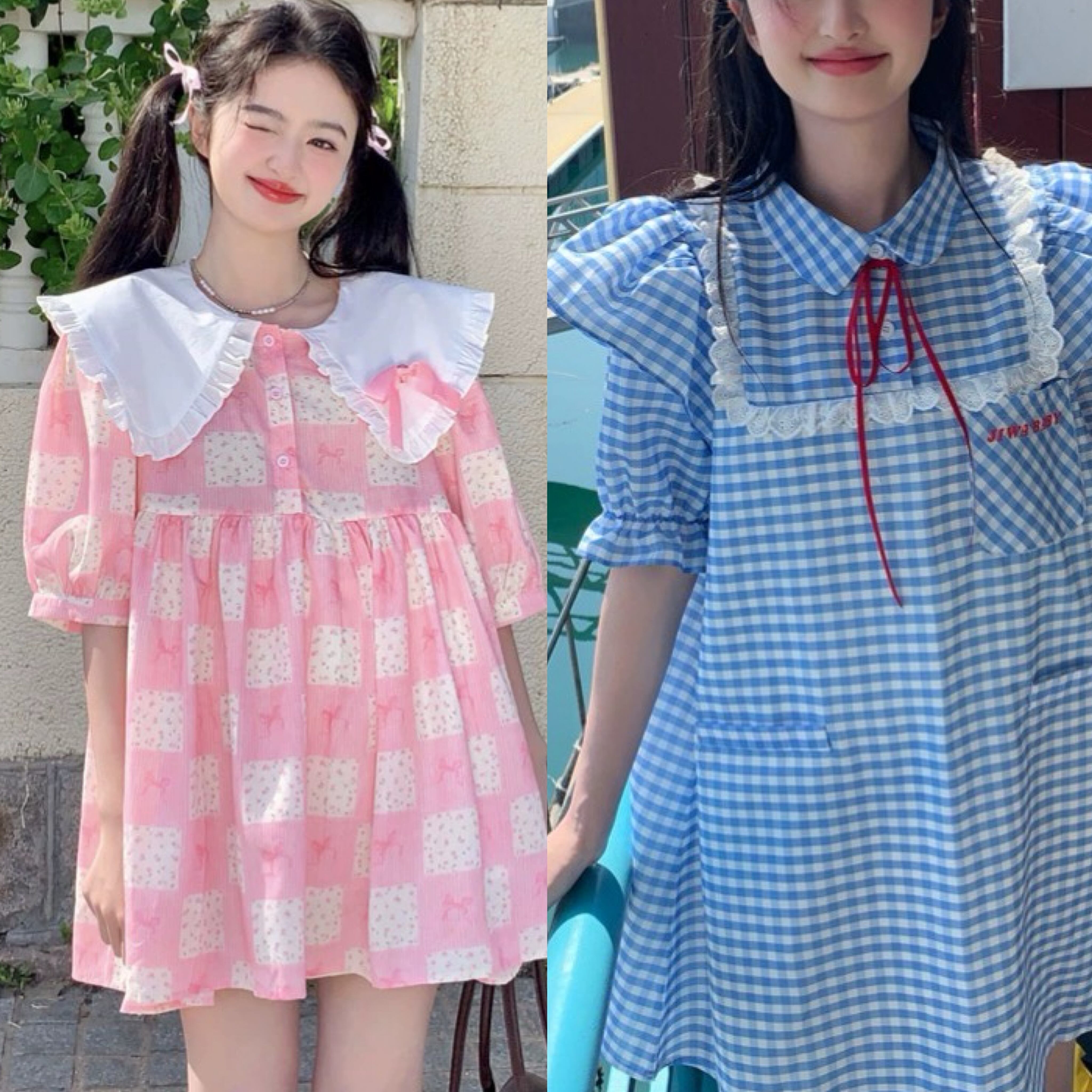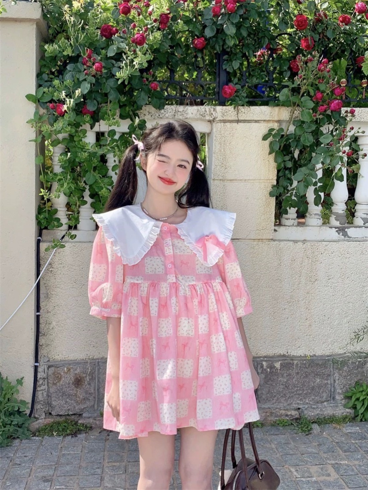 水色 チェック ピンク リボン 丸襟 ブラウス ワンピース