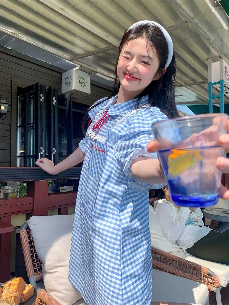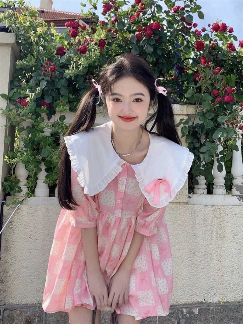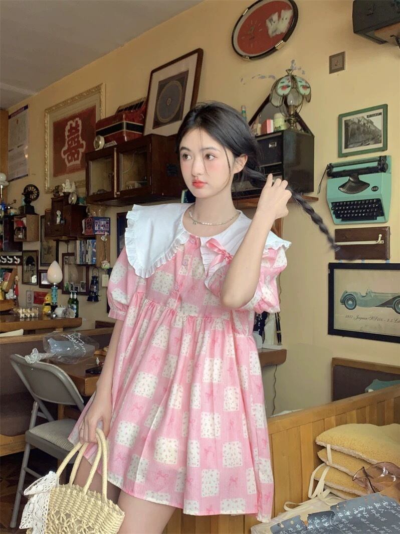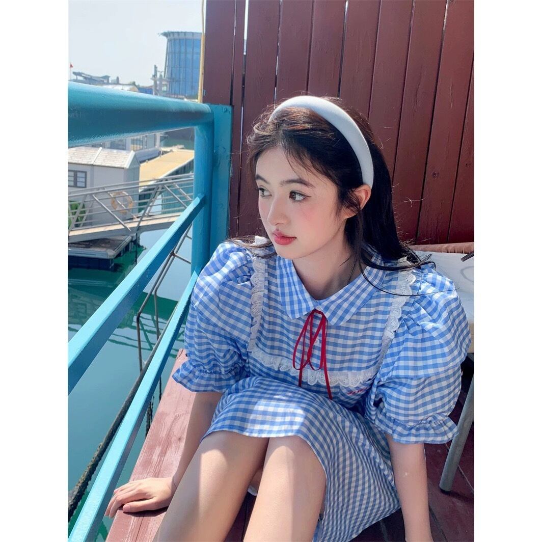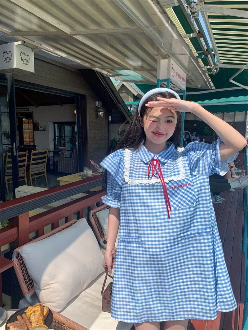 水色 チェック ピンク リボン 丸襟 ブラウス ワンピース