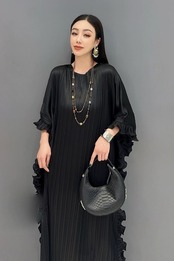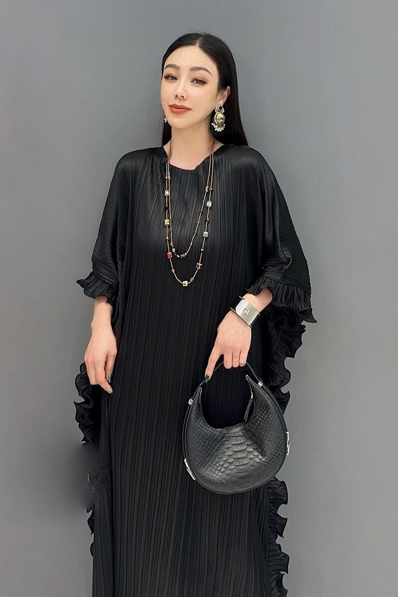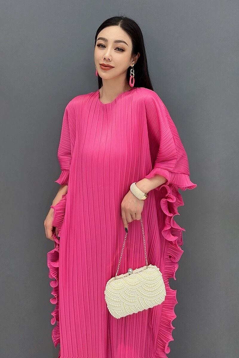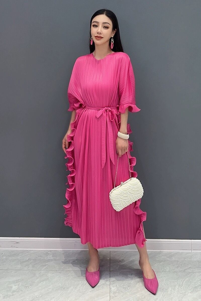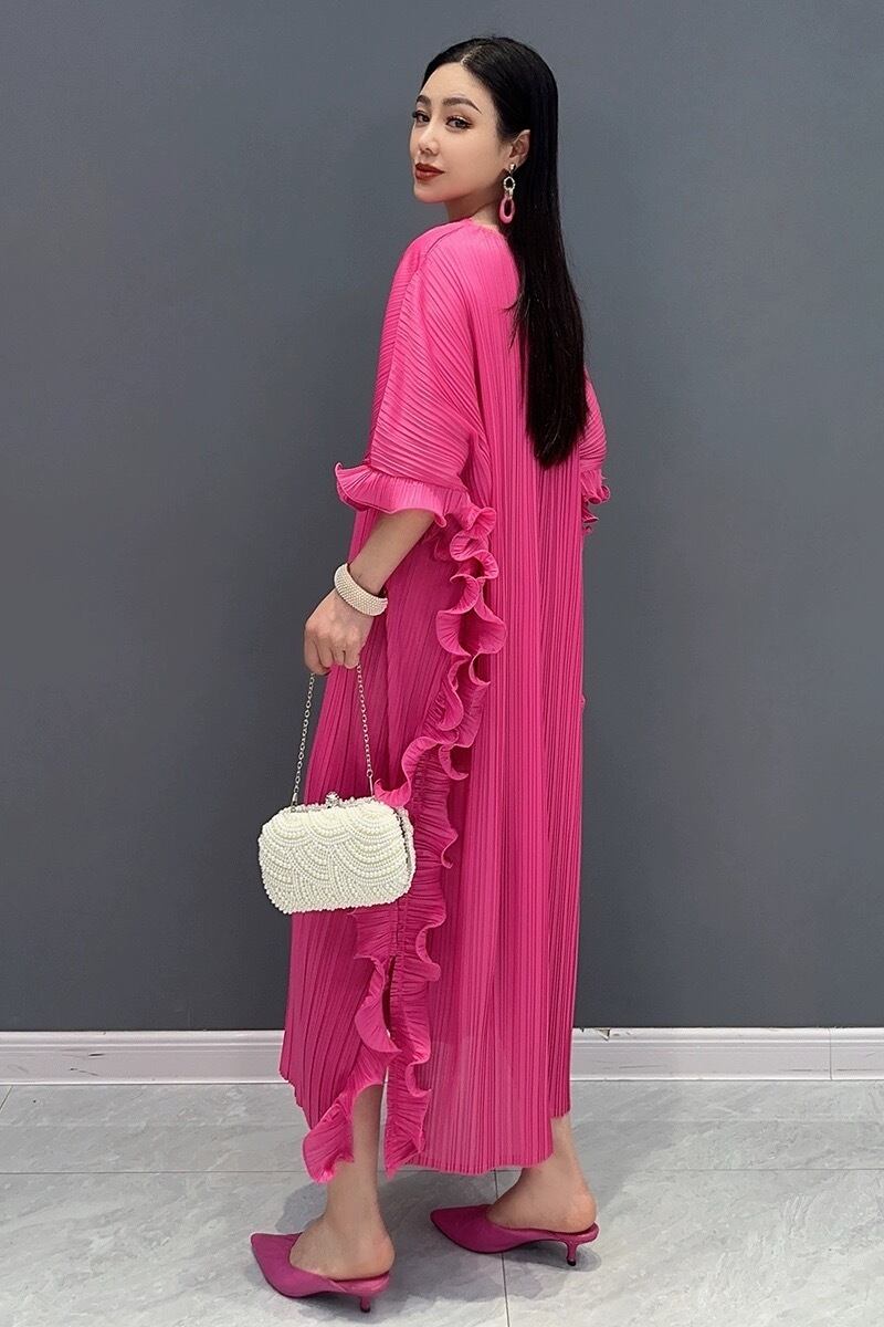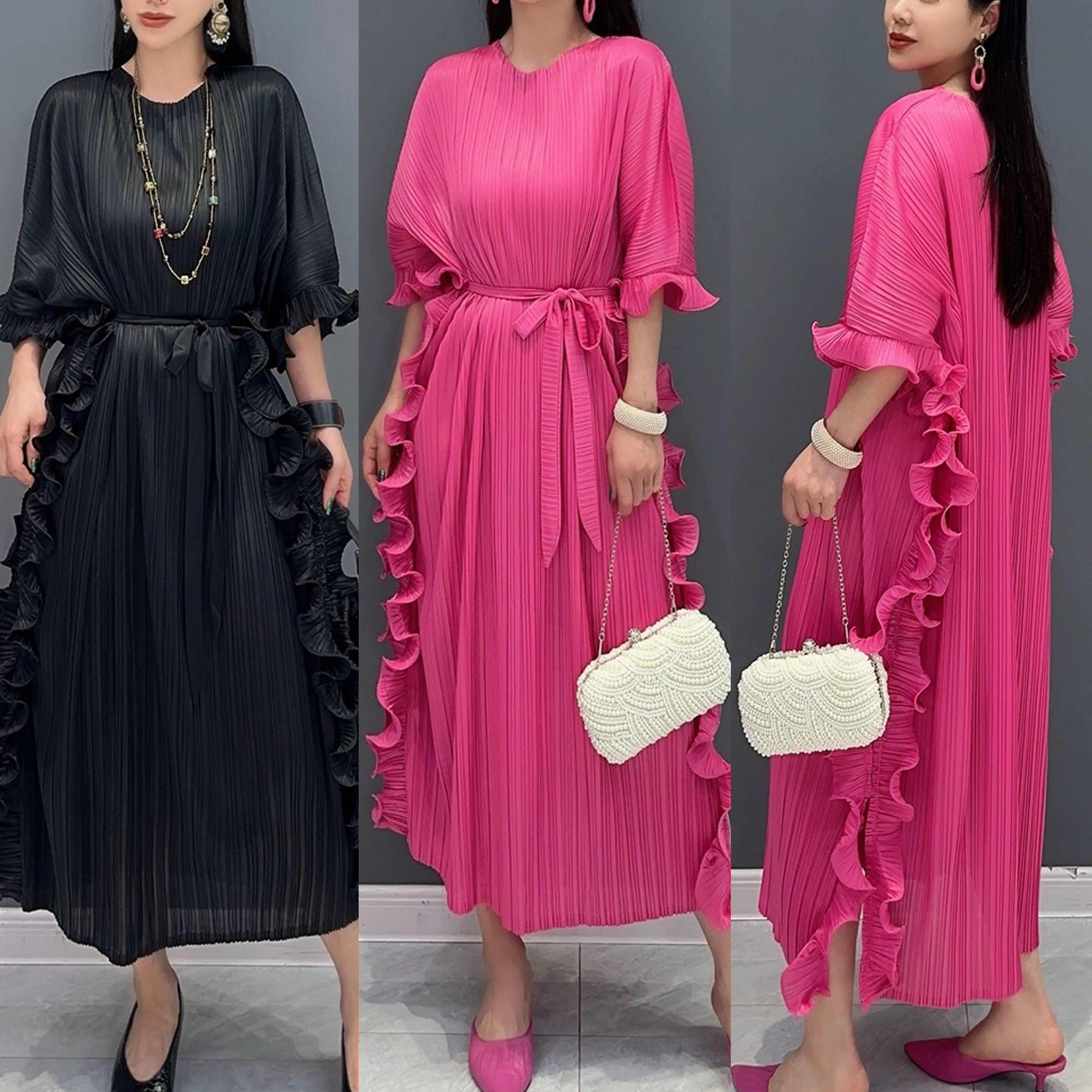 ピンク 黒 フリル プリーツ ワンピース エレガント ゆったり ワンピース