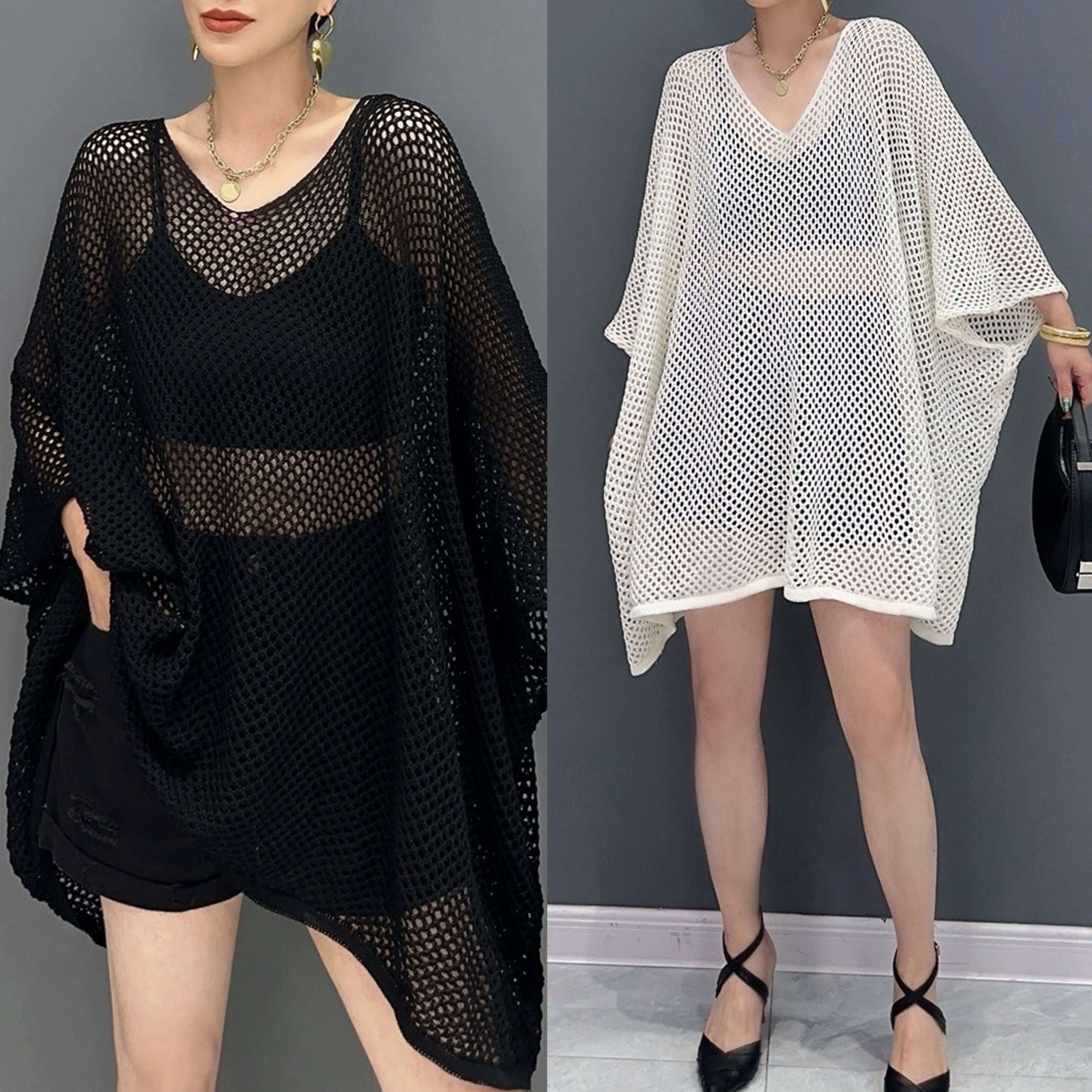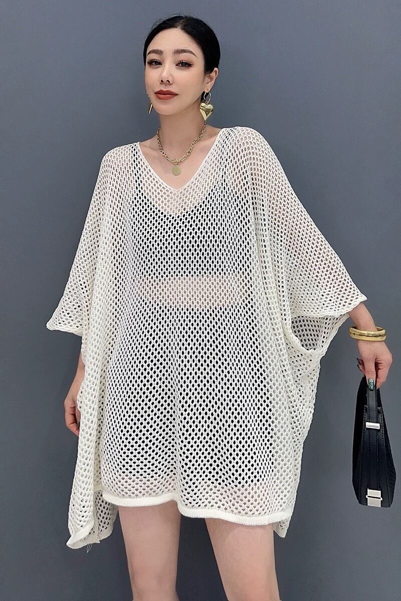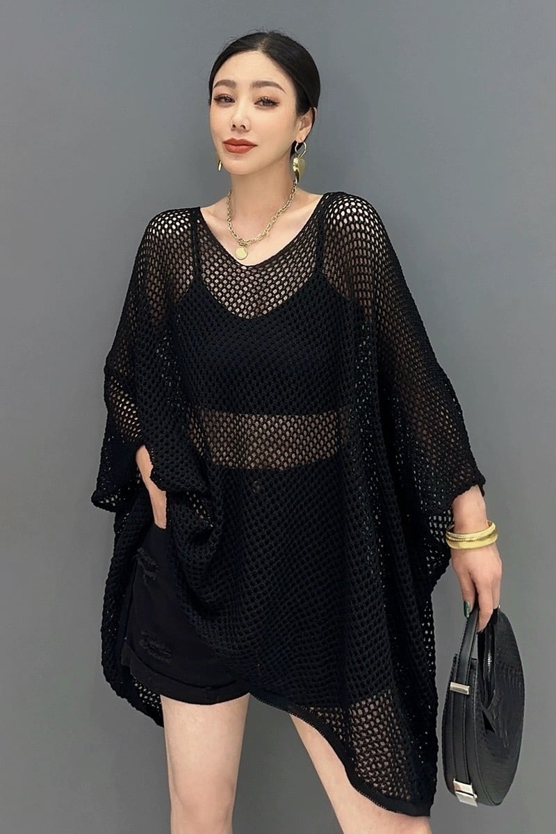 あみあみ メッシュ 黒 白 海 トップス ポンチョ カーディガン