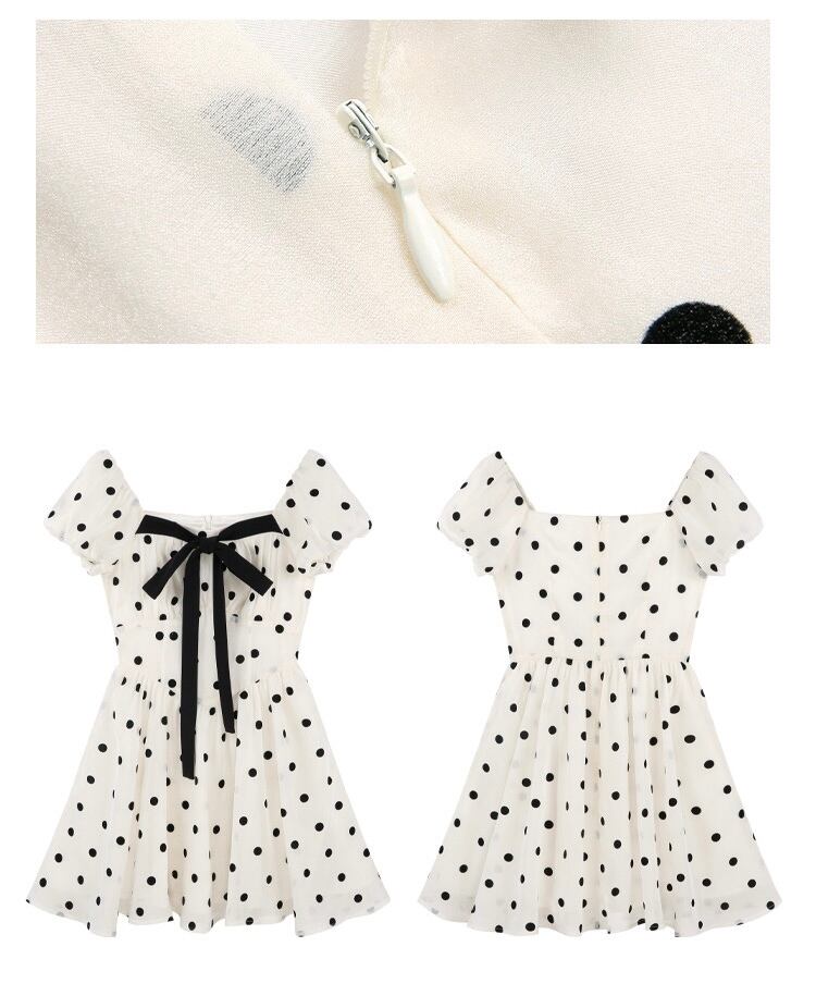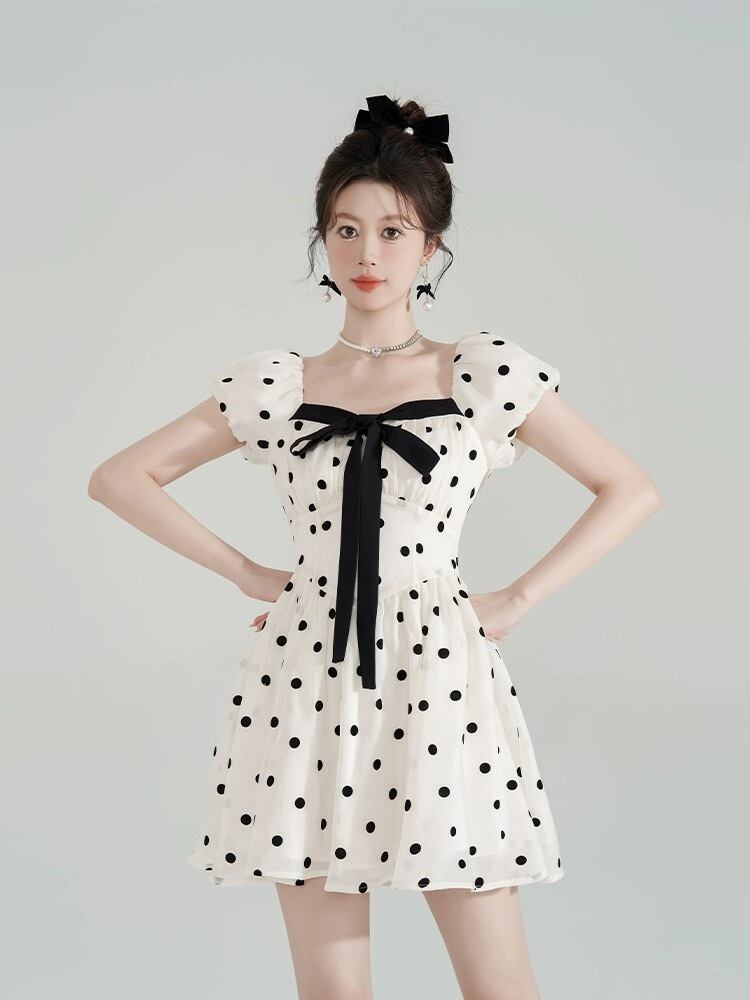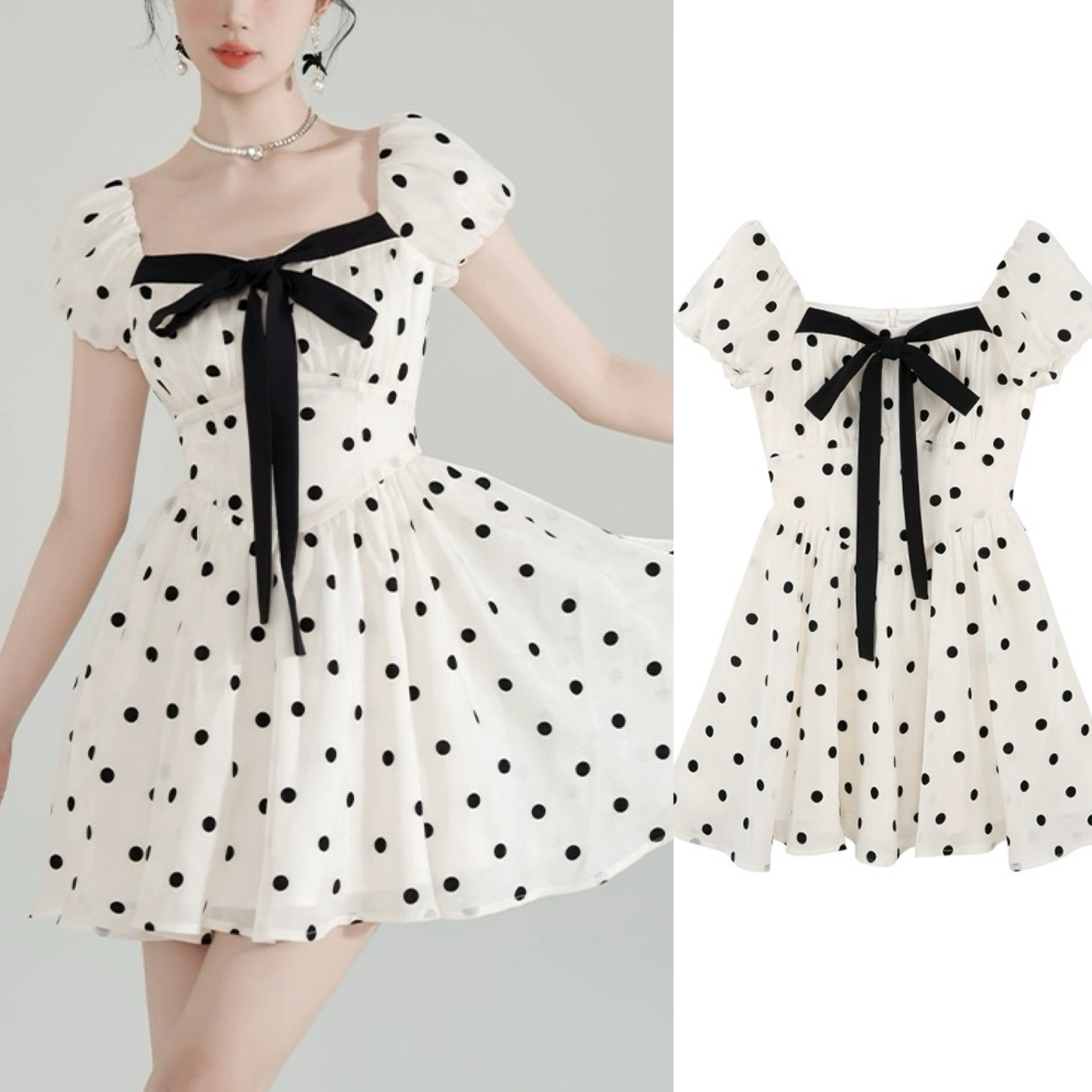 水玉 ドット 白 黒 ワンピース ガーリー 可愛い リボン