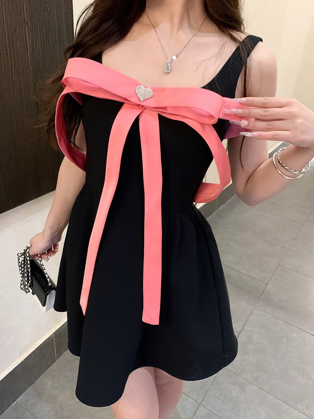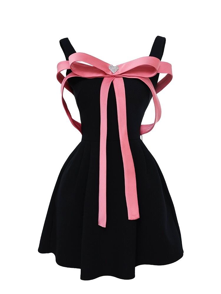 リボン ピンク ワンピース ガーリー 黒 ノースリーブ