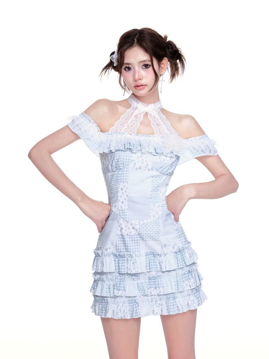 水色 ワンピース 花柄 フラワー ハイネック ガーリー かわいい