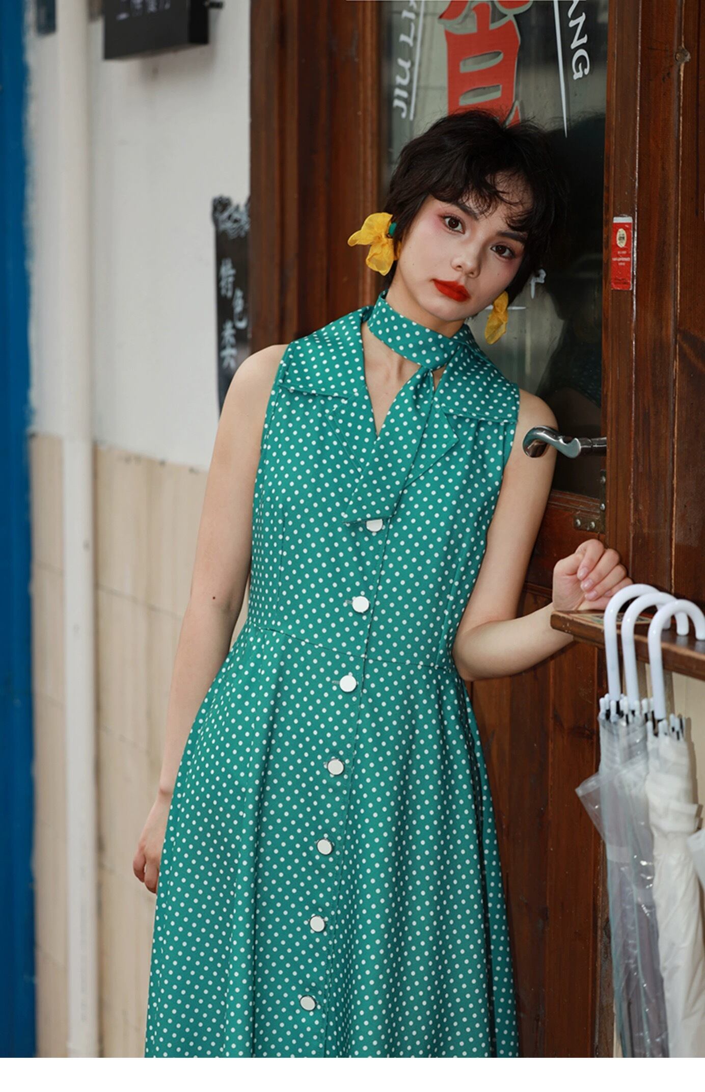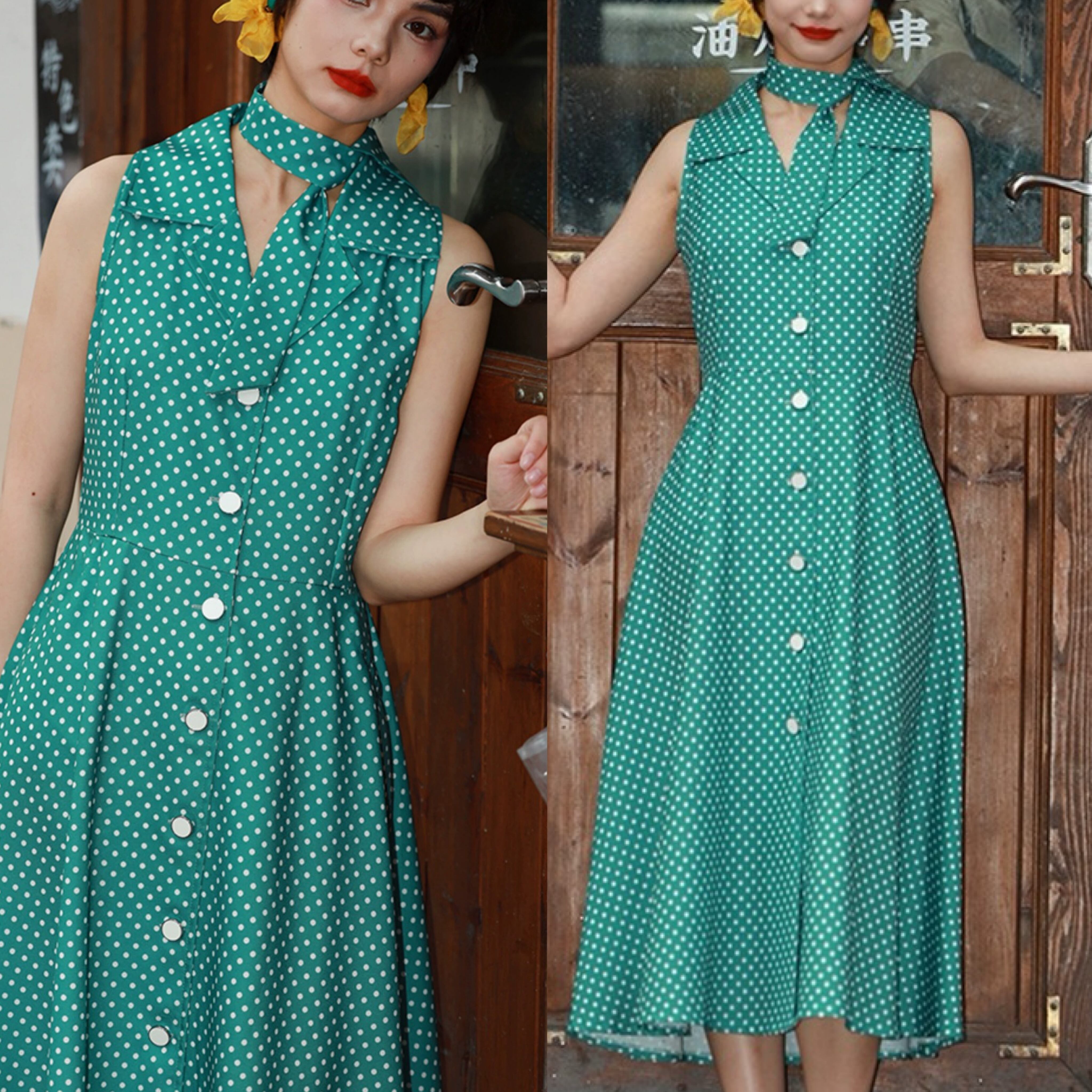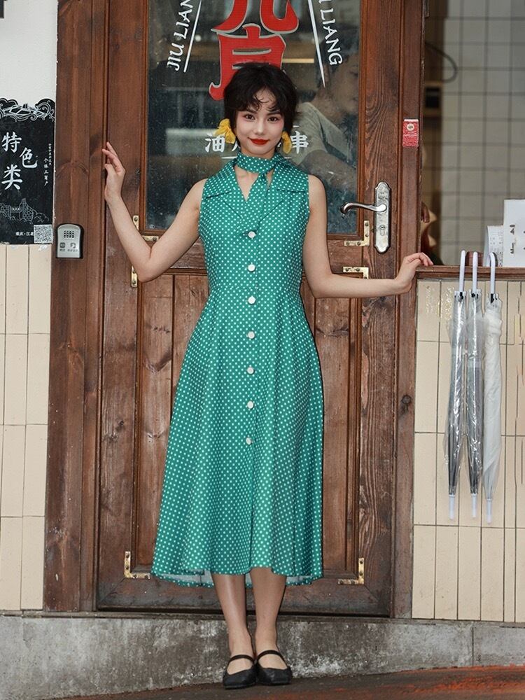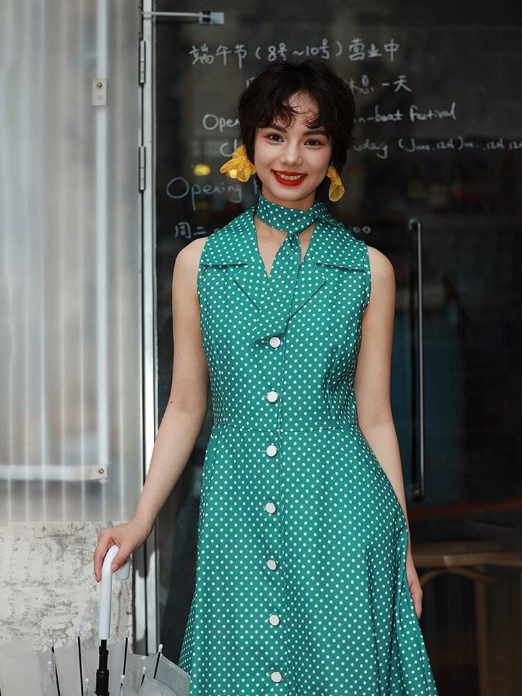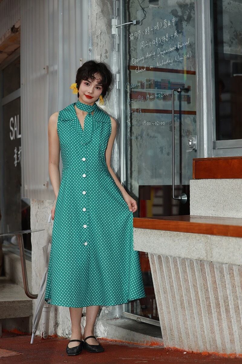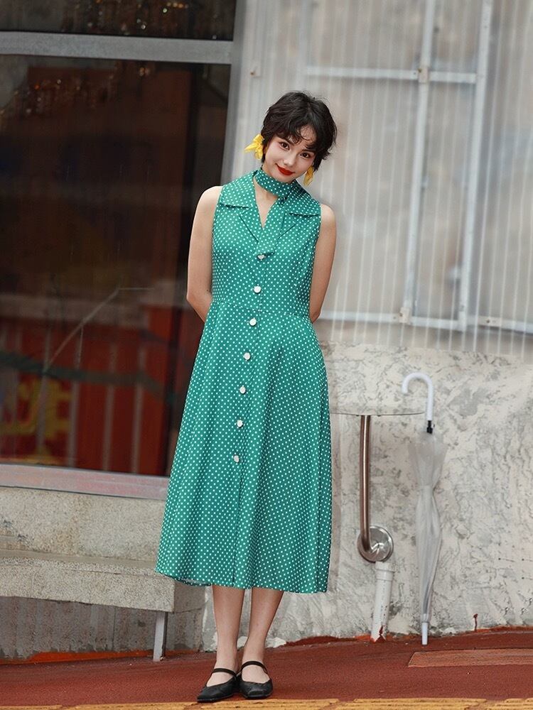 緑 水玉 ドット グリーン クラシック ガーリー レトロ 丸襟 ブラウス ワンピース 原宿 80年代 アイドル 古着 昭和 ブラウス ワンピース